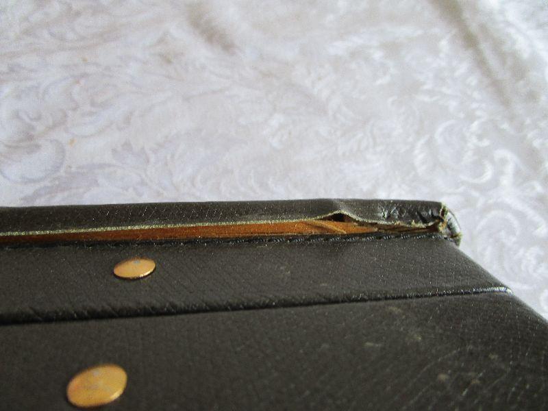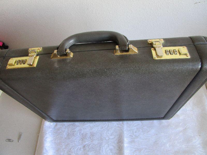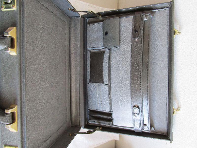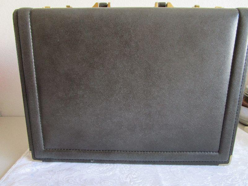 Could be leather, not sure; Very nice interior, has metal feet on the bottom. 17"x12"x3". Combination is known.
