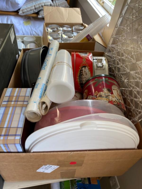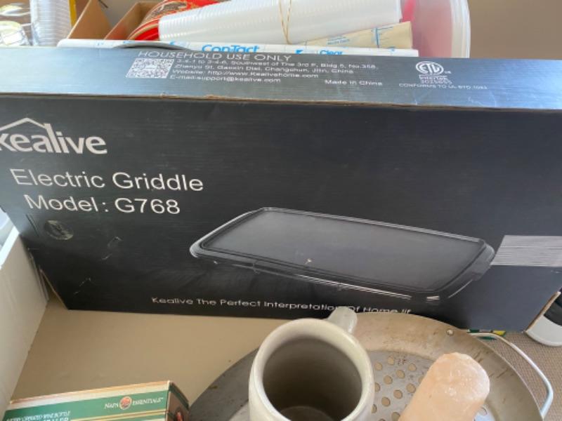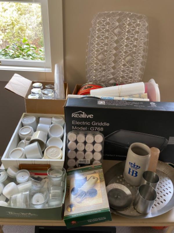 Miscellaneous kitchenware, griddle, tins, vacuum sealer, glassware, etc.