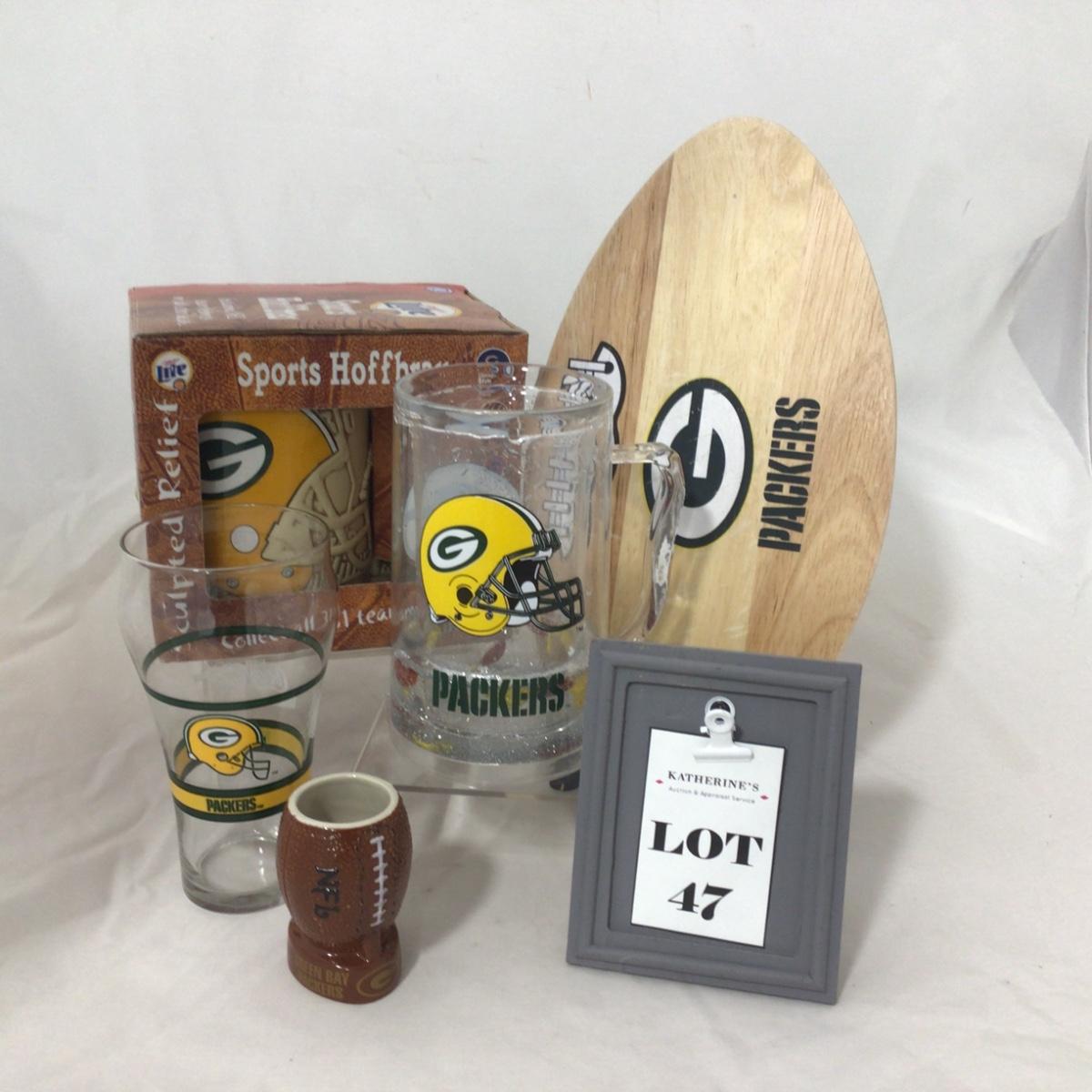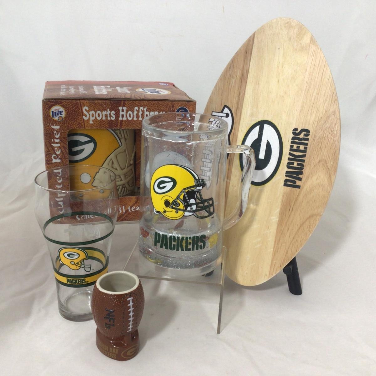 Packers Collector group of packers wood cutting board, stein in box, plastic mug, glass and shot glass. Please see photos for details and condition. ::: Shipping is available on this lot. If you require shipping you must let us know at the close of the auction. We will coordinate with you after the item has been won. Shipping fees will include insurance up to or exceeding the value of all items being mailed. If you have any questions regarding this lot please contact the auctioneer either via this website, by direct email or by phone. PICK UP TIMES and other important information can be found in the TERMS and DESCRIPTION of the auction. Please take a look for pertinent information. Thanks!