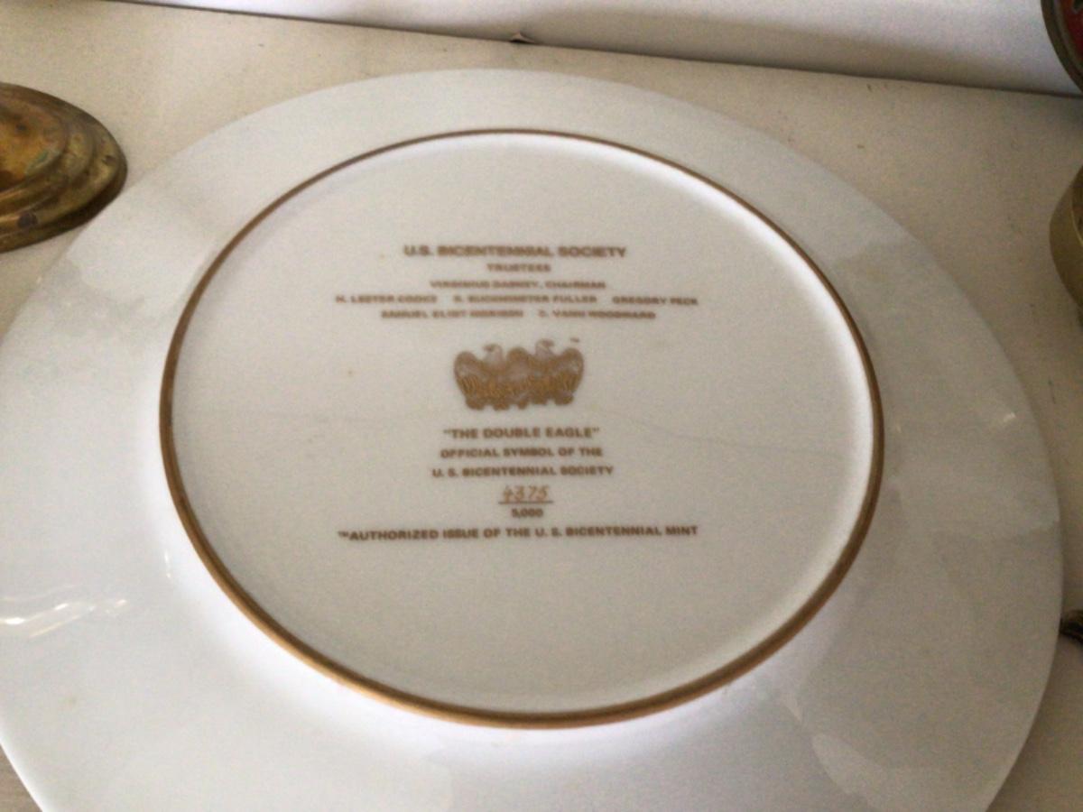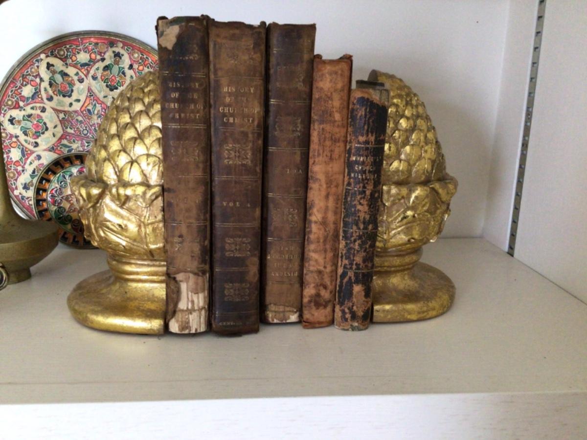 Lot of brass decor with acorn bookends and five antique books, brass candlesticks, collectors bicentennial plate
