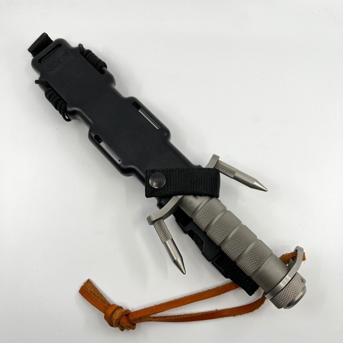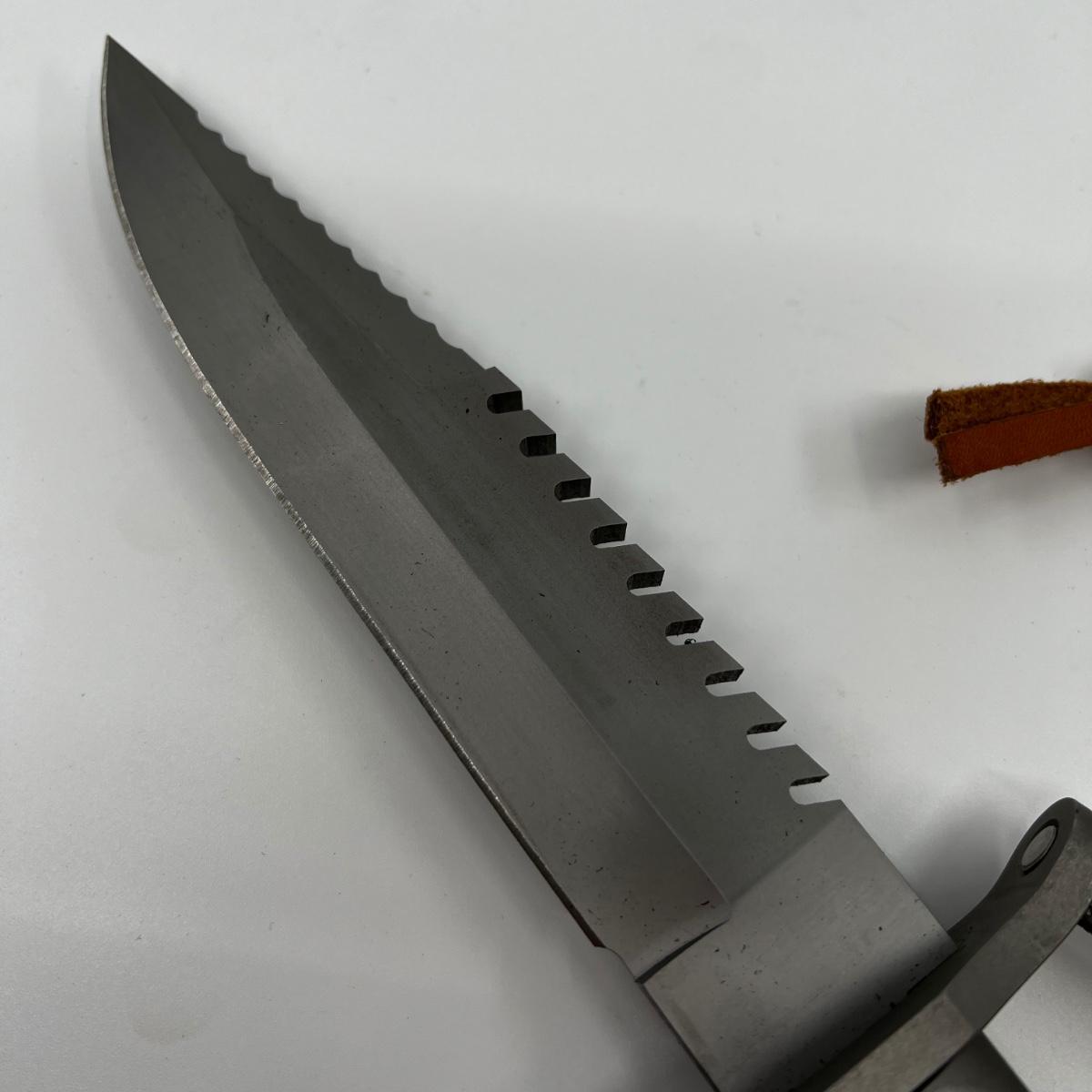 Blade is forged with 425 Mod Steel, has a serrated back blade, with fiberglass reinforced plastic sheath.