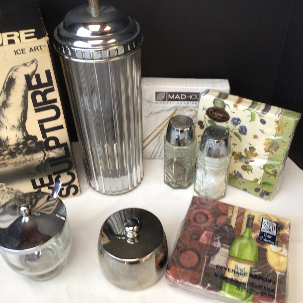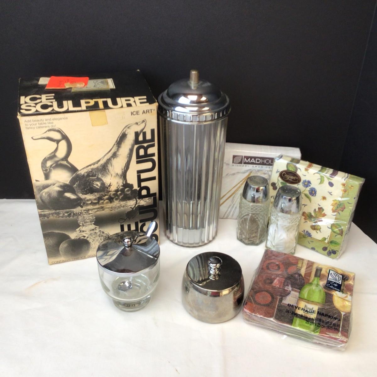 Ice Sculpture is a swan, straw organizer, sugar dishes, new napkins.