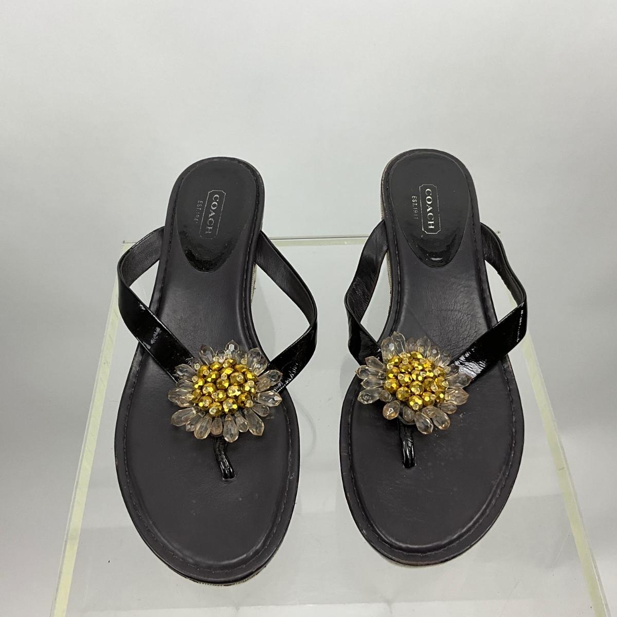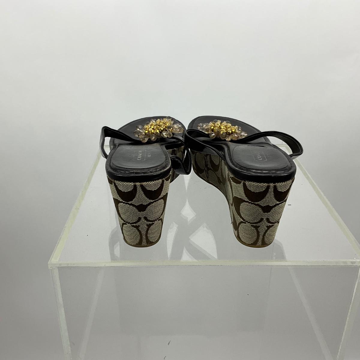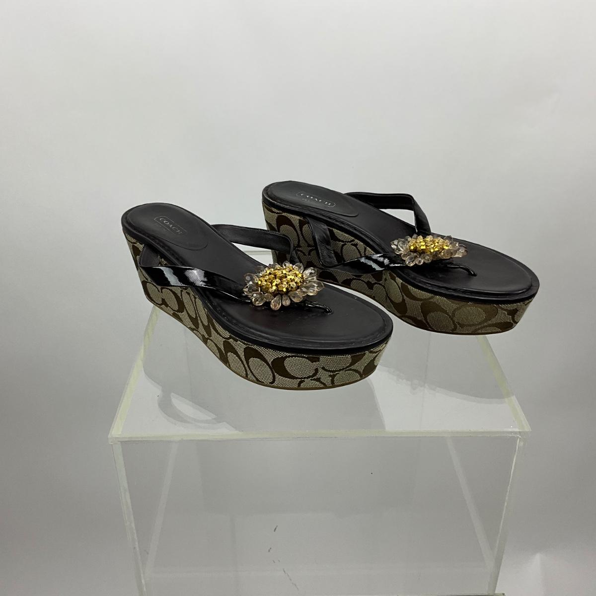 Shoes have a flower at the toe with beaded embellishment, signature "C" pattern, size 8.