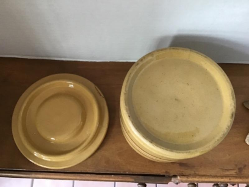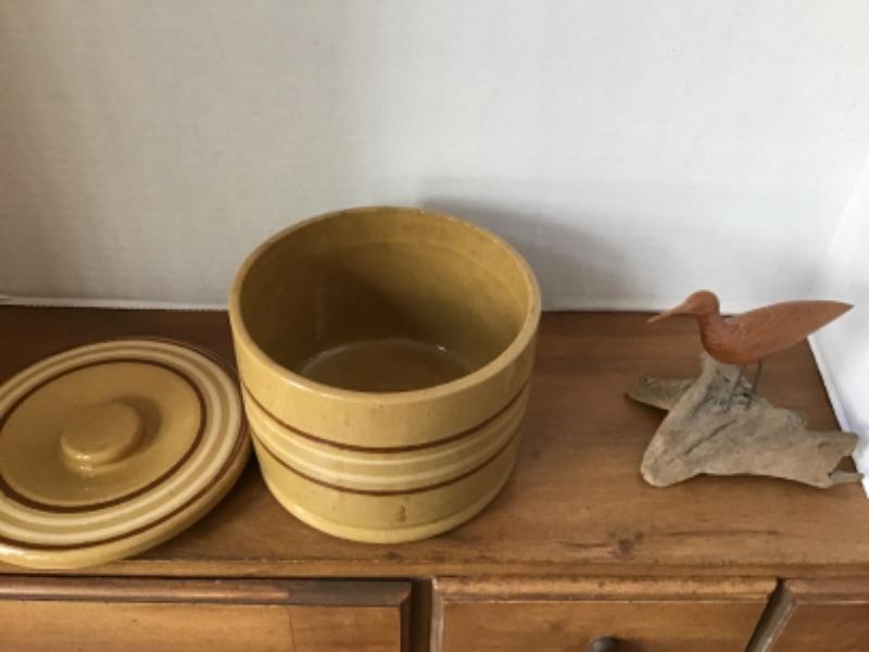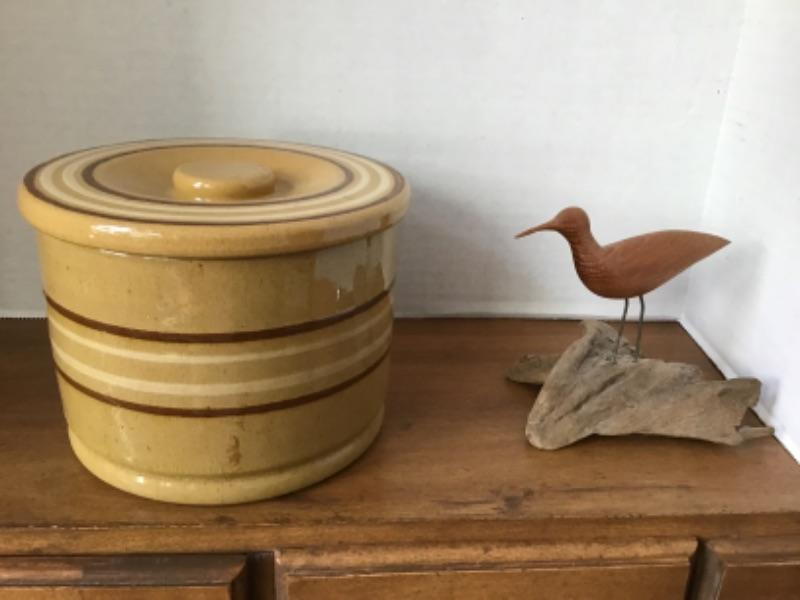 477: Antique Butter Crock with Signed Sand Piper Bird Carving