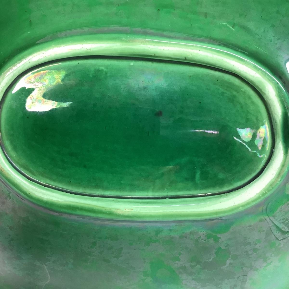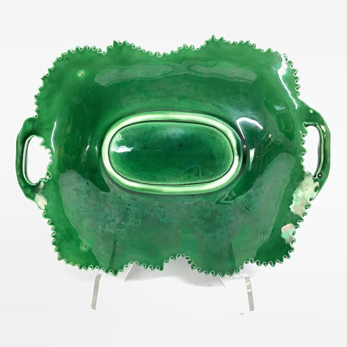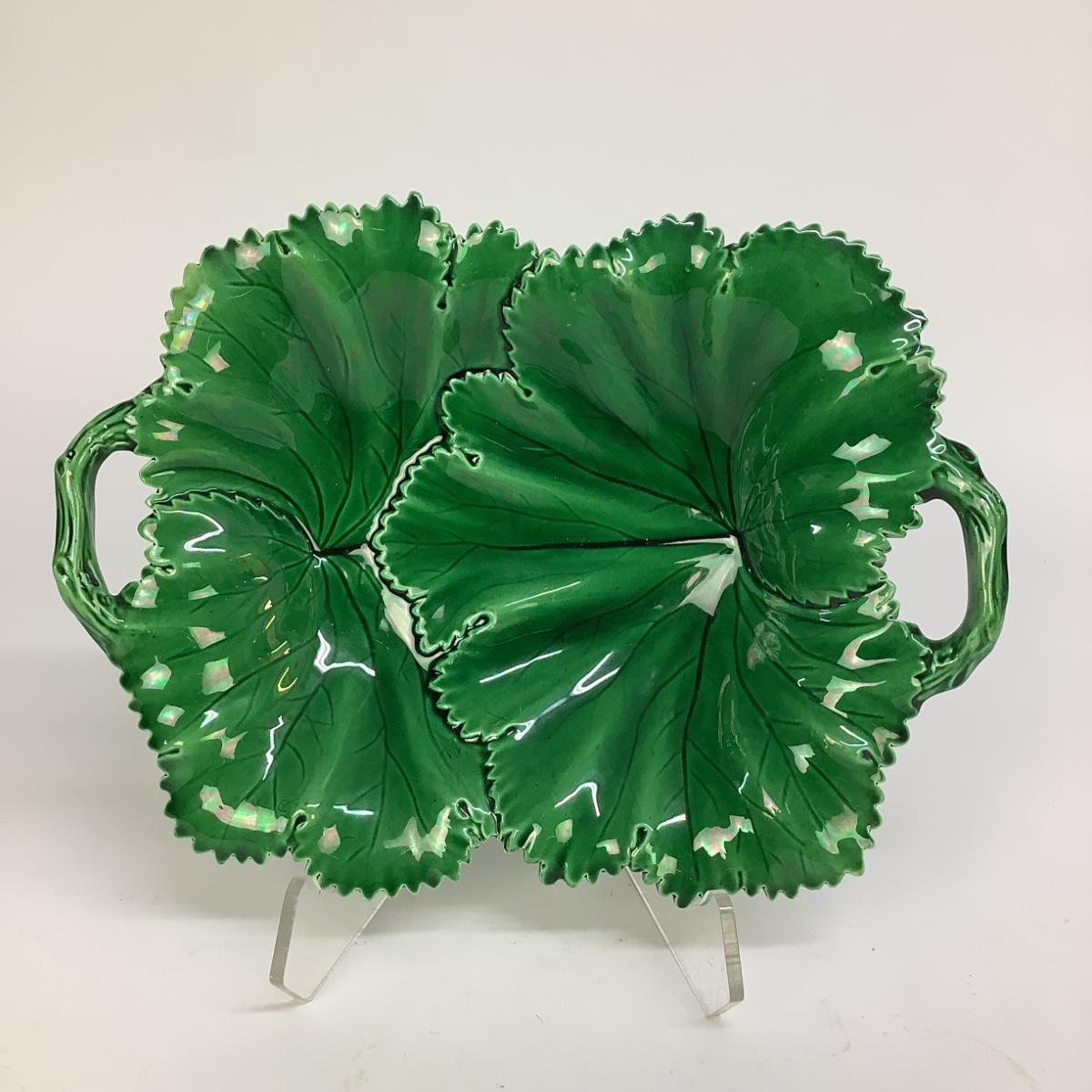 Green Glaze overlapping leaves 2 handle platter measuring 12"W x 8.5"D