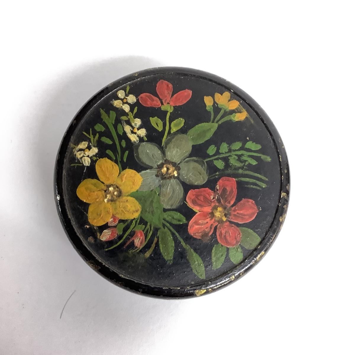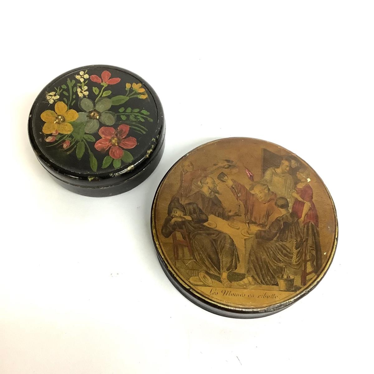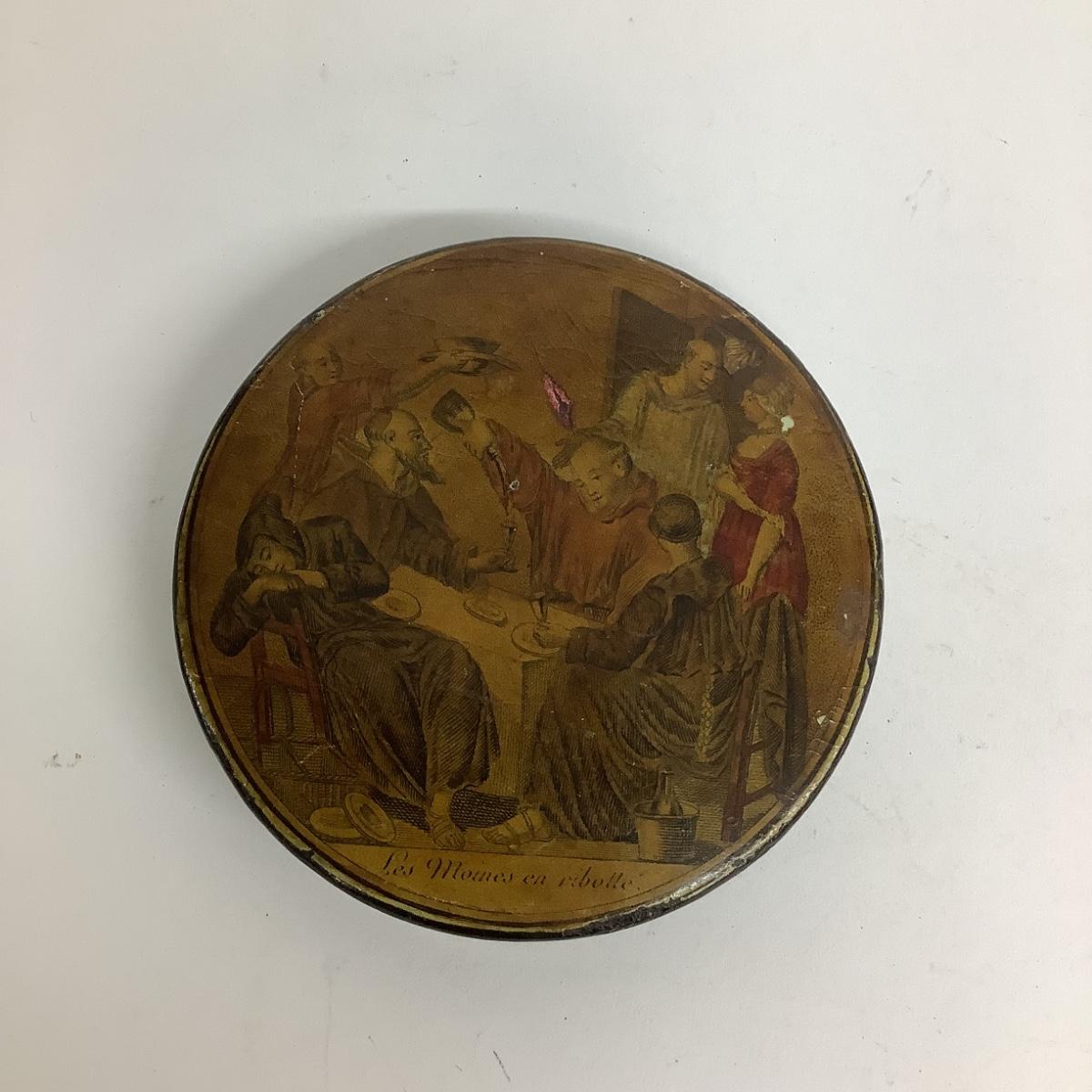 Paper mache snuff box titled "The Rebellious Monks measures 3.35"diameter and the hand-painted tin box measures 2.75"diameter.