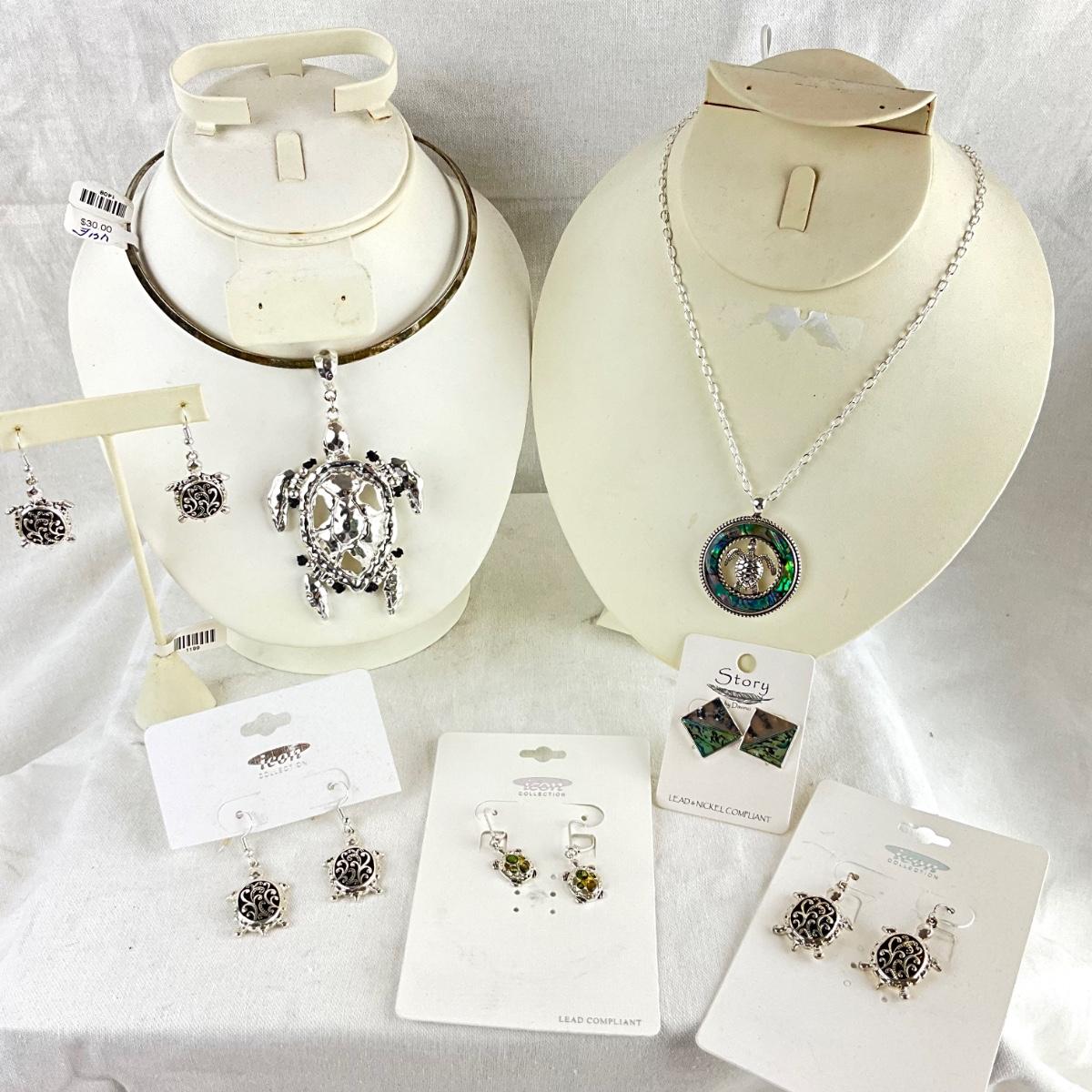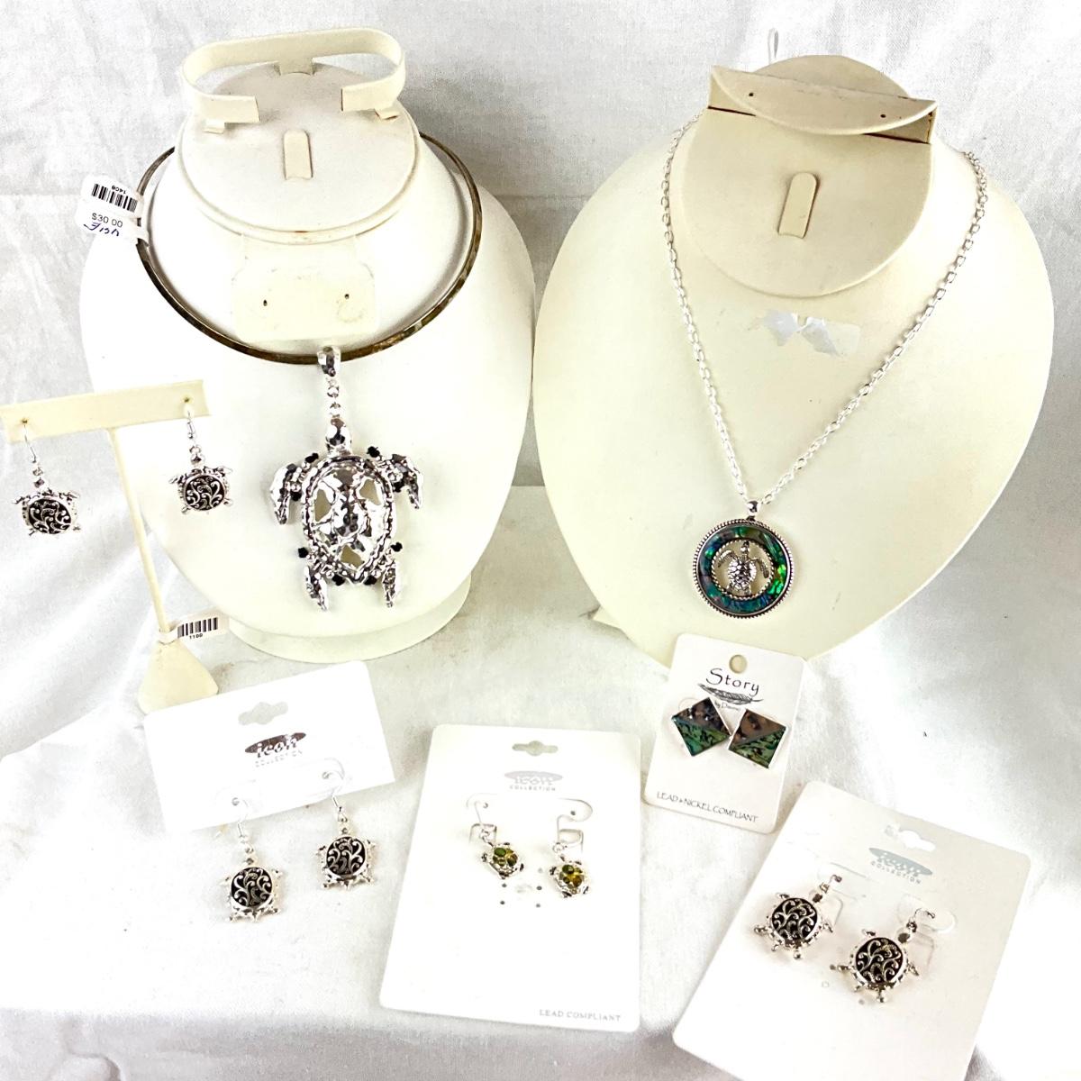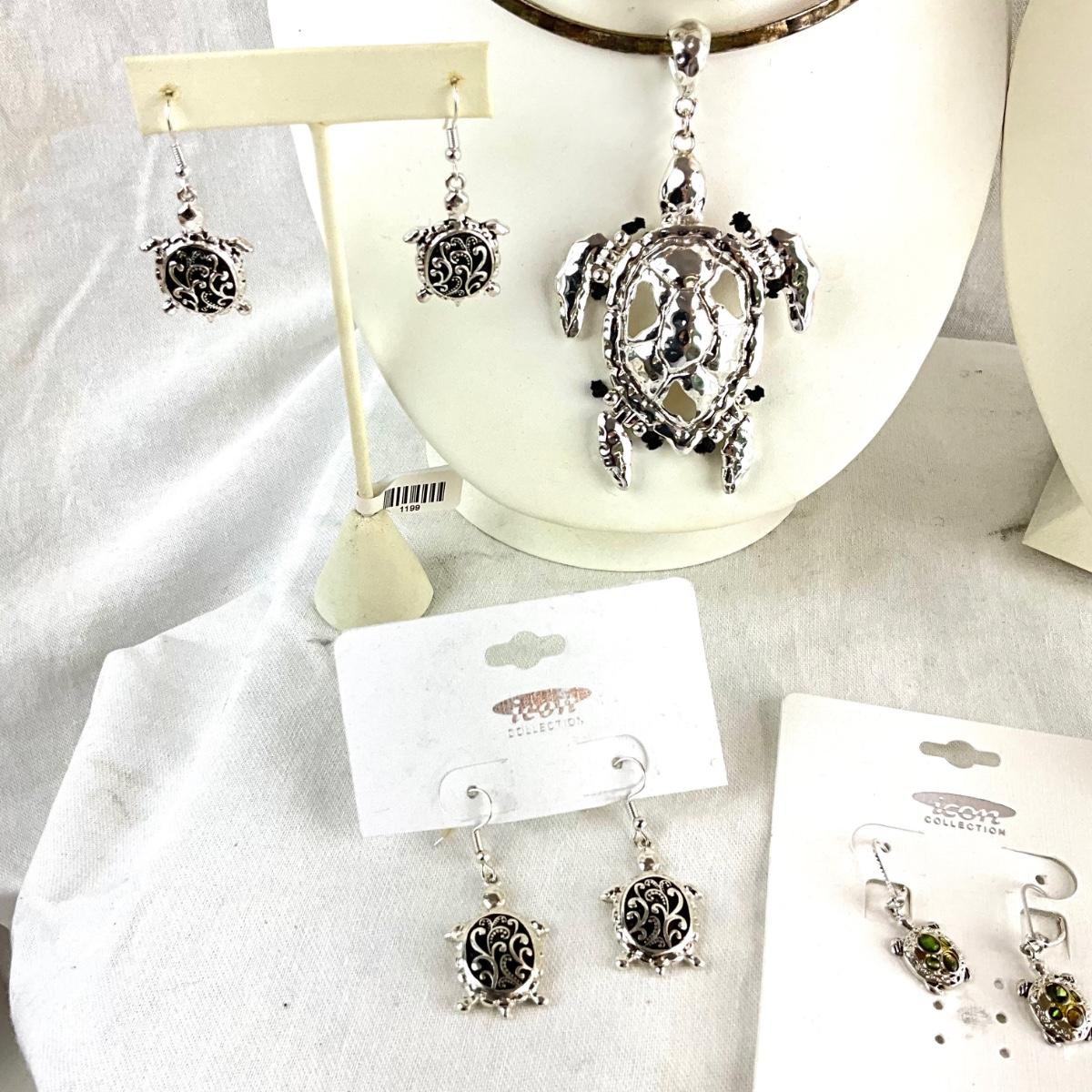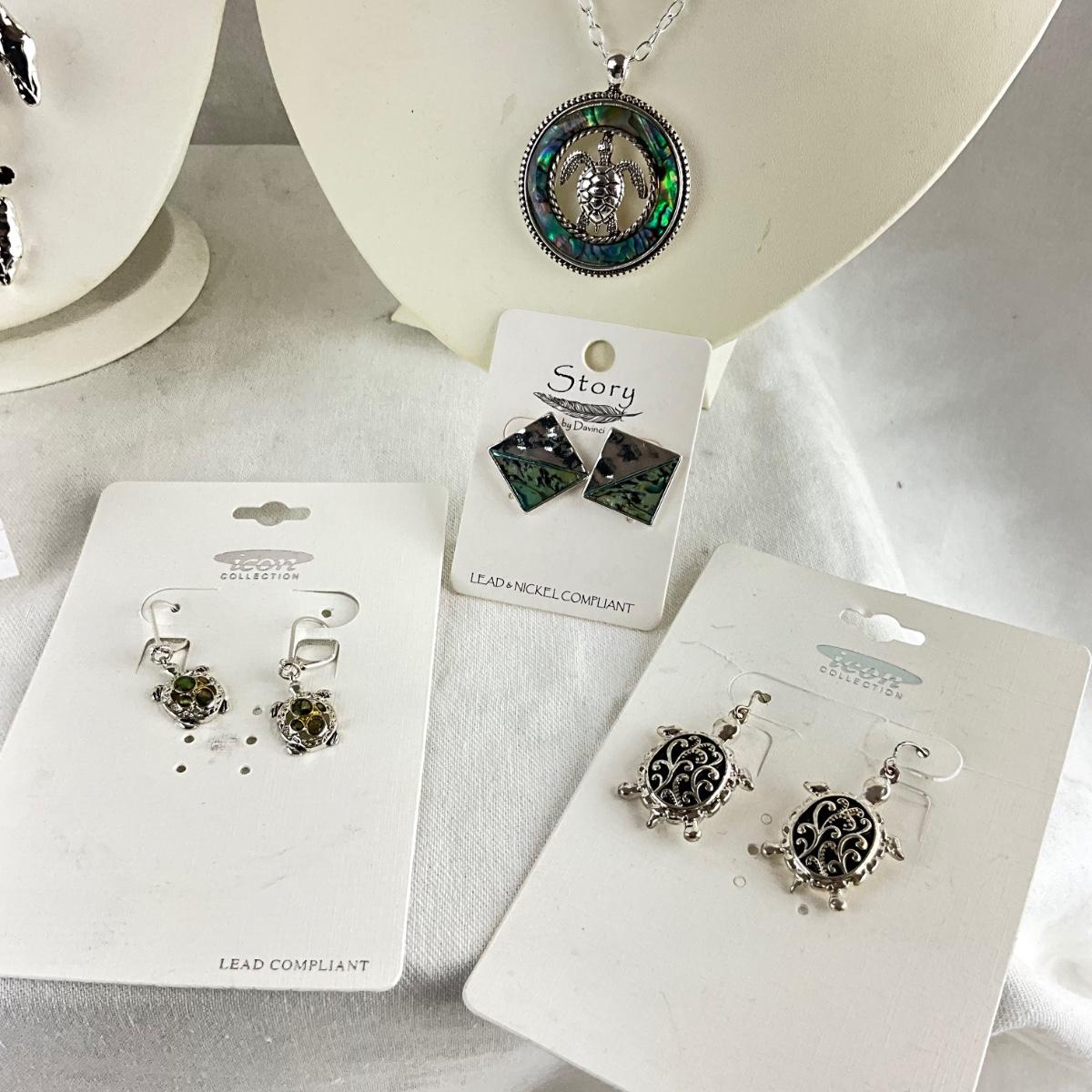 Large silvertone slide with choker, turtle abalone pendant, with silver tone turtle earrings