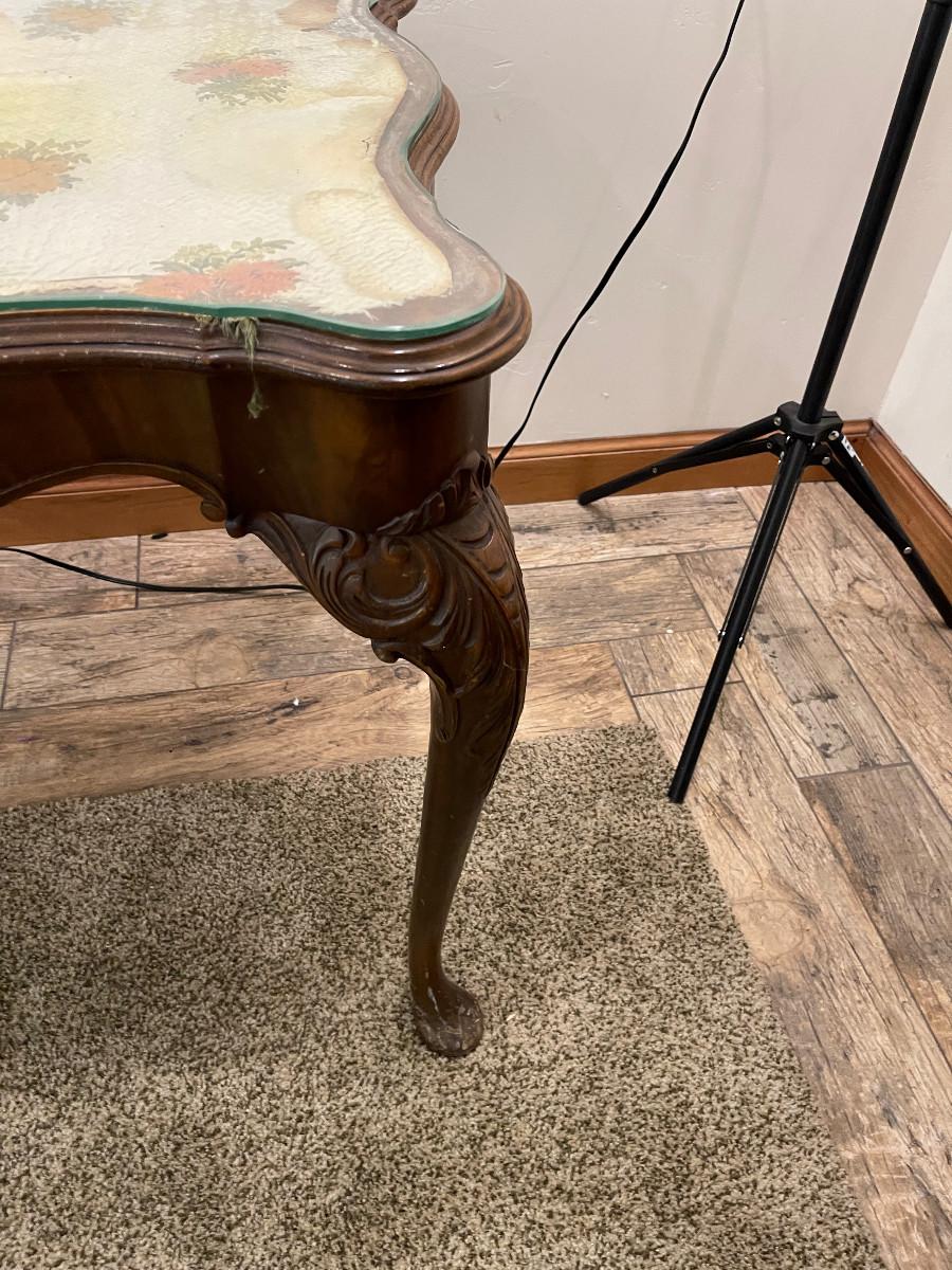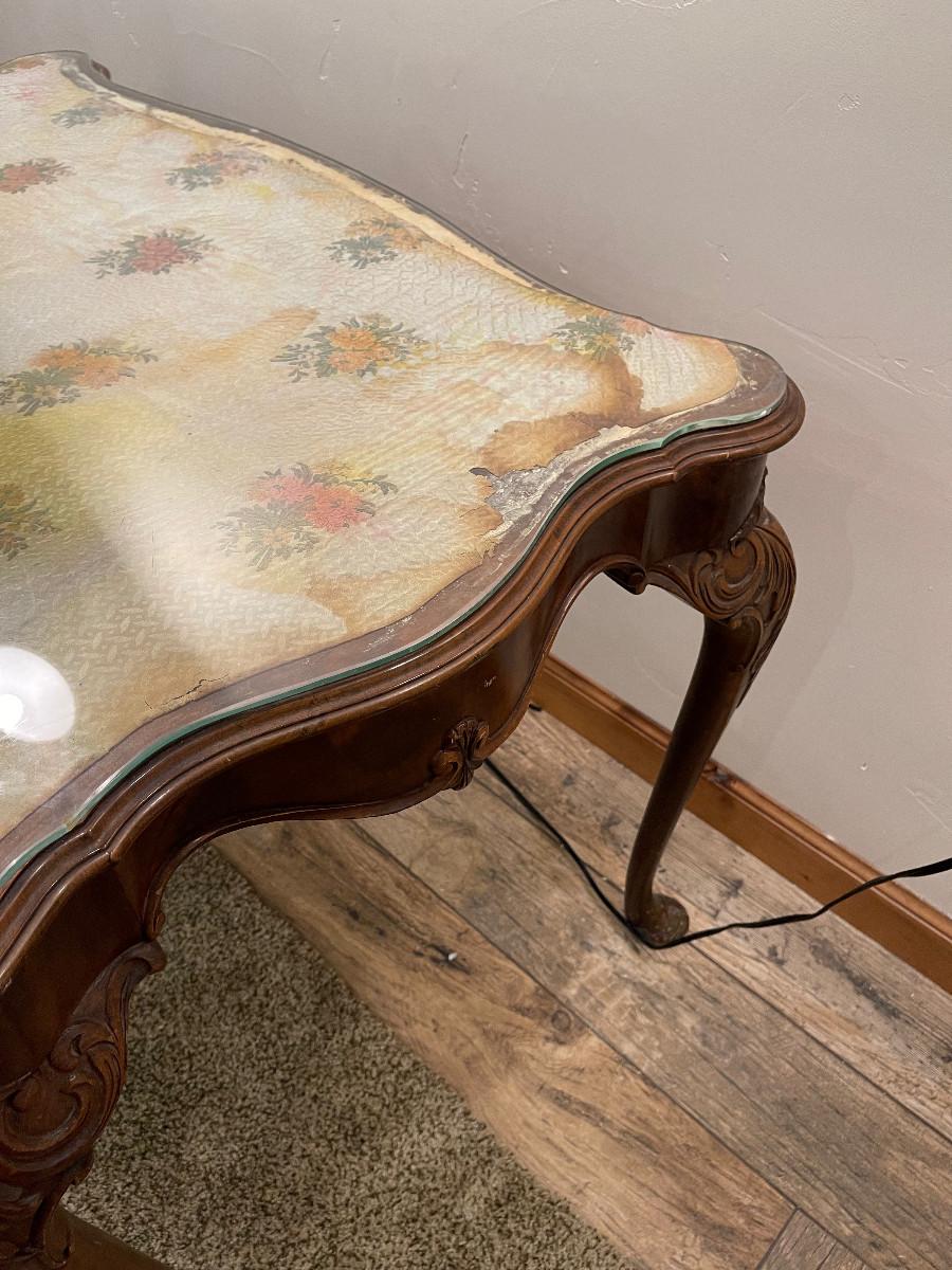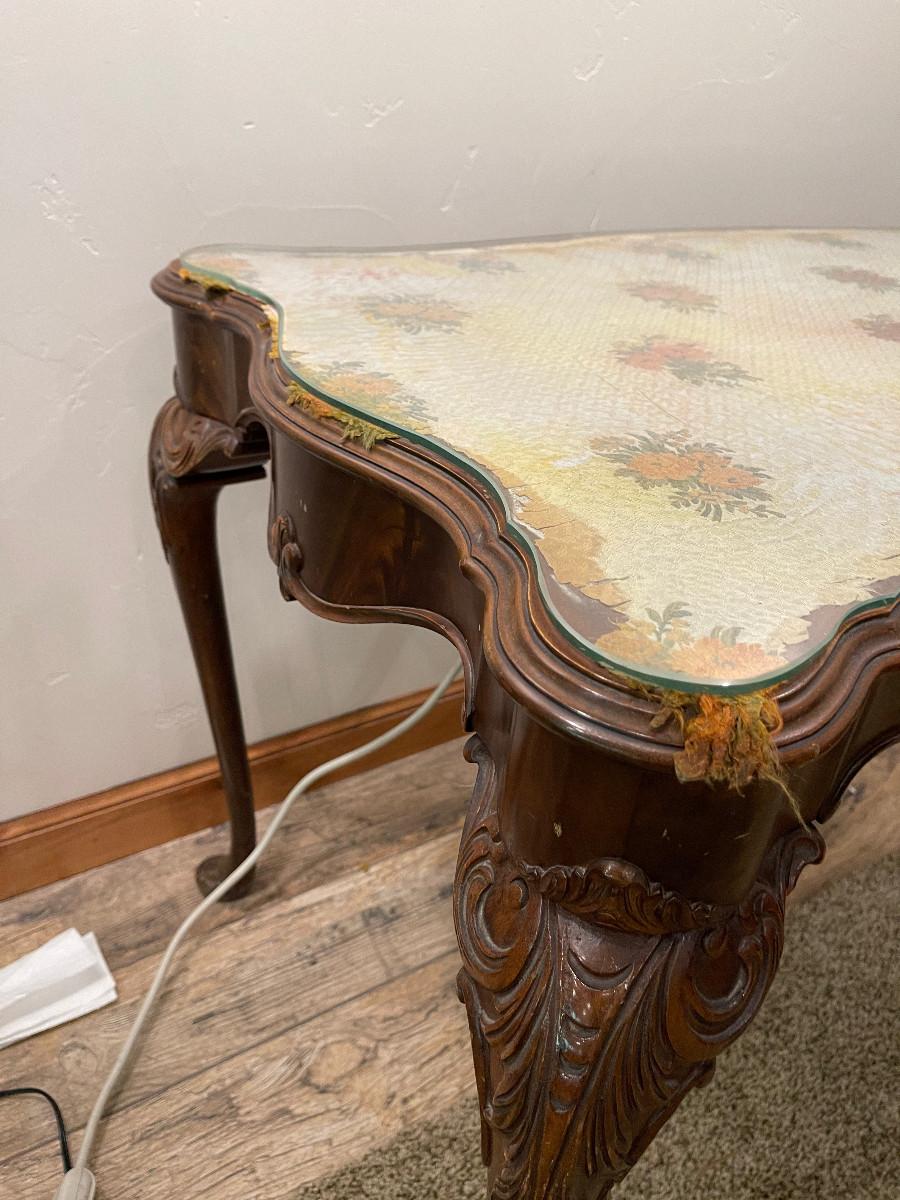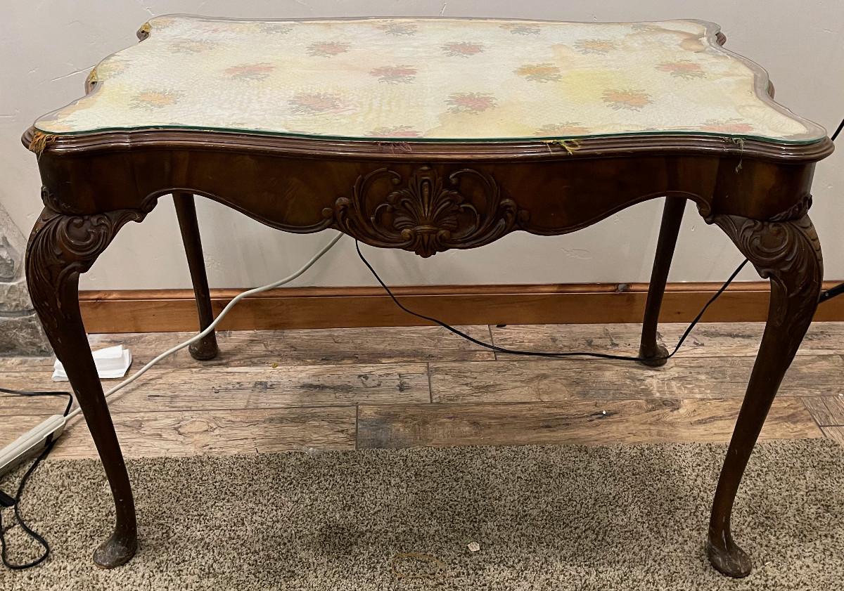 41 x 26 x 29 With Custom Cut Glass Top. Had a piece of Fabric Is stuck to but would strip off Possibly Flame Mahogany Finish on top.