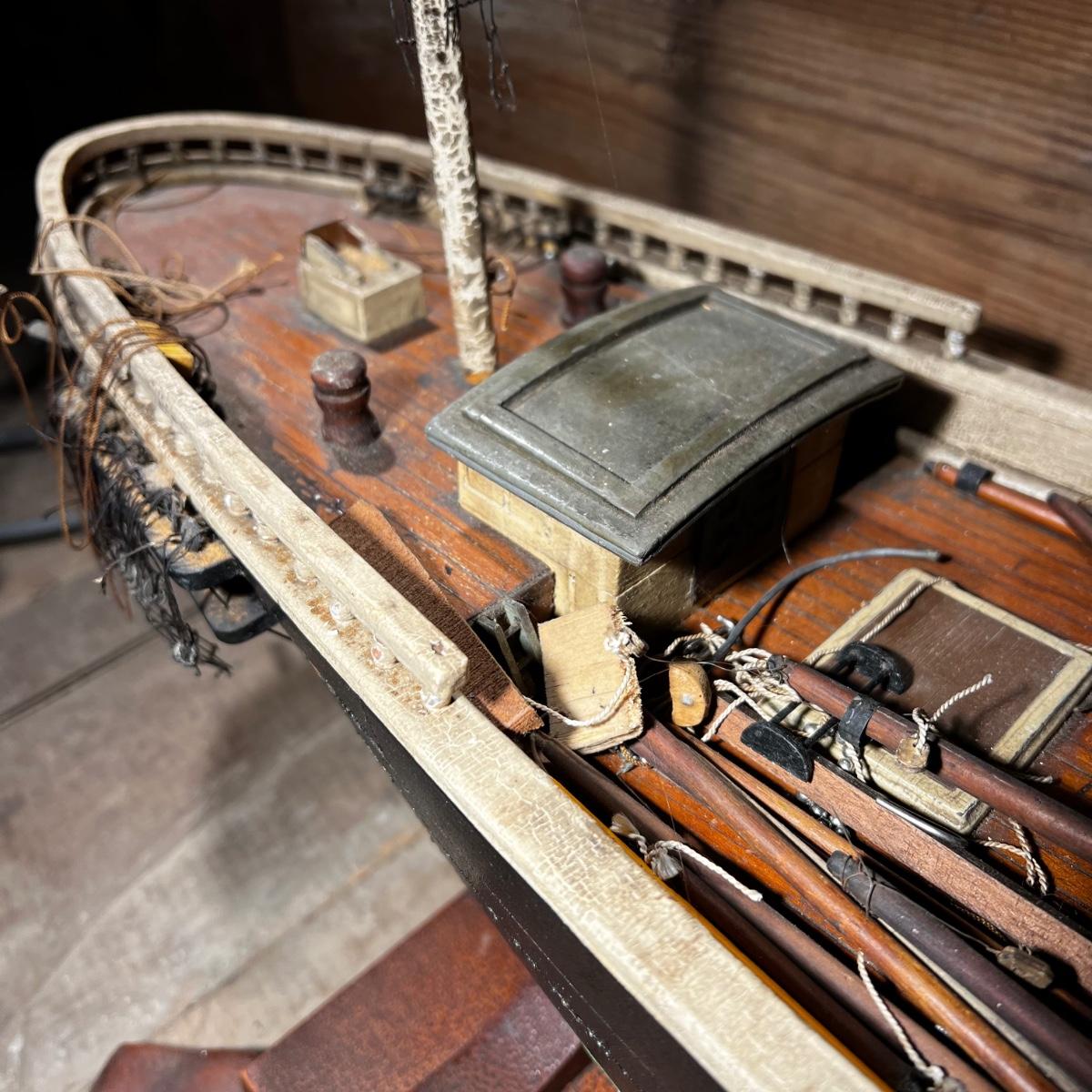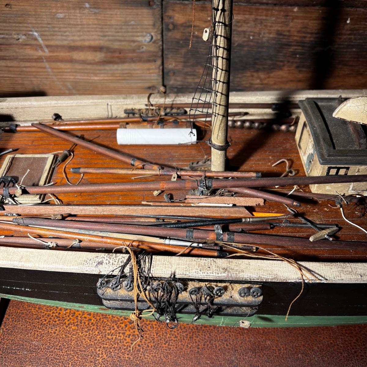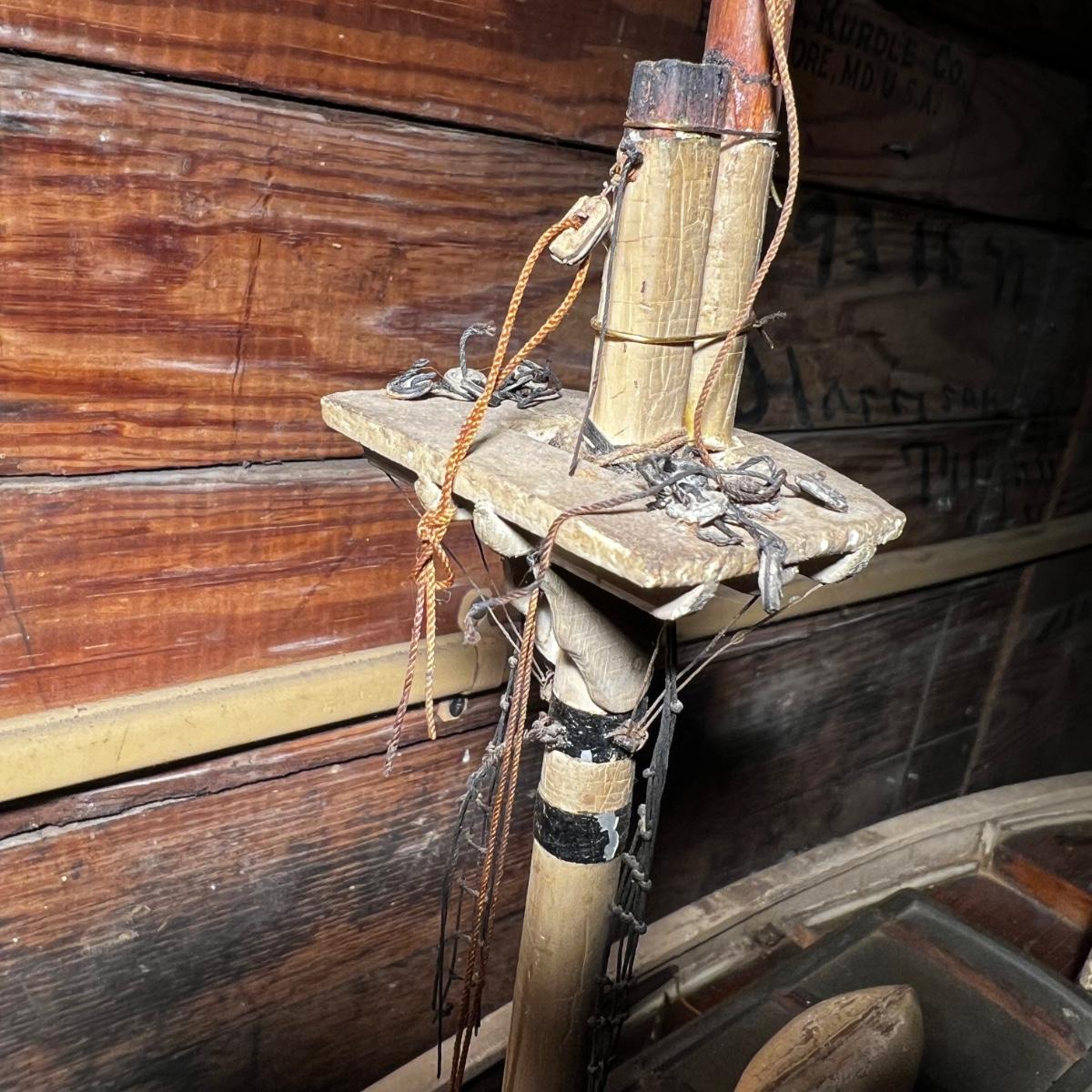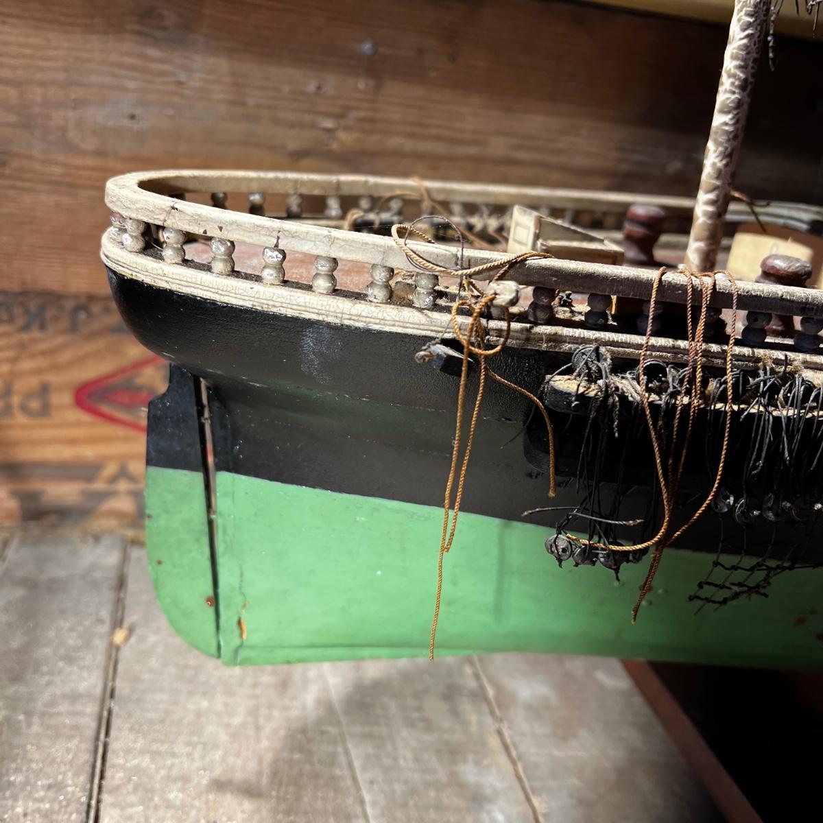 Hull of ship is completely intact but is missing the sails. Mast parts are included and other pieces. Ship needs restoration.