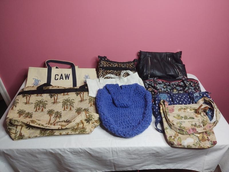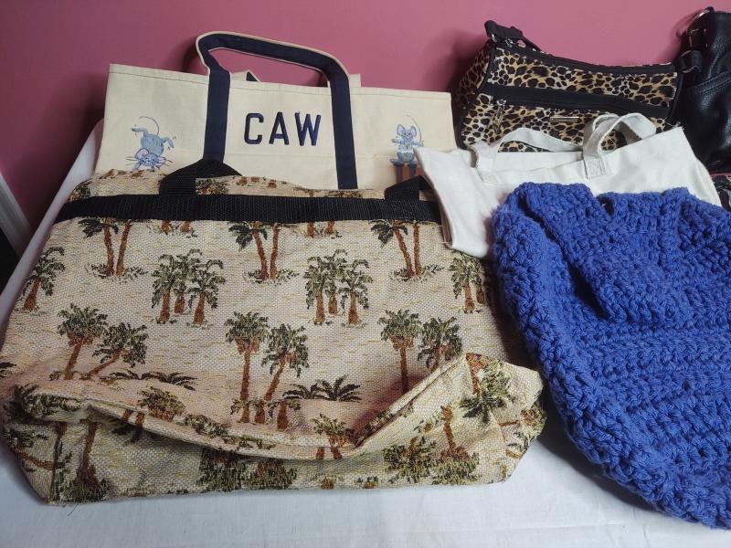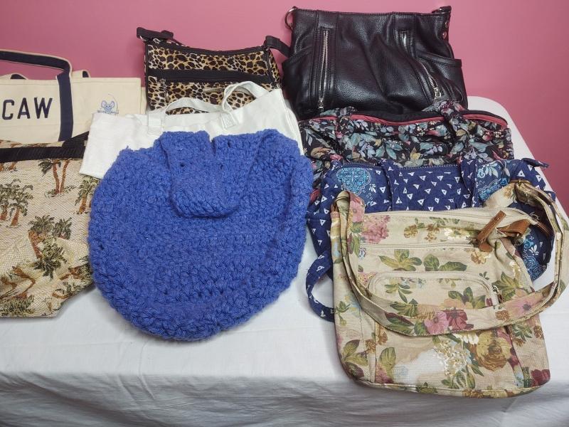 Several bags and purses in this lot. The blue bag is crocheted and has a shoulder strap.