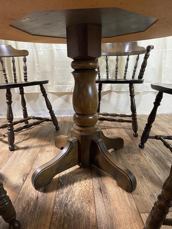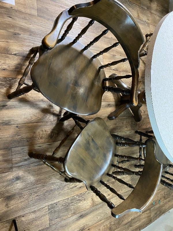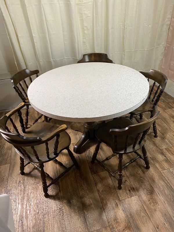 Lot #157 Vintagw 48” Diameter Formica top Table 5 Barrel Back Solid Wood Chairs