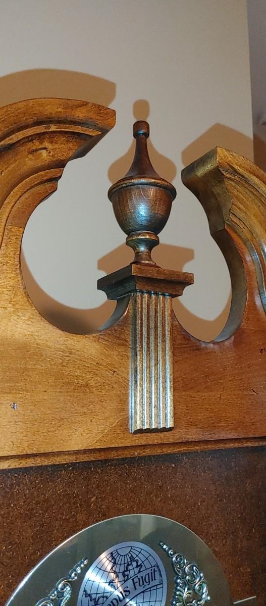 The Howard Miller curio grandfather clock is a tall, but smaller footprint curio floor clock that will display your collectables in fashion. This curio grandfather clock is lightly distressed and features a graceful swan neck pediment with turned finial. Tempus Fugit (meaning "time flies") dial features silver chapter ring and decorated corner spandrels.