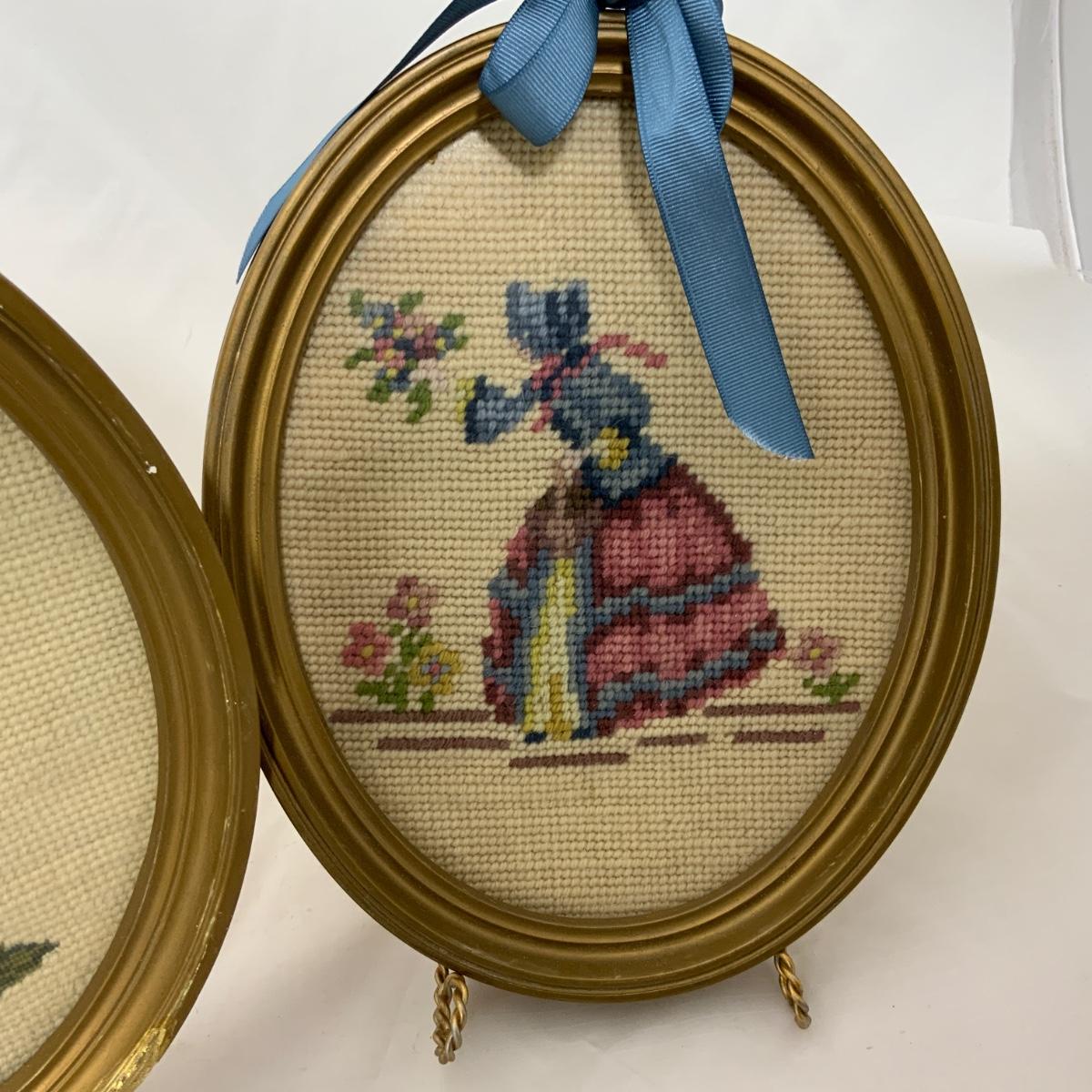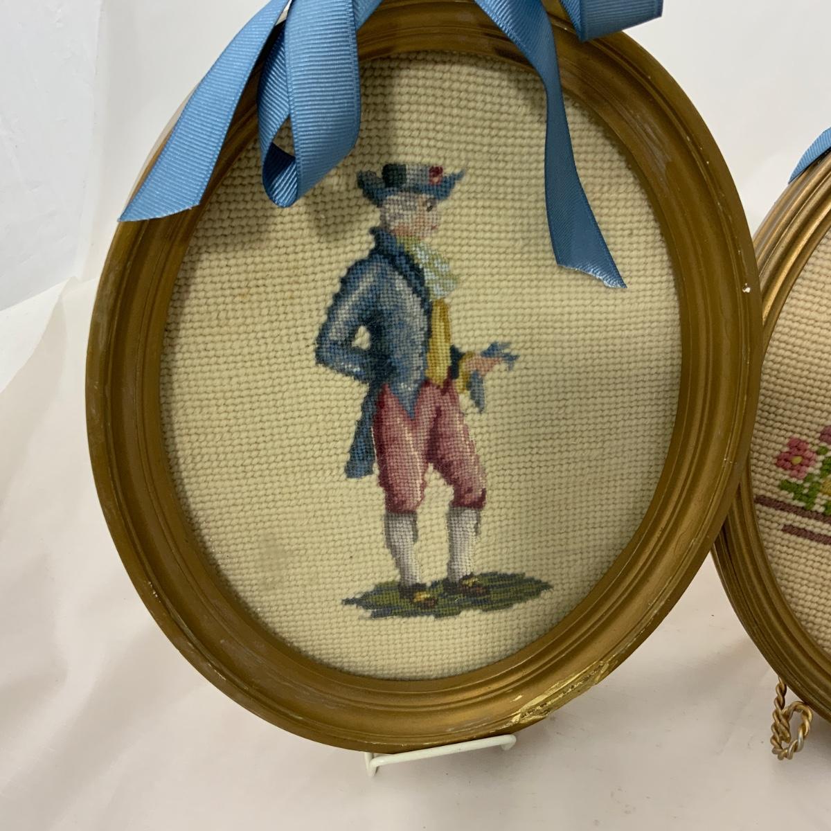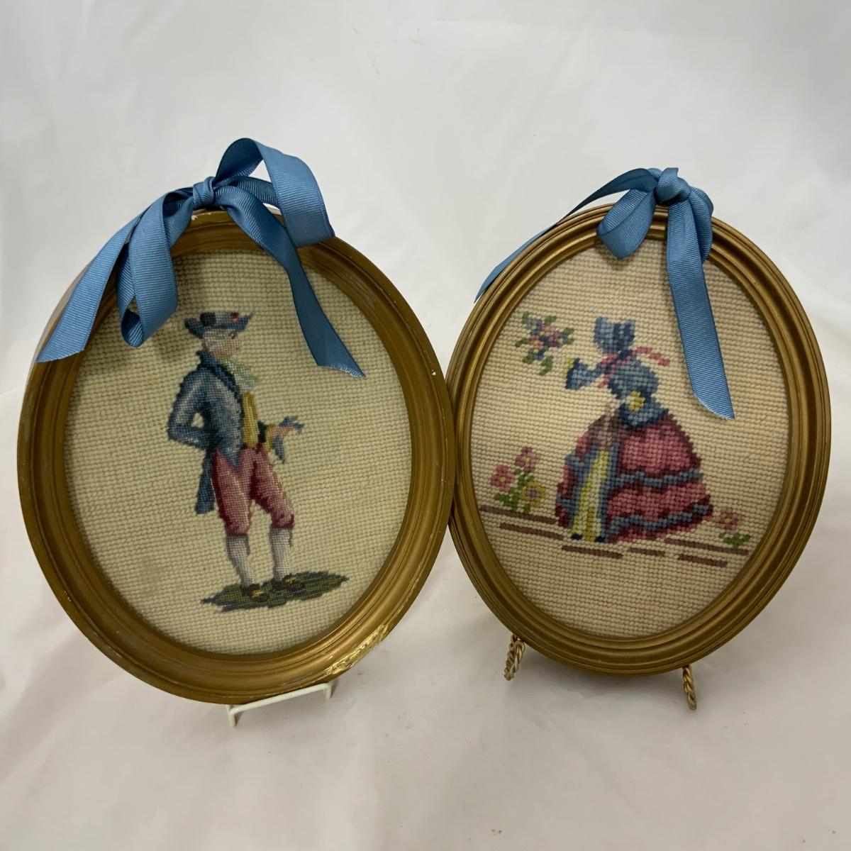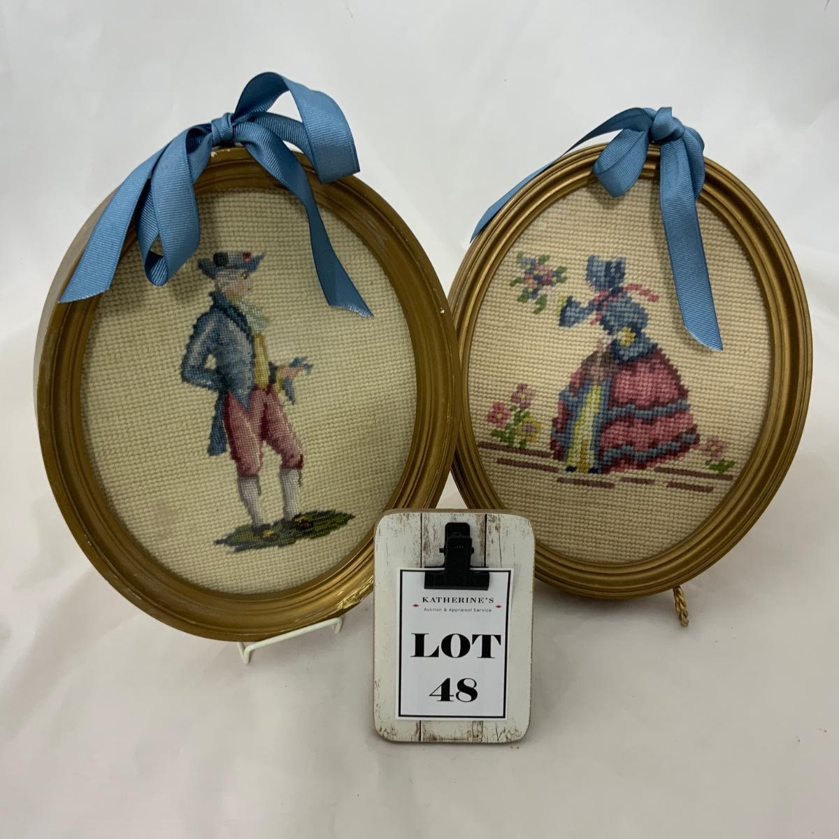 Sweet pair of oval-framed needlepoint pieces. One male, and one female. Pieces were crafted with care and the bow is a real bonus! Frames each measure 9.5” x 8” x 1.5”. Please see photos for details and condition. ::: Shipping is available on this lot. If you require shipping you must let us know at the close of the auction. We will coordinate with you after the item has been won. Shipping fees will include insurance up to or exceeding the value of all items being mailed. If you have any questions regarding this lot please contact the auctioneer either via this website, by direct email or by phone. PICK UP TIMES and other important information can be found in the TERMS and DESCRIPTION of the auction. Please take a look for pertinent information. Thanks!
