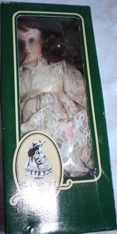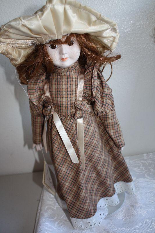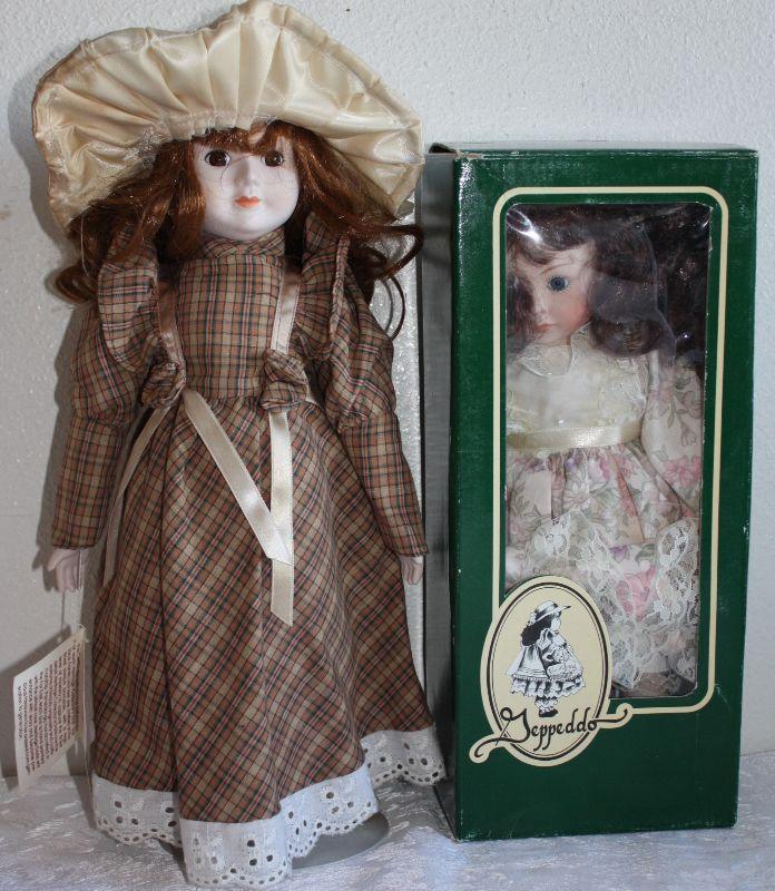 (2) Vintage Porcelin Dolls with soft bodies- (1) 15" on stand, (1) 13" in box