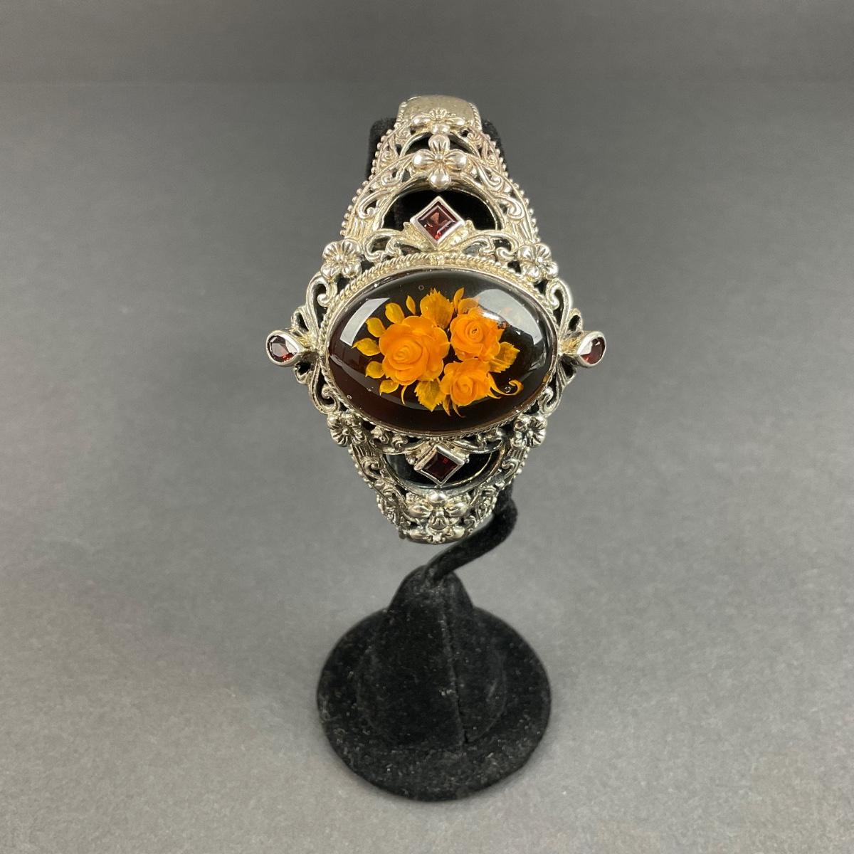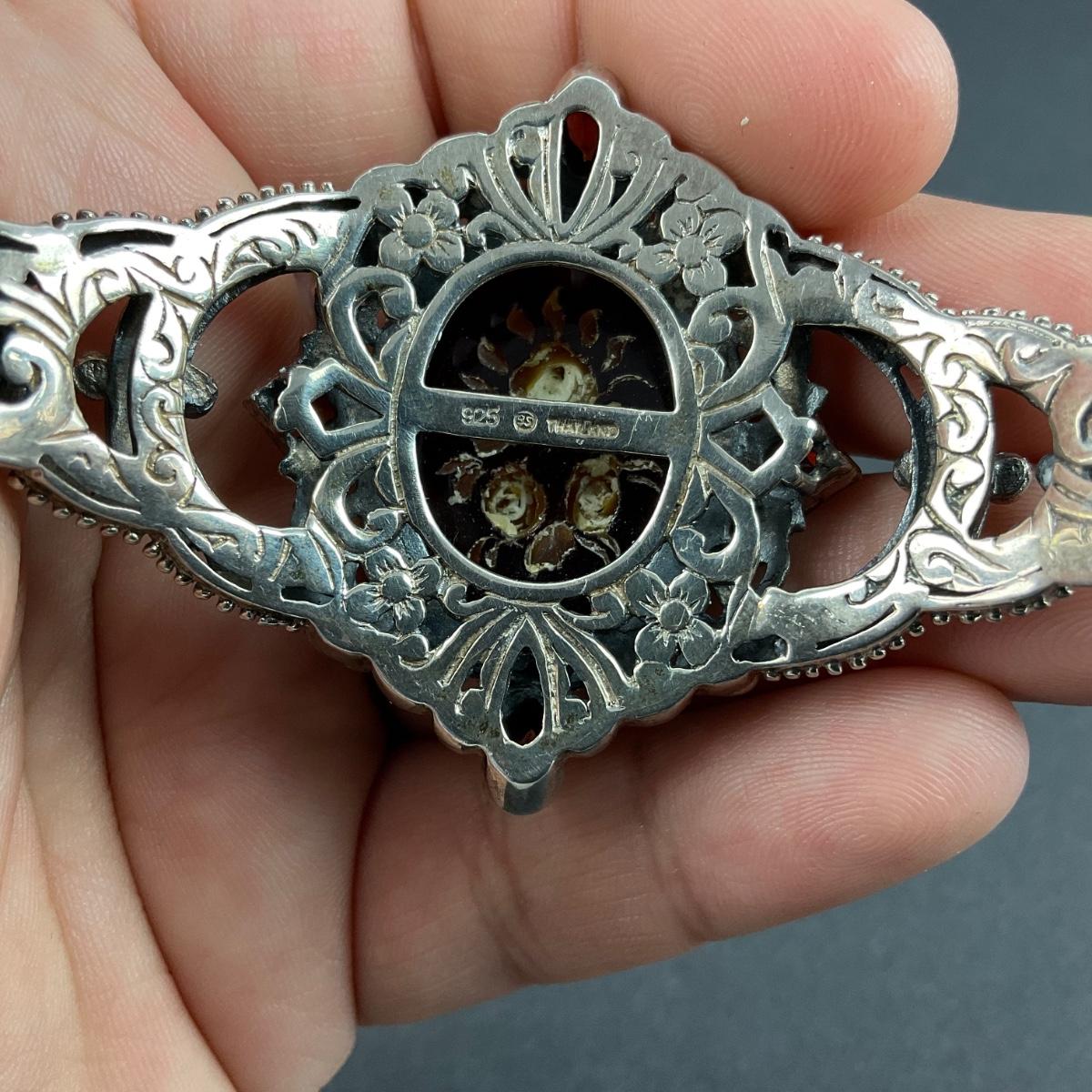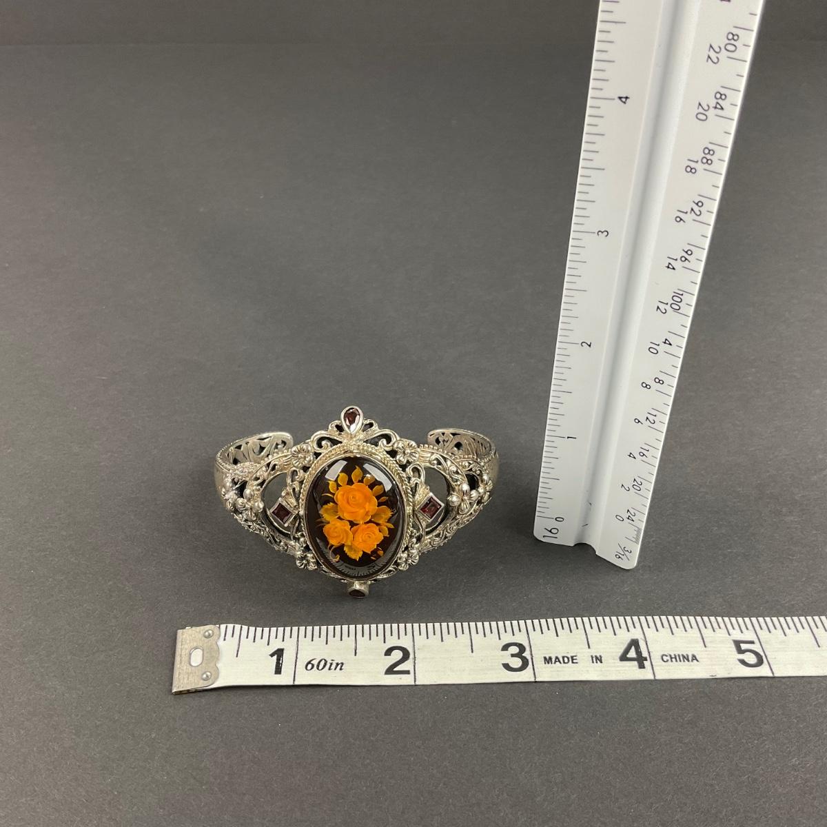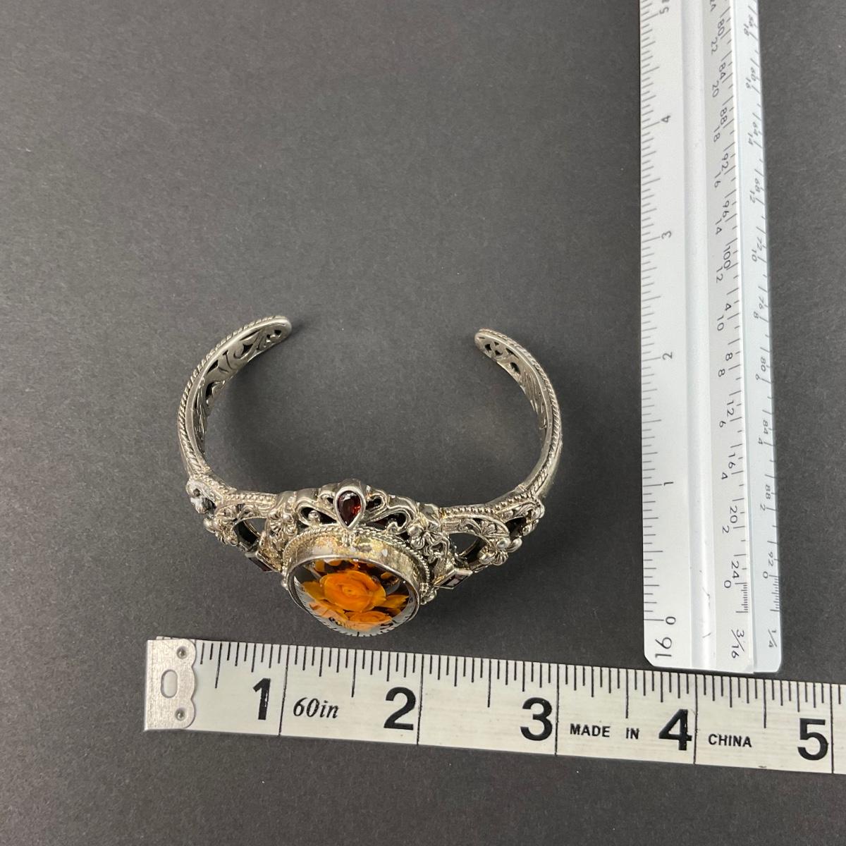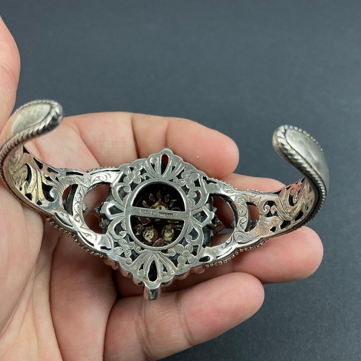 One sterling silver marked vintage Thailand flower cuff bracelet. The total weight of this piece with the stones is 45 grams. This piece has no damage, and appears to be in great shape with no visable chips, cracks, or broken pieces and stone. Please see photos for details and condition. Any condition statement is given as a courtesy to a client, is an opinion, and should not be treated as a statement of fact. Reference to condition written, oral or within a condition report shall not be regarded as a full account of condition and may not include all defects, alterations, or restorations. Absence of a condition report does not imply a lot is flawless or lacking imperfections or damage. Katherine’s Auction & Appraisal Service shall have no responsibility for any error or omission. Returns shall not be accepted on the basis of condition. ::: Shipping is available on this lot. If you require shipping you must let us know at the close of the auction. We will coordinate with you after the item has been won. Shipping fees will include insurance up to or exceeding the value of all items being mailed. If you have any questions regarding this lot please contact the auctioneer either via this website, by direct email or by phone. PICK UP TIMES and other important information can be found in the TERMS and DESCRIPTION of the auction. Please take a look for pertinent information. Thanks!