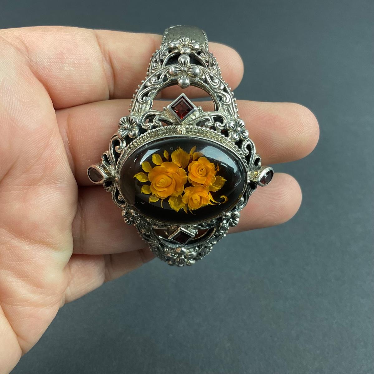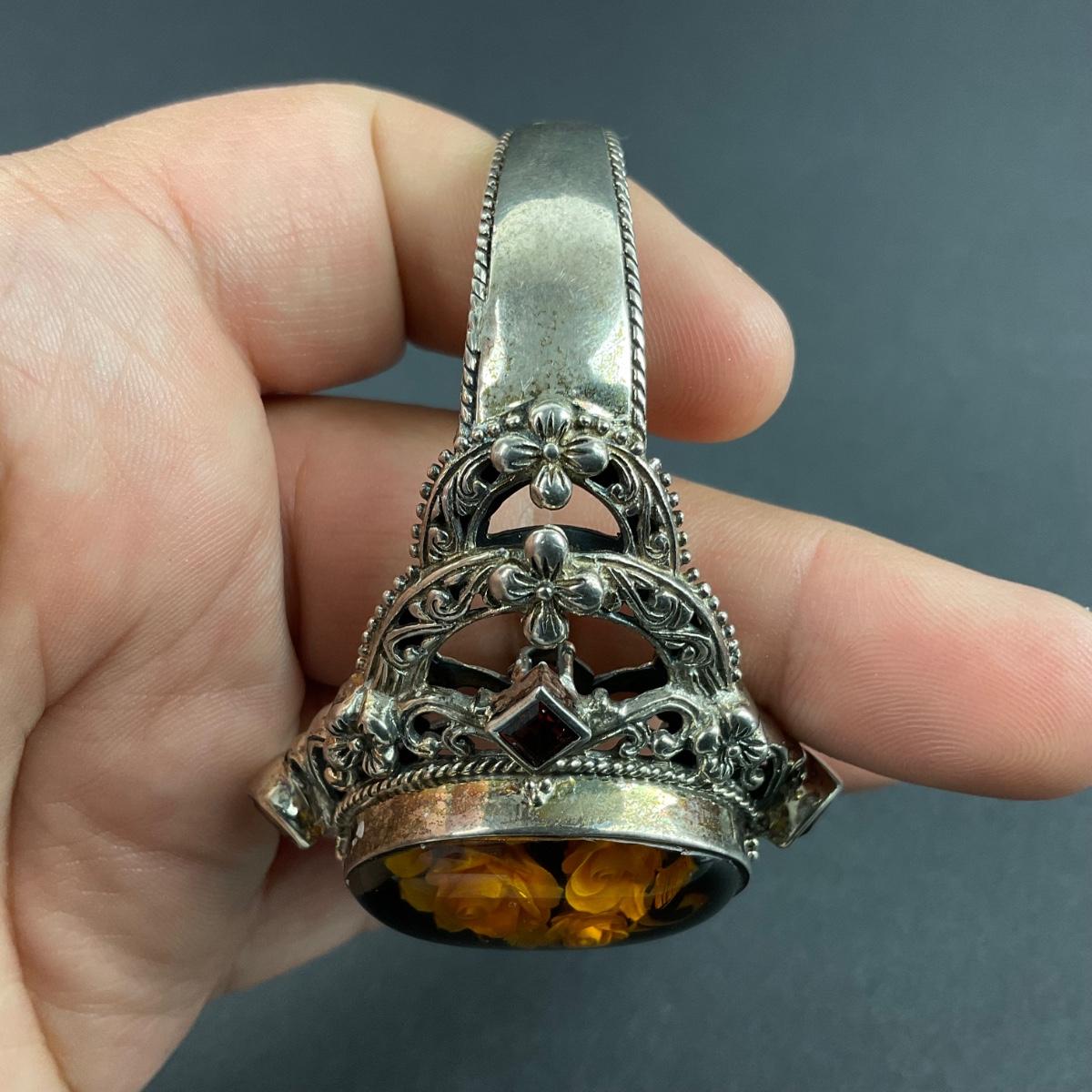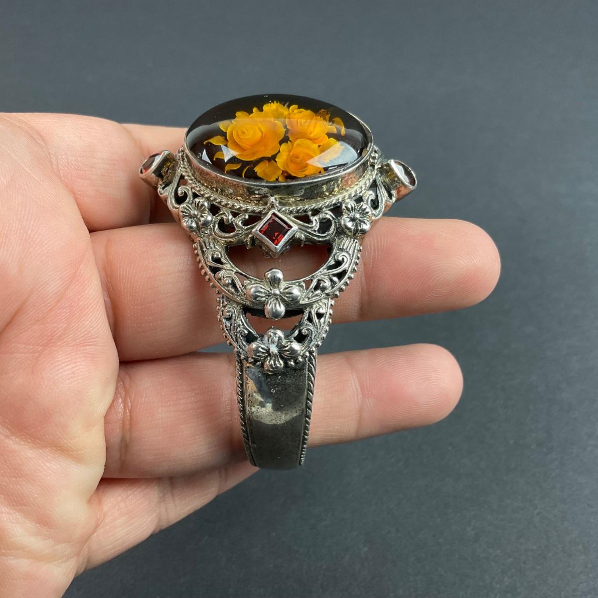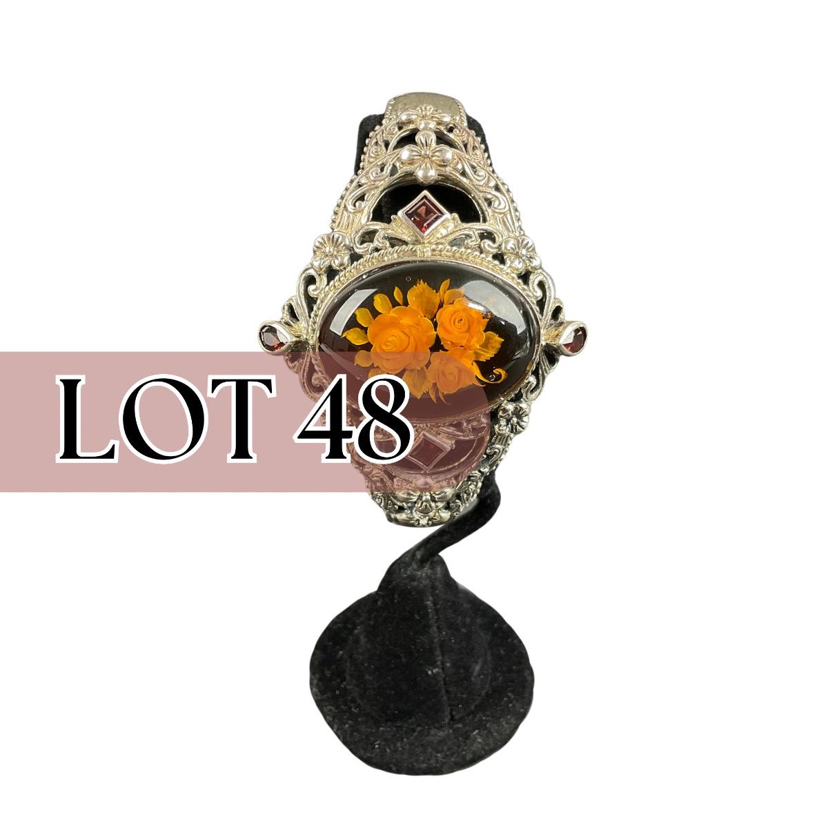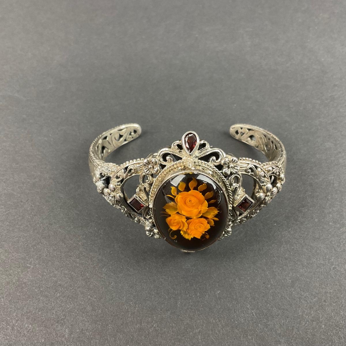 One sterling silver marked vintage Thailand flower cuff bracelet. The total weight of this piece with the stones is 45 grams. This piece has no damage, and appears to be in great shape with no visable chips, cracks, or broken pieces and stone. Please see photos for details and condition. Any condition statement is given as a courtesy to a client, is an opinion, and should not be treated as a statement of fact. Reference to condition written, oral or within a condition report shall not be regarded as a full account of condition and may not include all defects, alterations, or restorations. Absence of a condition report does not imply a lot is flawless or lacking imperfections or damage. Katherine’s Auction & Appraisal Service shall have no responsibility for any error or omission. Returns shall not be accepted on the basis of condition. ::: Shipping is available on this lot. If you require shipping you must let us know at the close of the auction. We will coordinate with you after the item has been won. Shipping fees will include insurance up to or exceeding the value of all items being mailed. If you have any questions regarding this lot please contact the auctioneer either via this website, by direct email or by phone. PICK UP TIMES and other important information can be found in the TERMS and DESCRIPTION of the auction. Please take a look for pertinent information. Thanks!
