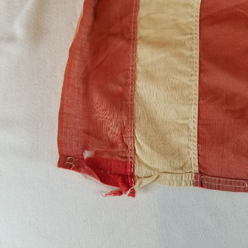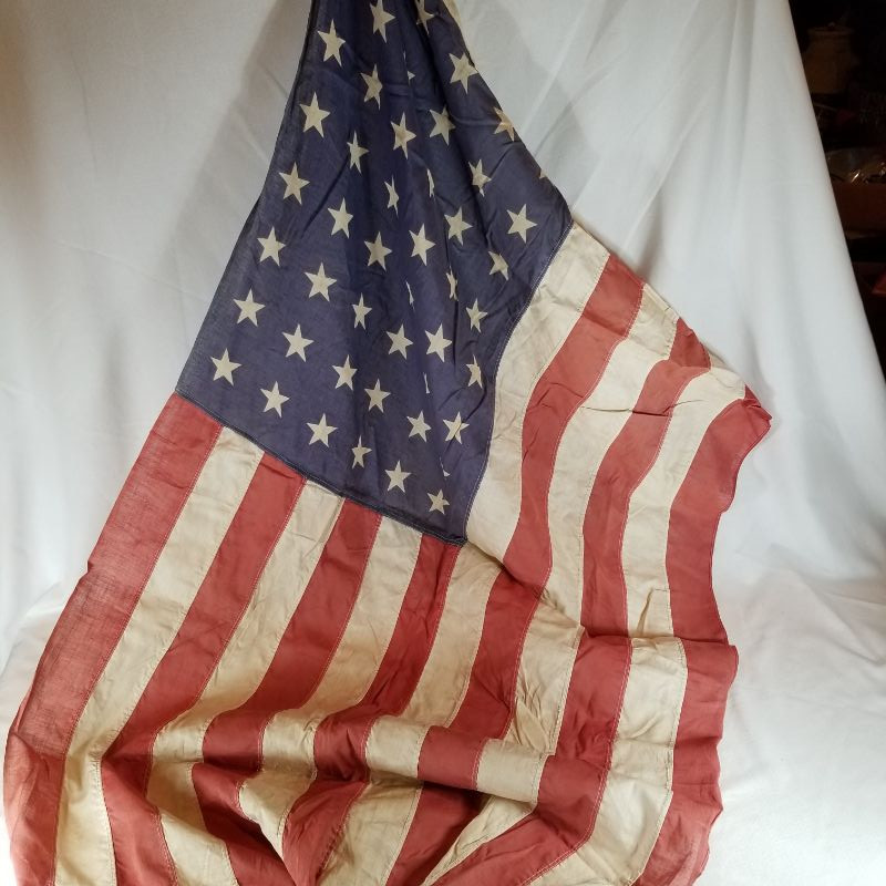 This great old flag has only 48 stars. It is relatively in good condition considering it's age - predating 1959. There is very small hole in one corner and a seam has come undone in same area. This flag is yellowed and faded - that's why they call it Old Glory. Machine sewn all cotton. 58-inches wide X 33-inches tall. A must have for a collector of patriotic items or for your display this coming July 4th.
