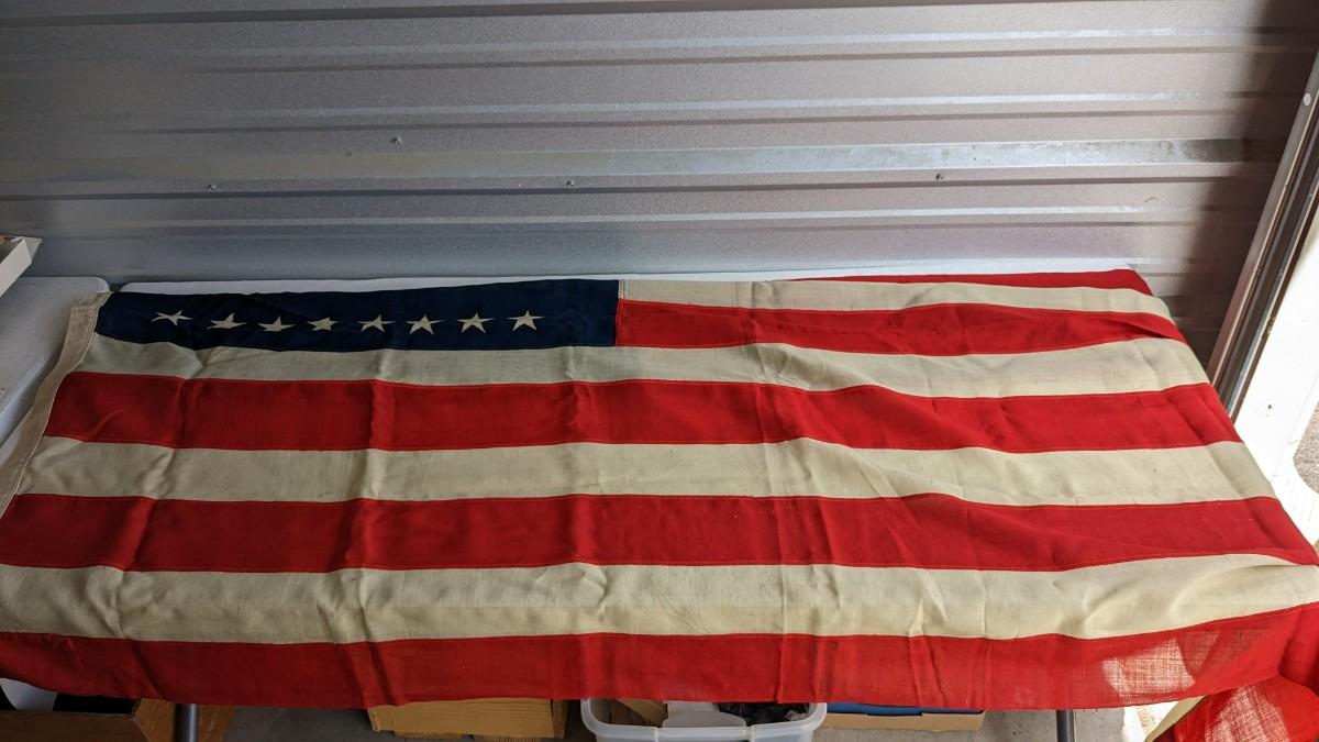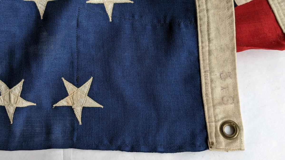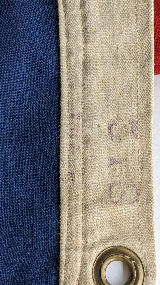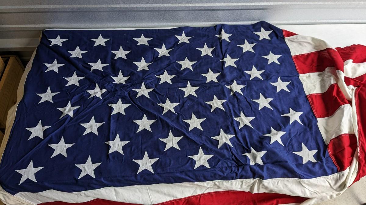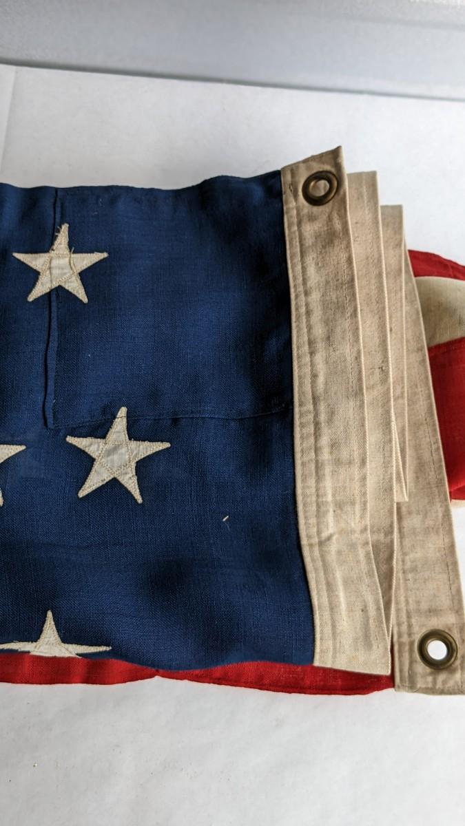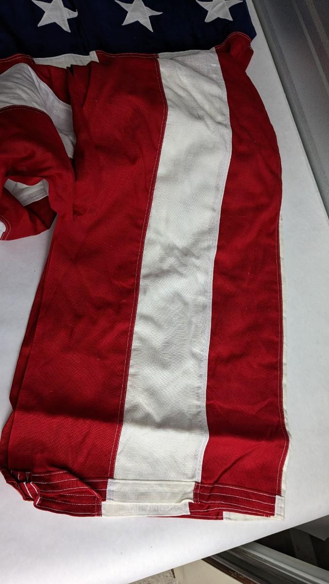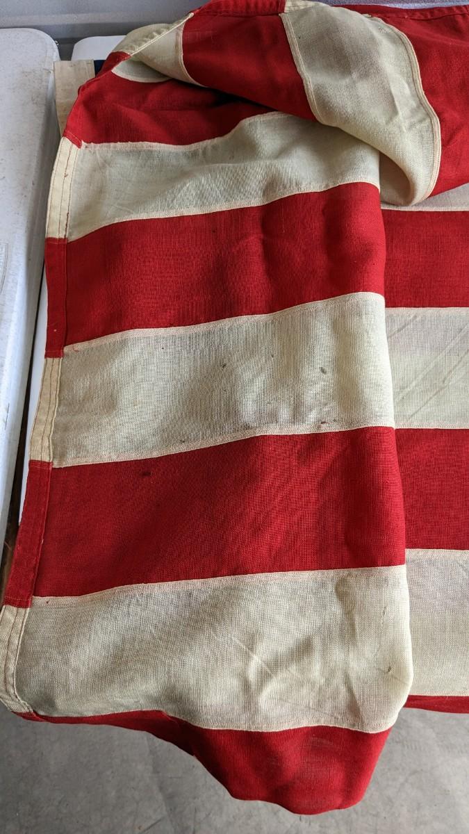 5'x8' and in very nice condition for age. Holes and light staining noted. No tattered ends with brass rivets in great condition. Also includes incredible condition Valley Forge #5 (50) star bunting flag. 2616