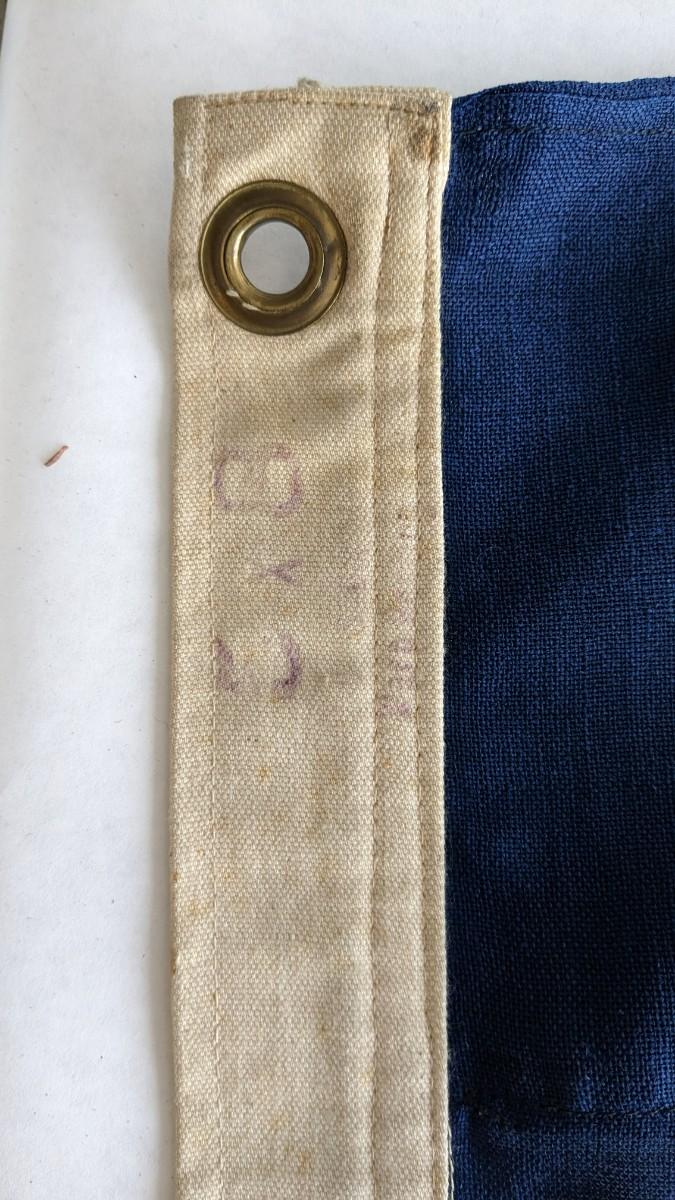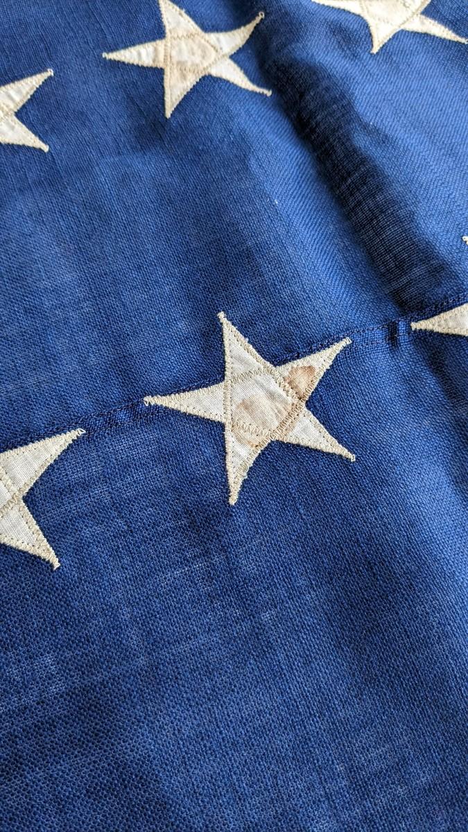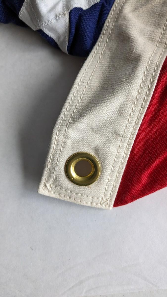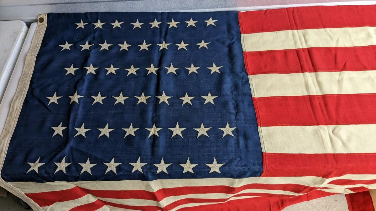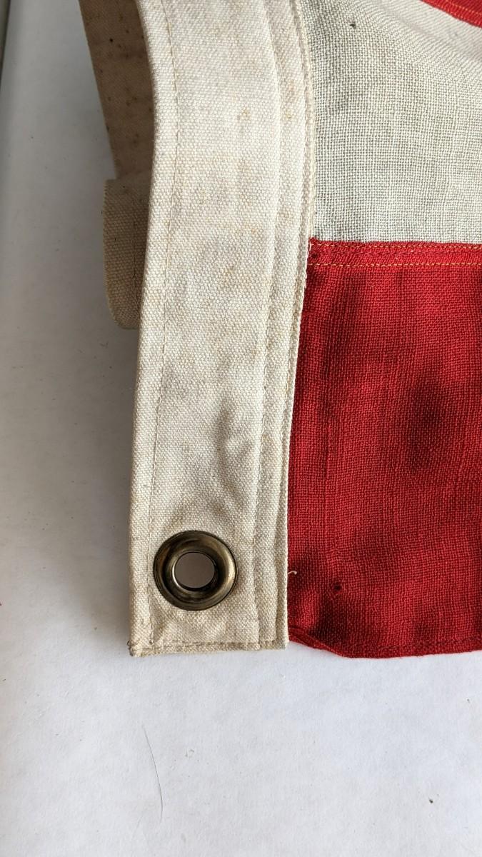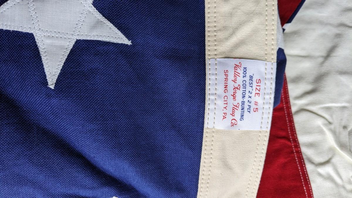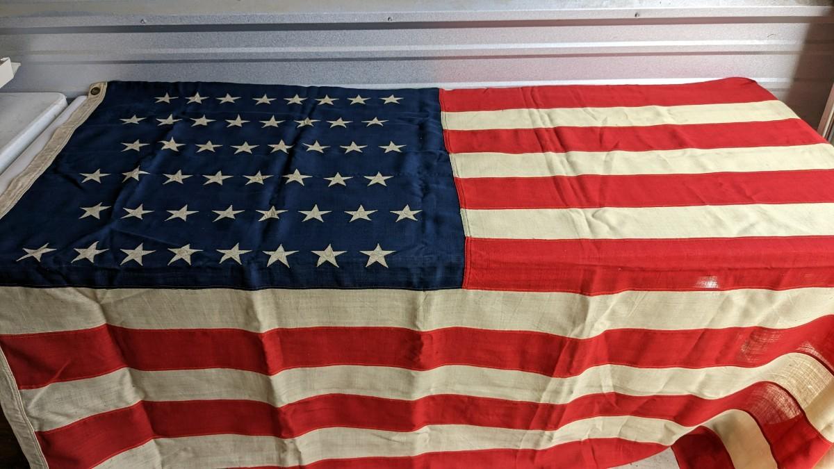 5'x8' and in very nice condition for age. Holes and light staining noted. No tattered ends with brass rivets in great condition. Also includes incredible condition Valley Forge #5 (50) star bunting flag. 2616