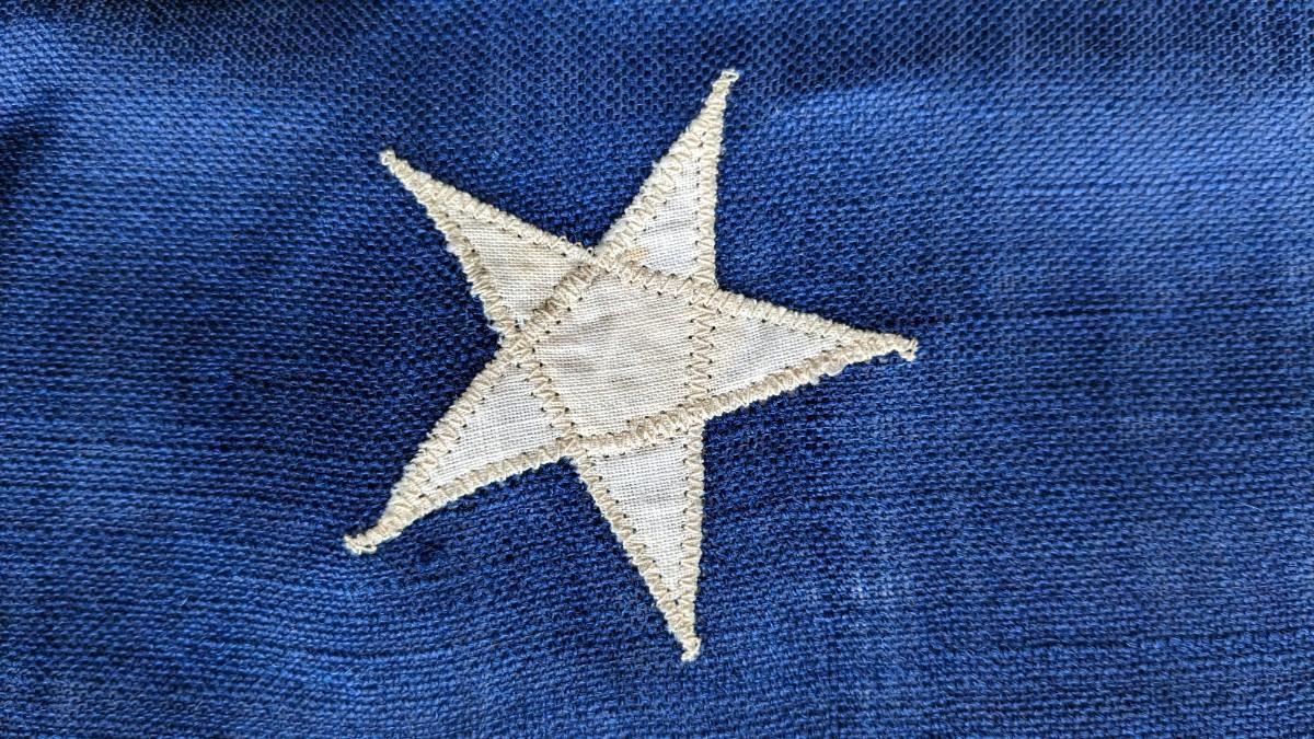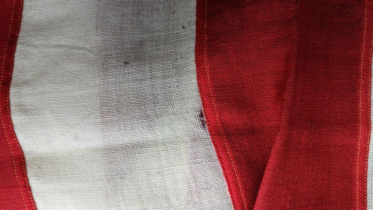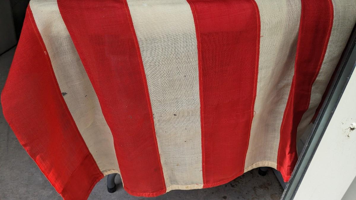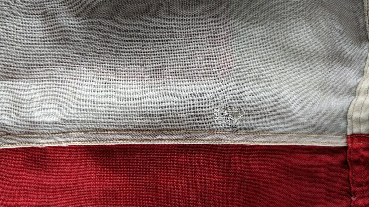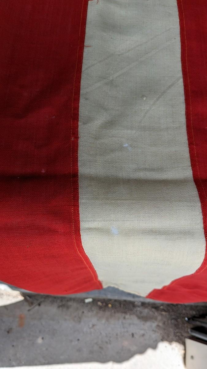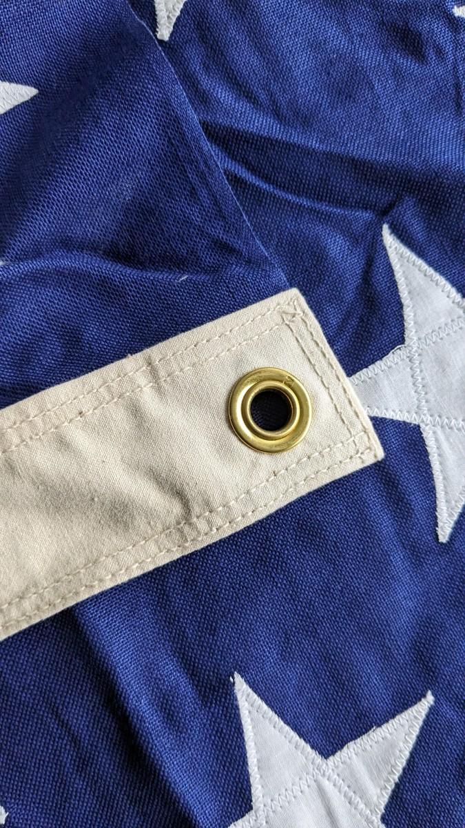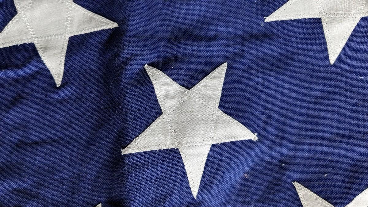 5'x8' and in very nice condition for age. Holes and light staining noted. No tattered ends with brass rivets in great condition. Also includes incredible condition Valley Forge #5 (50) star bunting flag. 2616