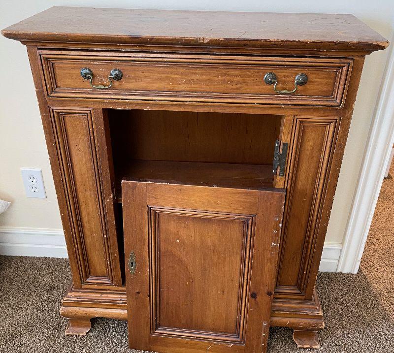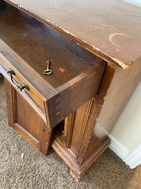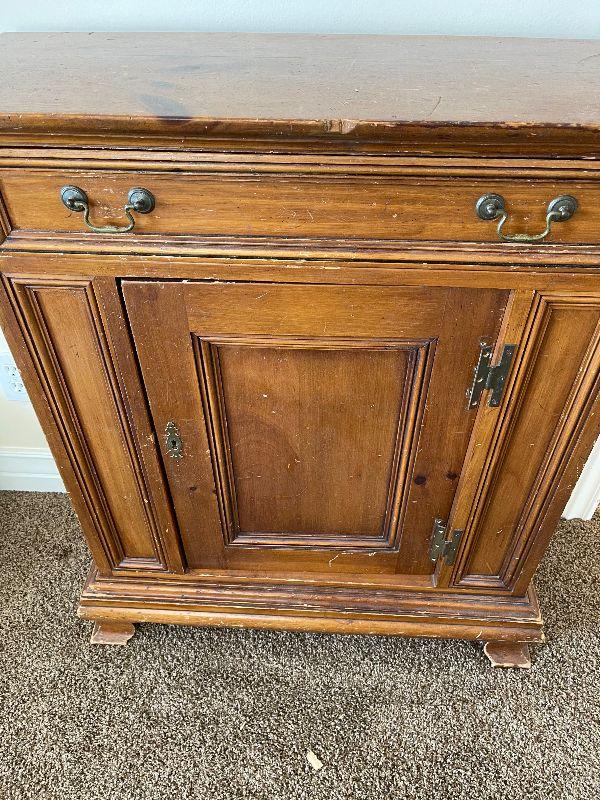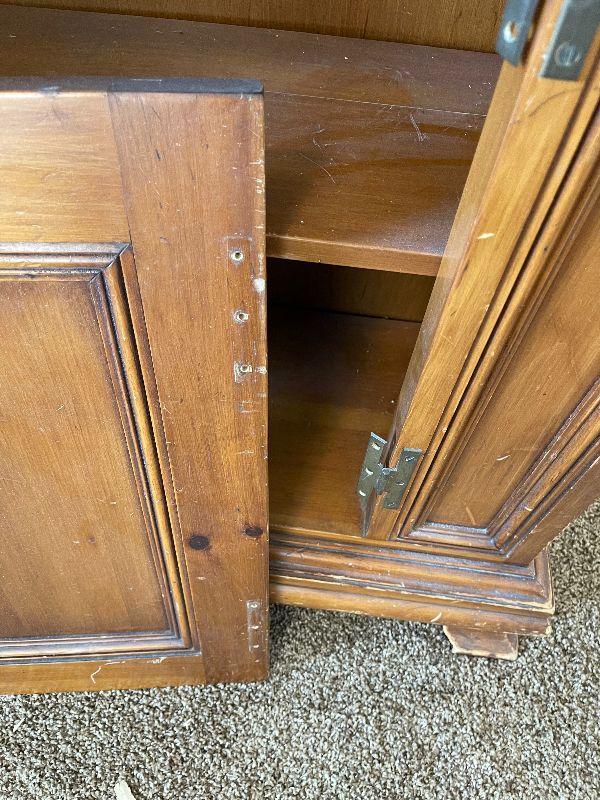 Door is not broken, just off. Shows wear but a lovely piece 30 x 12 x 35