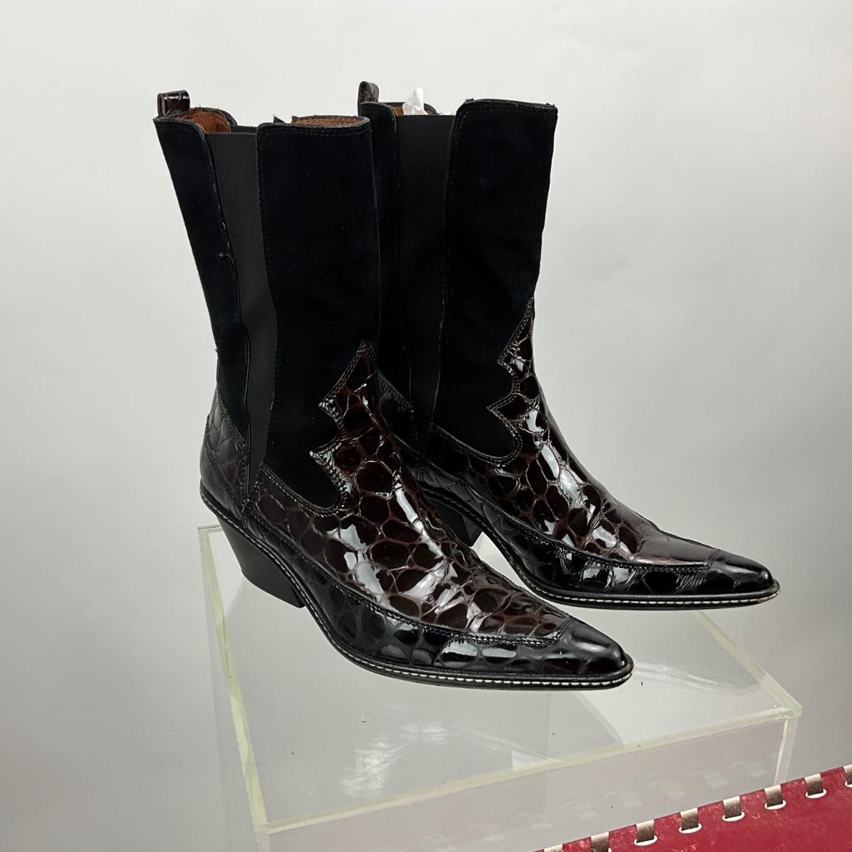 Boots made in Italy, brown and black crocodile and patent leather. Size 8.5M, complete with dust bag and original box.