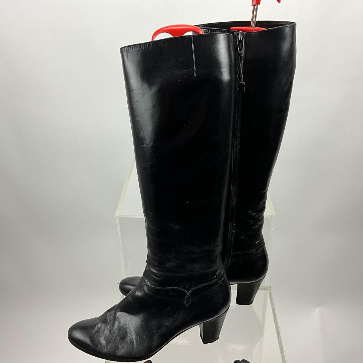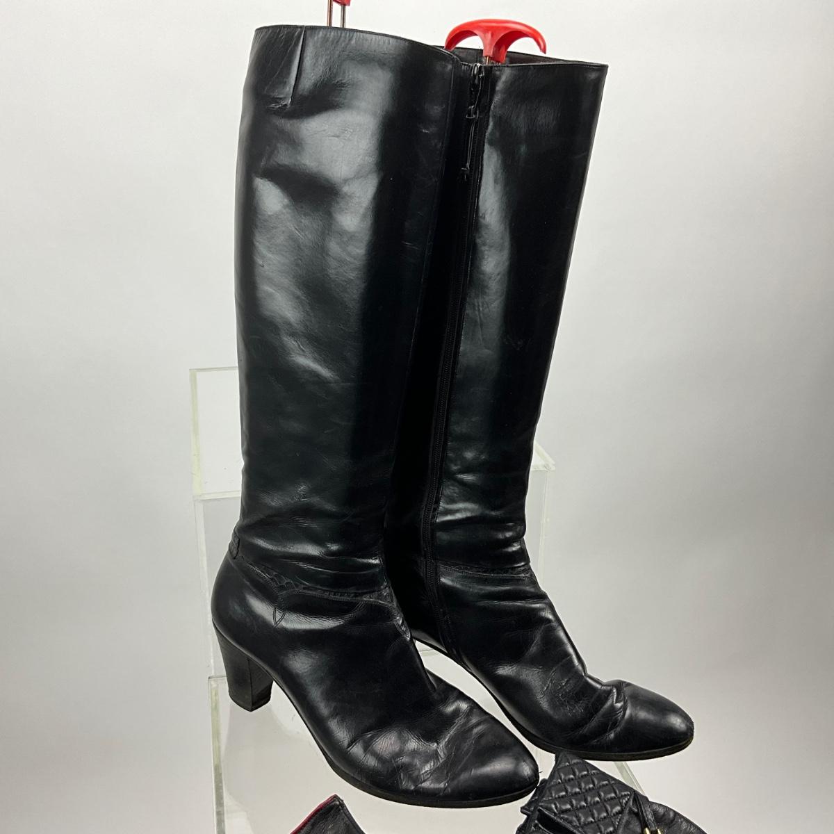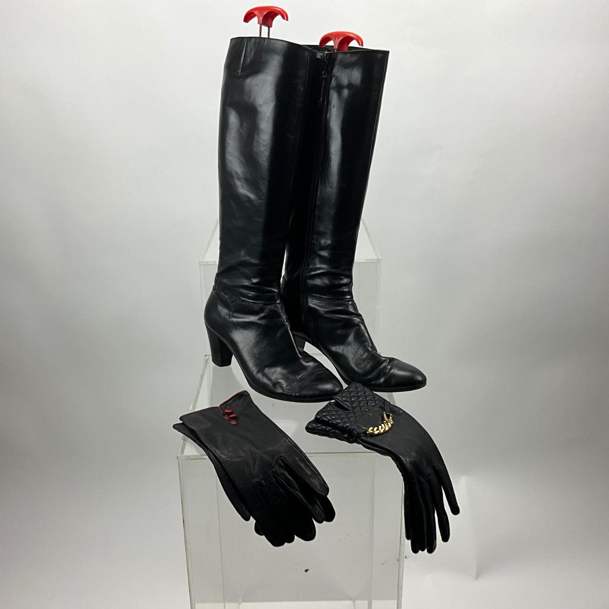 Boots are size 9, made in Italy, black leather. Lot contains 2 pair of black leather gloves.