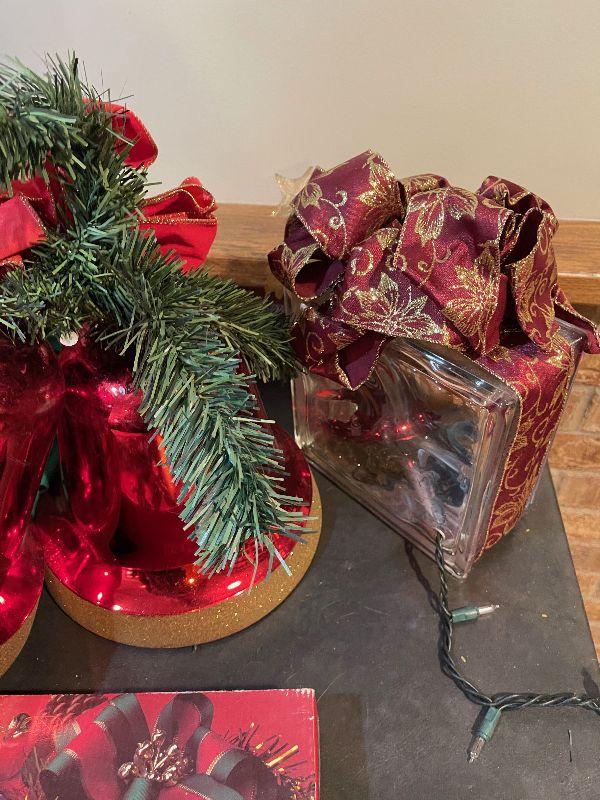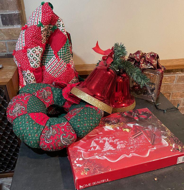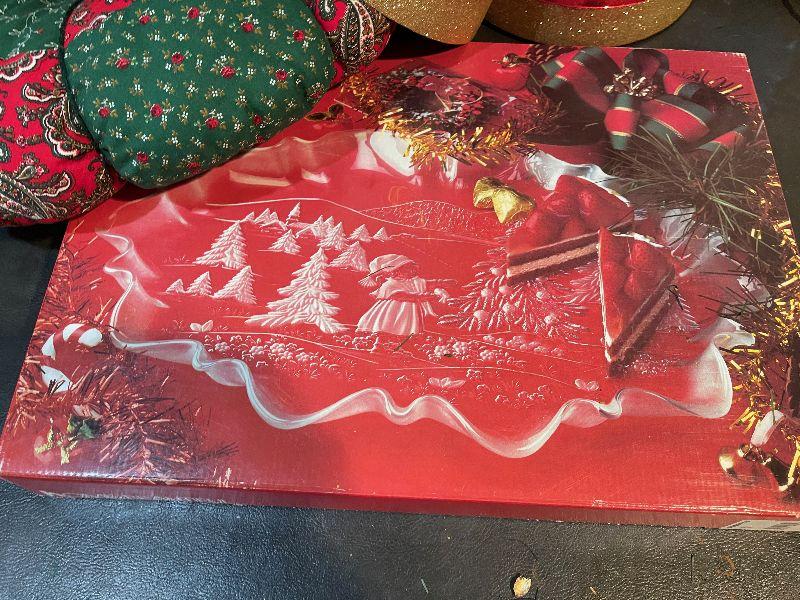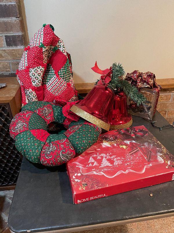 #485B Christmas Items: Skirt, Glass Serving Tray, Wreath etc.