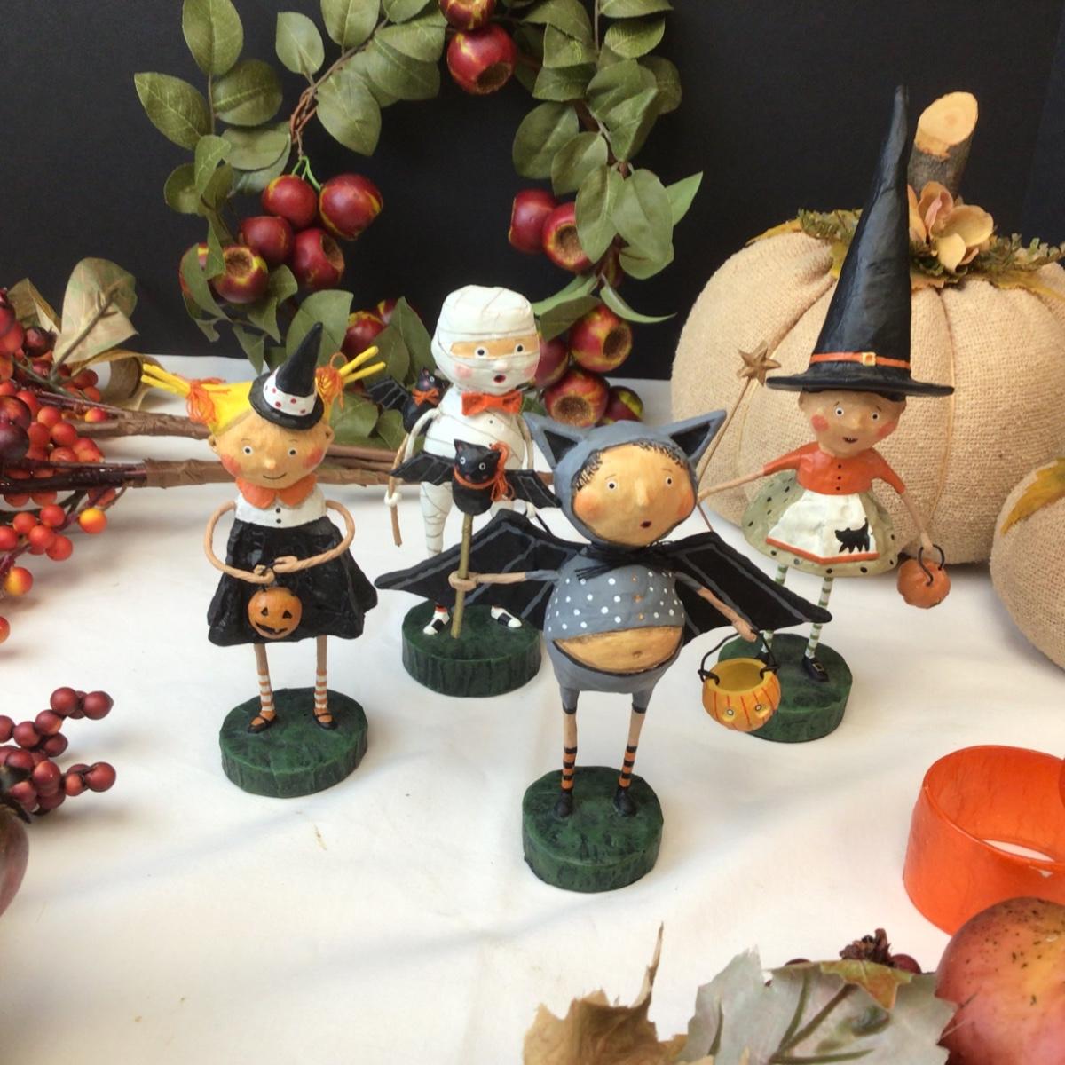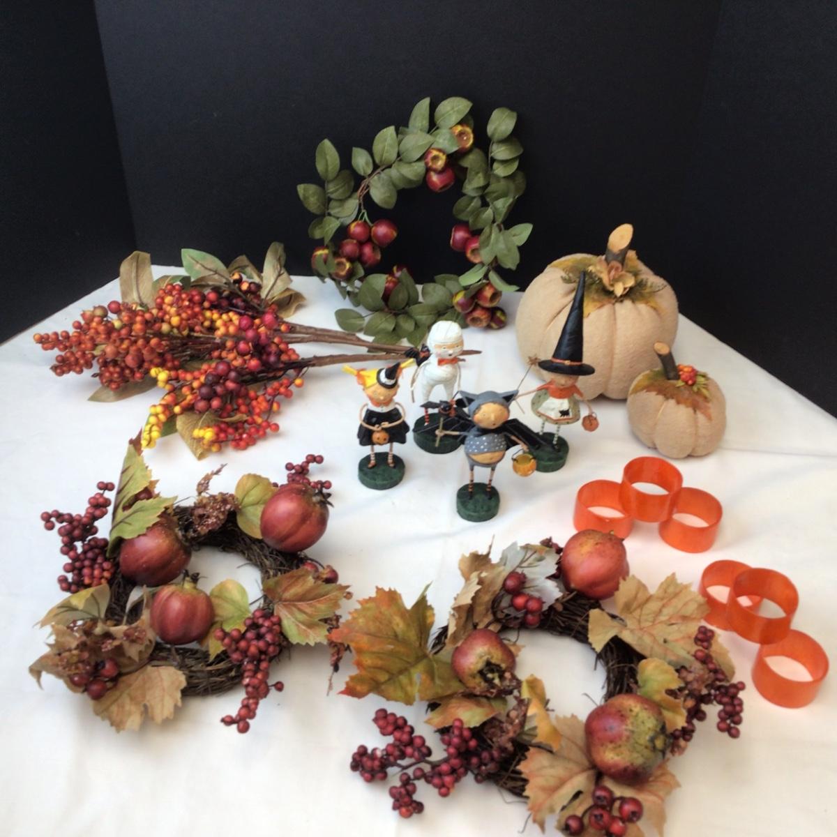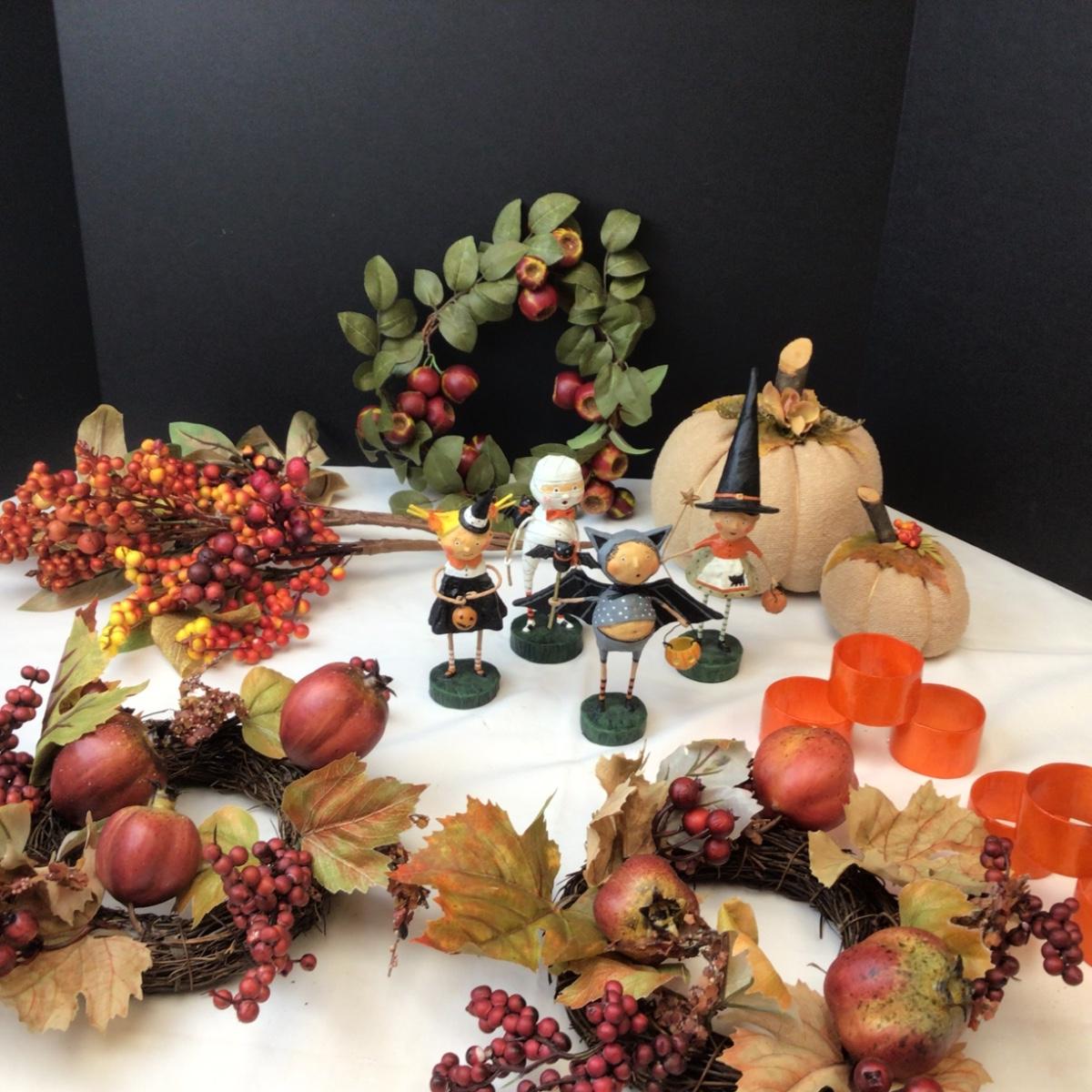 Lot contains various decorative fall items and 4 Halloween characters from Lori c. Mitchell.