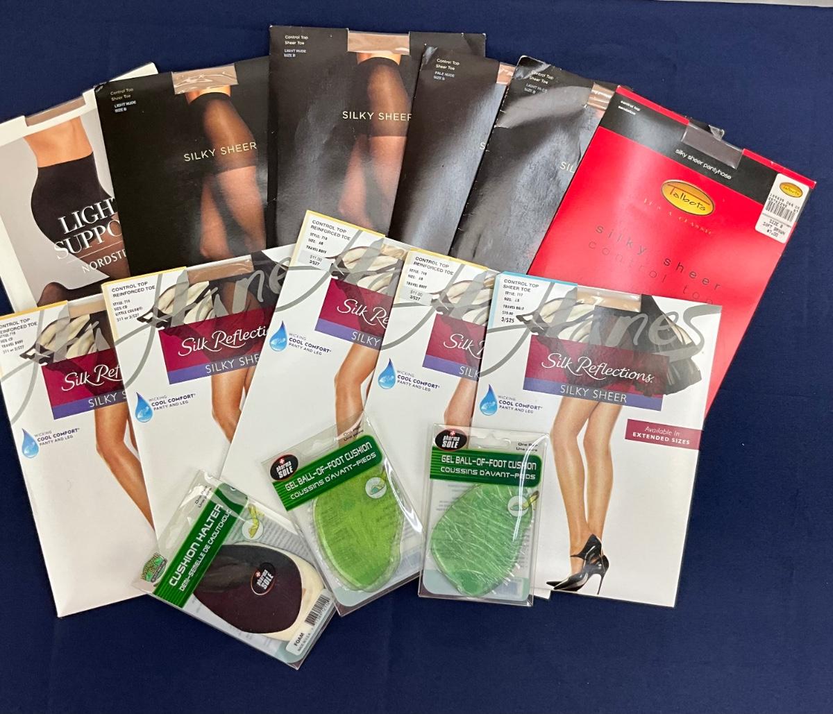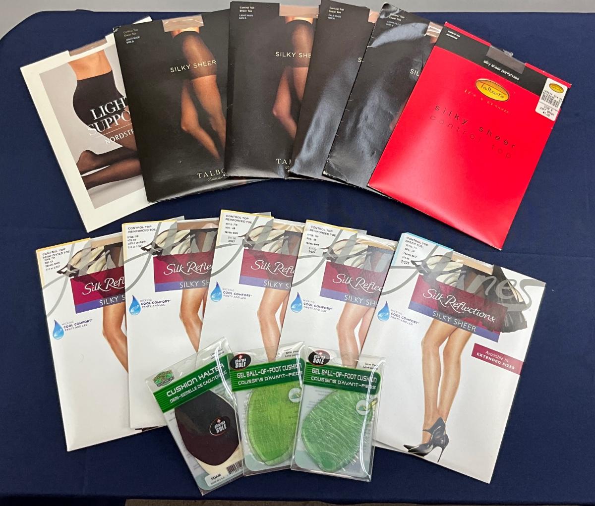 There are 11 pair of new panty house ranging in size AB, and 3 packs of foot cushions for the ball of your foot.