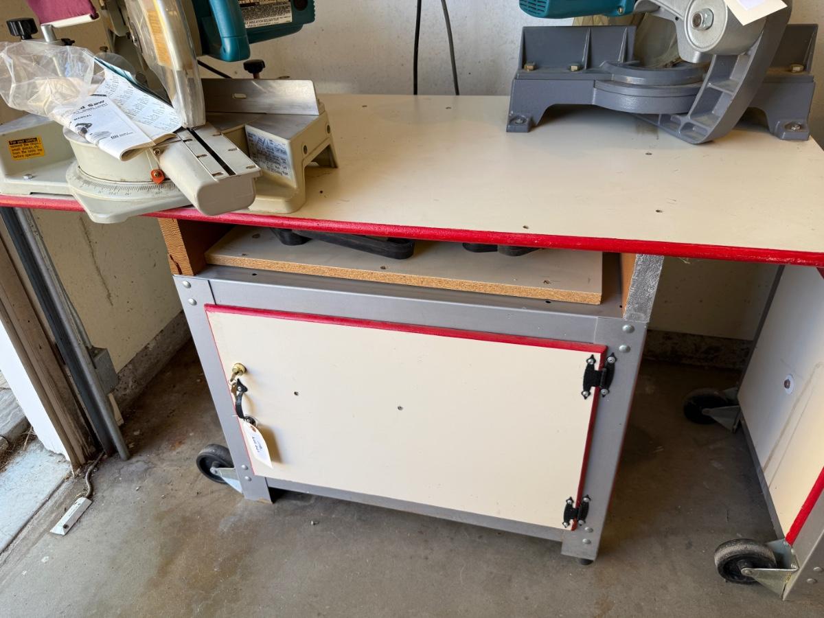Rollling Shop/Saw Table w/lockable cabinet 48”x24”d doesn't include the 2 saws