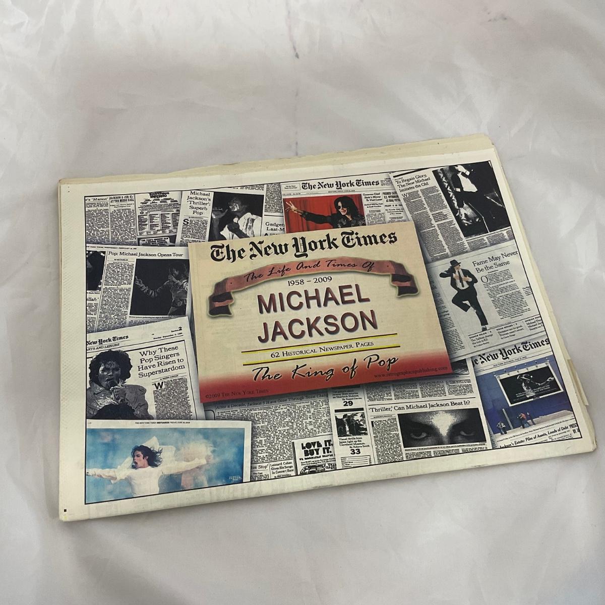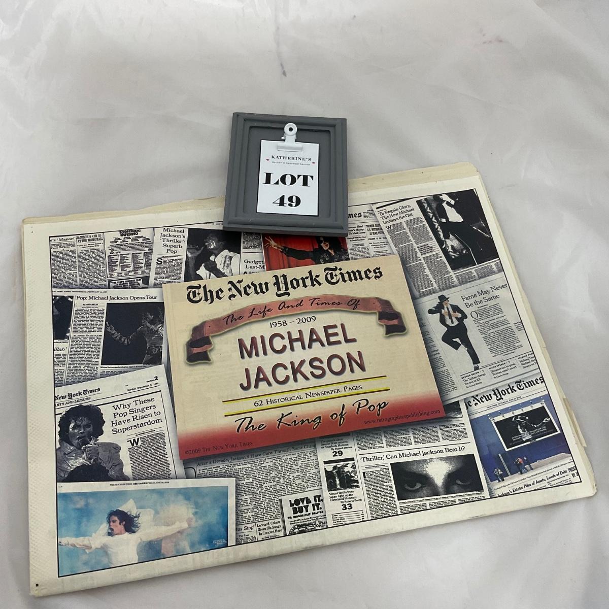 One Michael Jackson Tribute New York Times paper. 11.5 inches by 15 inches in size. Please see photos for details and condition. ::: Shipping is available on this lot. If you require shipping you must let us know at the close of the auction. We will coordinate with you after the item has been won. Shipping fees will include insurance up to or exceeding the value of all items being mailed. If you have any questions regarding this lot please contact the auctioneer either via this website, by direct email or by phone. PICK UP TIMES and other important information can be found in the TERMS and DESCRIPTION of the auction. Please take a look for pertinent information. Thanks!
