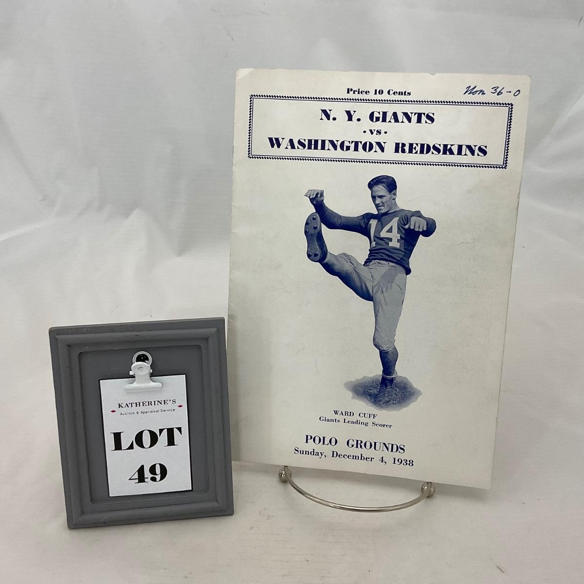 One 1938 New York Giants Vs Washington Redskins program. Program has pencil marks written among some of the pages as pictured. Please see photos for details and condition. ::: Shipping is available on this lot. If you require shipping you must let us know at the close of the auction. We will coordinate with you after the item has been won. Shipping fees will include insurance up to or exceeding the value of all items being mailed. If you have any questions regarding this lot please contact the auctioneer either via this website, by direct email or by phone. PICK UP TIMES and other important information can be found in the TERMS and DESCRIPTION of the auction. Please take a look for pertinent information. Thanks!
