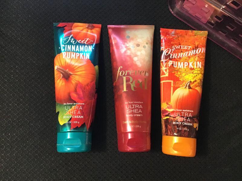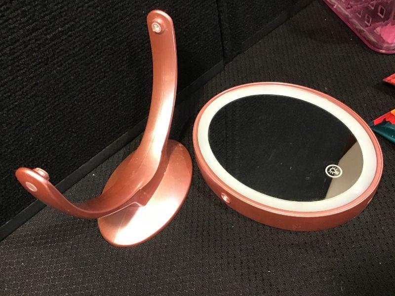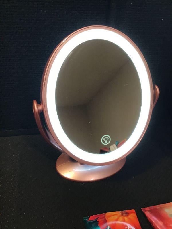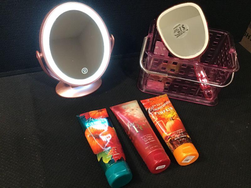 lighted, two-sided makeup mirror is broken, but still holds in the stand. Also included is a hand mirror, crate, and three body lotions