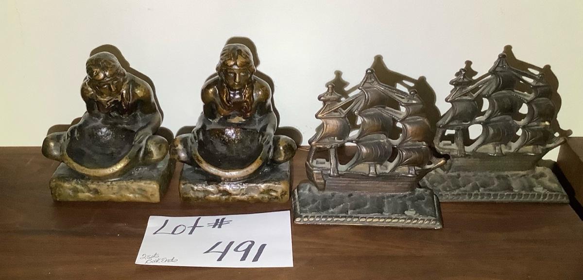 B491 Pair of Bronmet Ship Bookends and Pair of Native American Girl Bookends