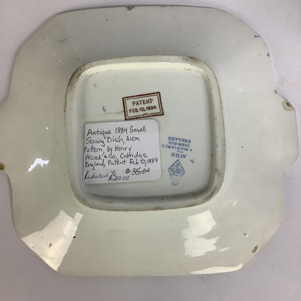 Plate is marked 1884 Henry Alcock & Co Cobridge England, with avon pattern measuring 8.5"square.