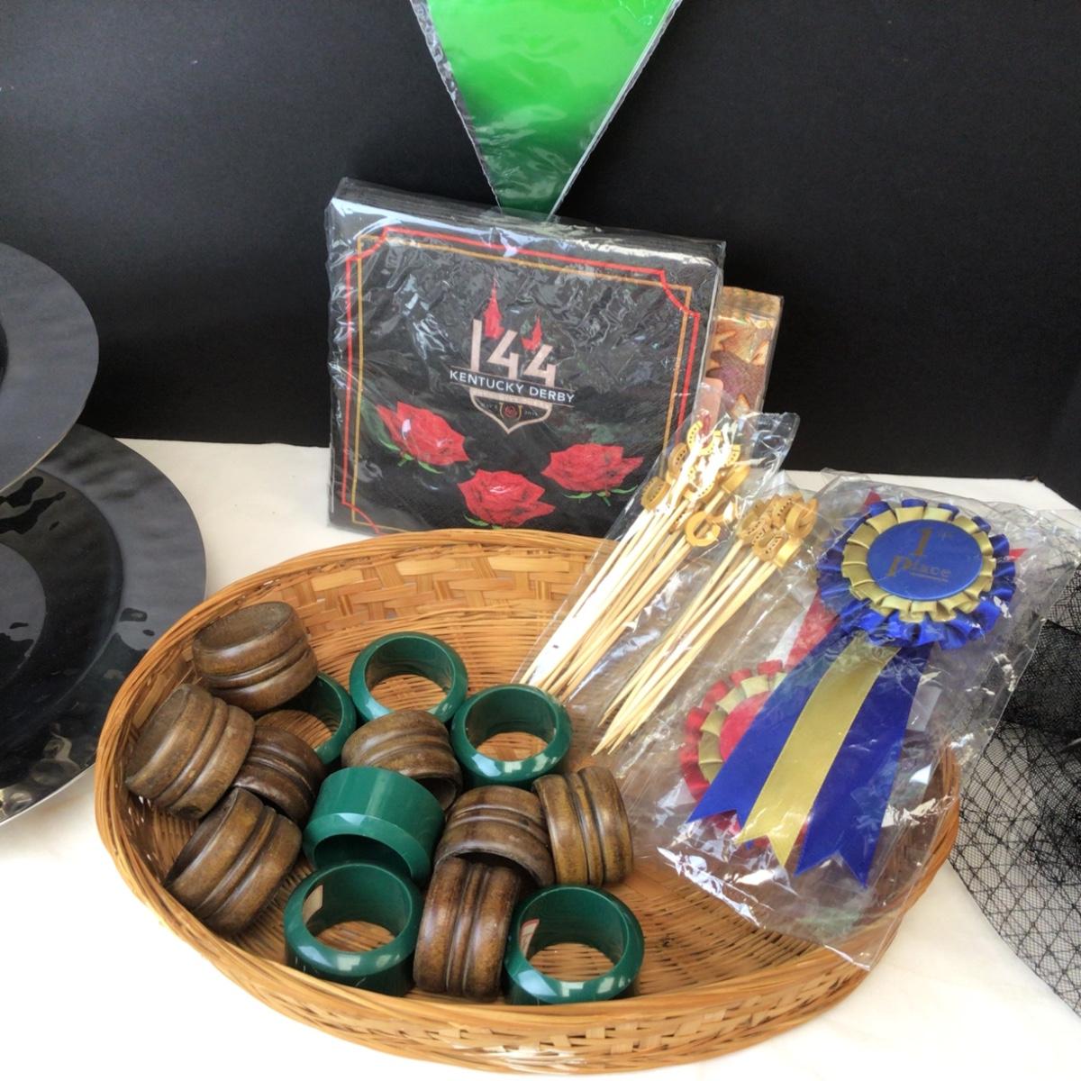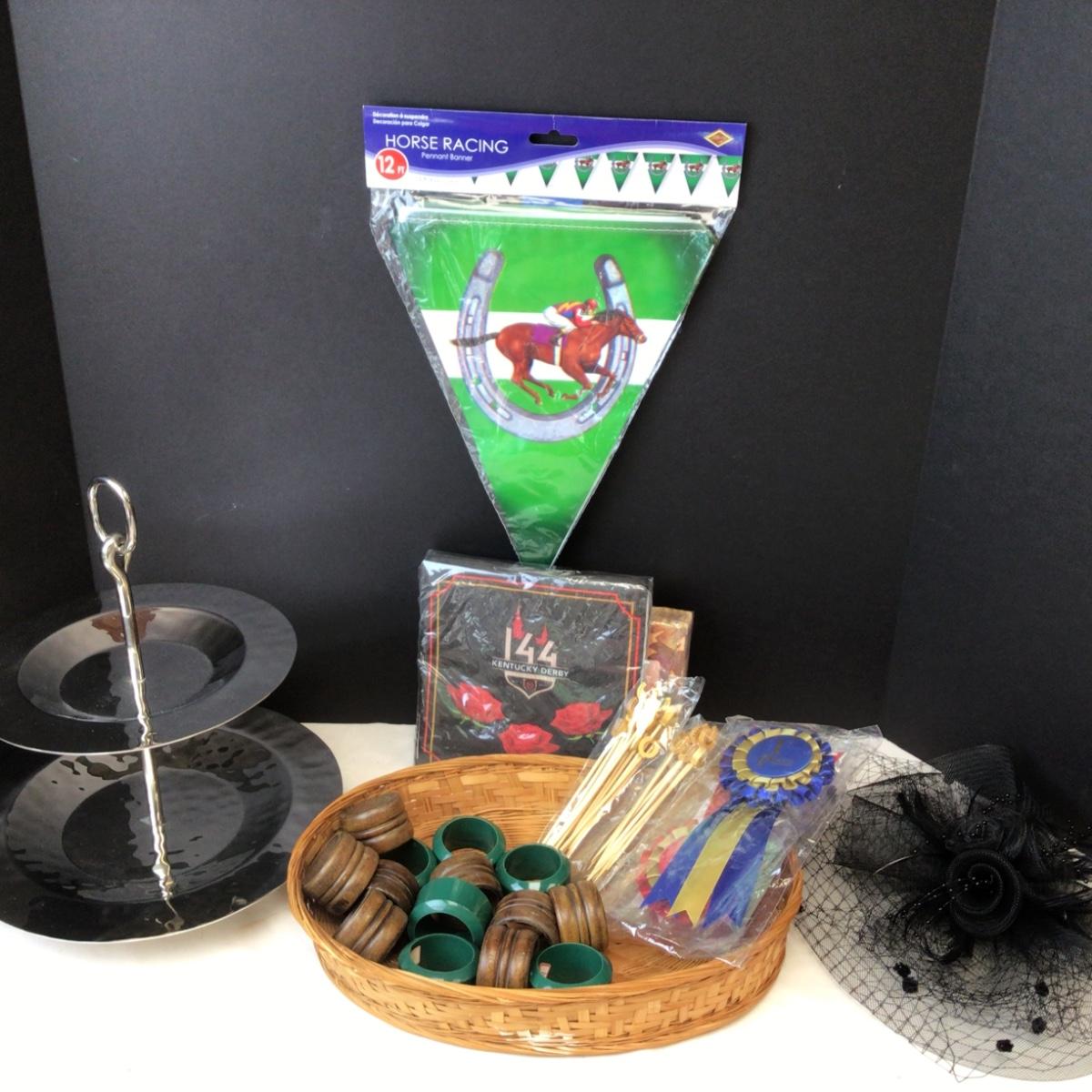 Various derby themed items including a hat, banner, hors d’oeuvres tray and more.
