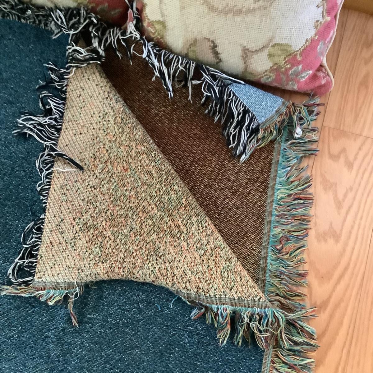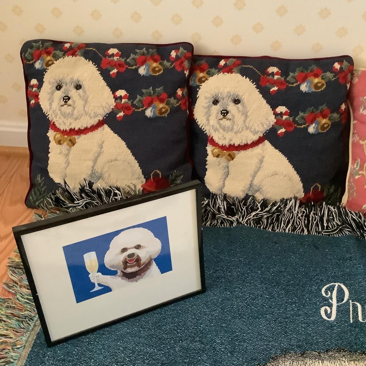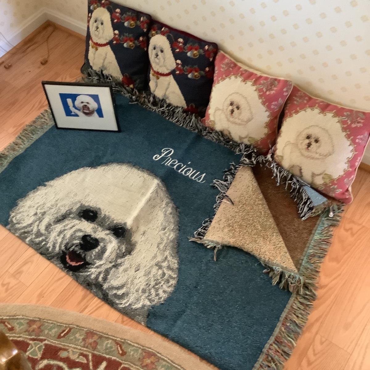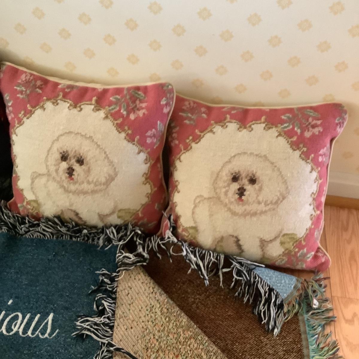 2 sets of needlepoint dog pillows both 14" x 14", dog throw blanket, and small framed dog art.