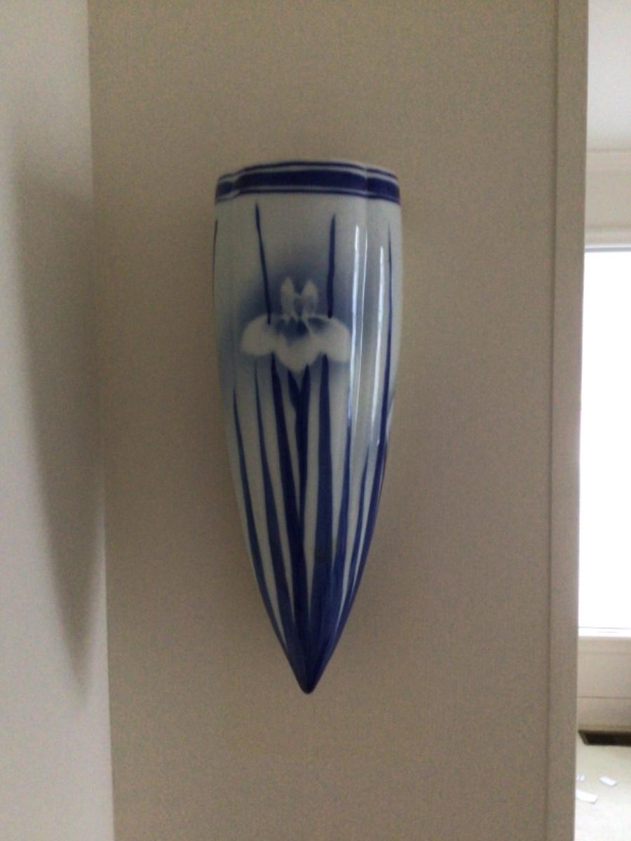 Several pieces of blue and white decorative pottery with wall pocket