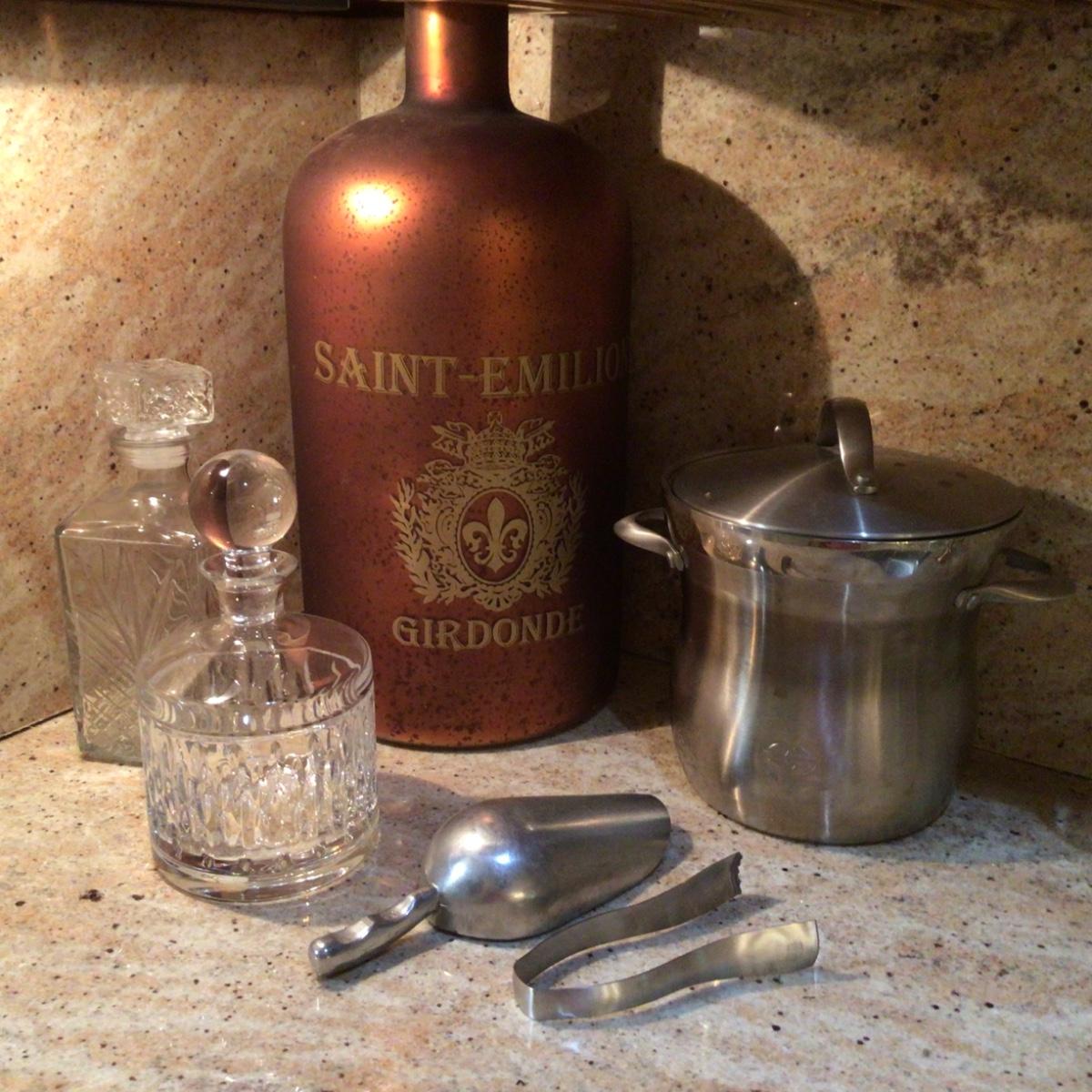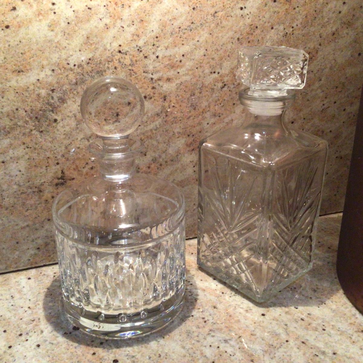 Lot contains 2 decanters, ice bucket with tongs, large decorative bottle.