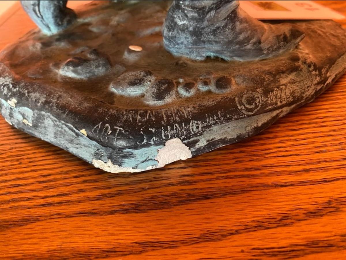 49'er Statue. Possibly plaster. Has makers mark. Chipped around base. 13" x 9"