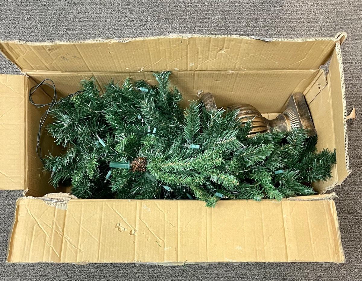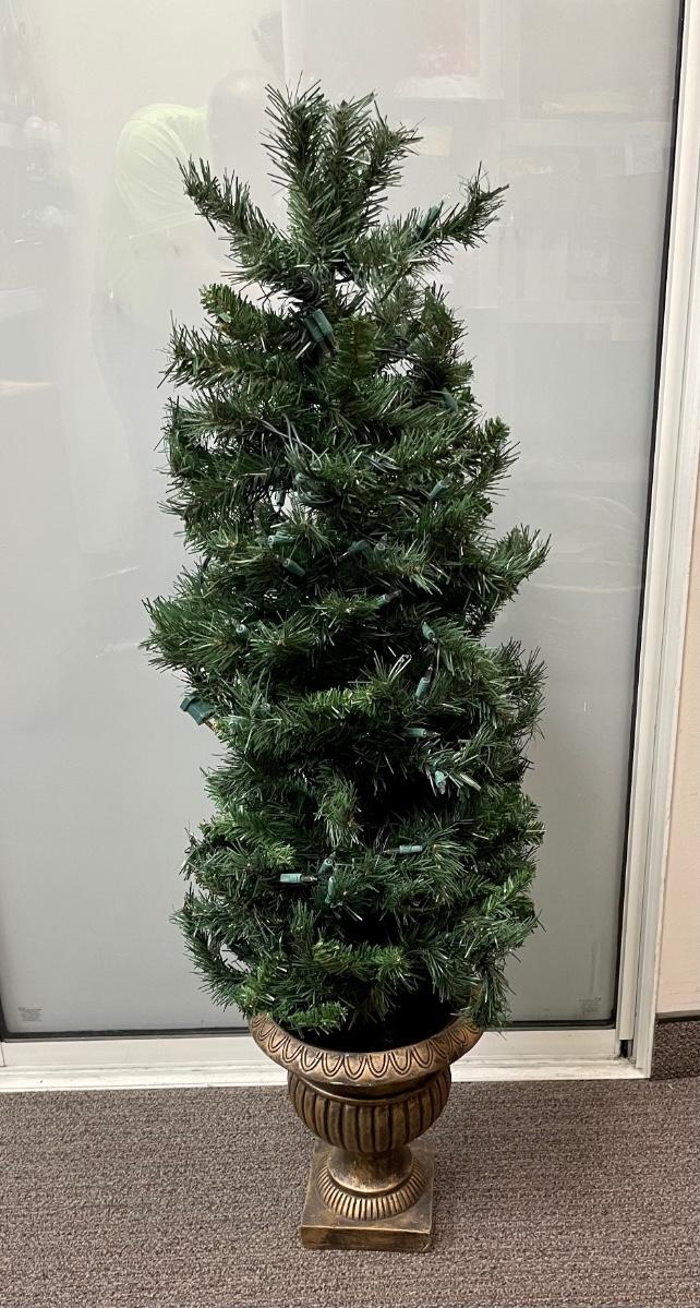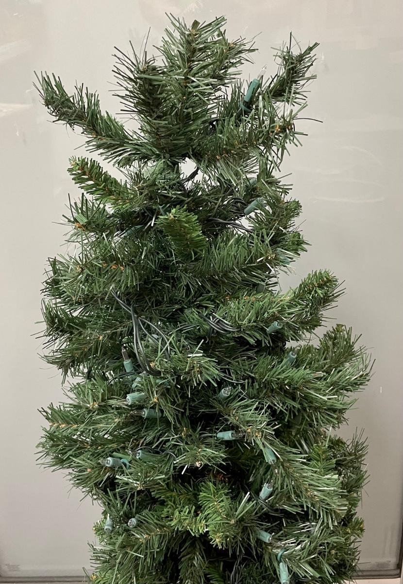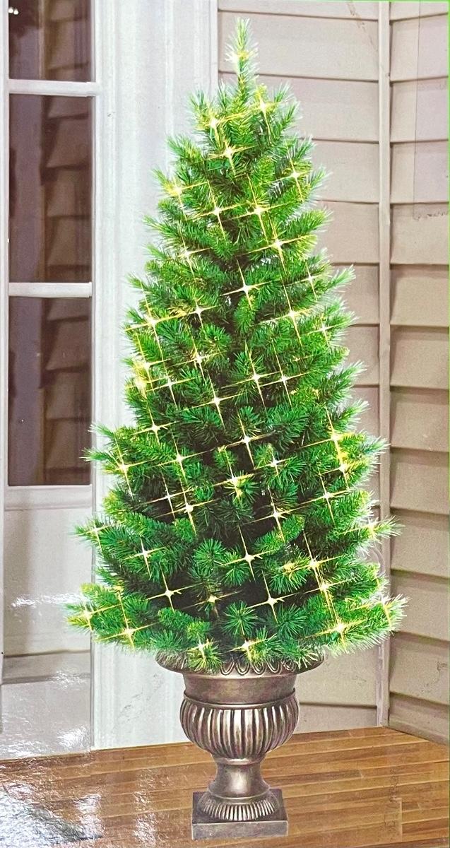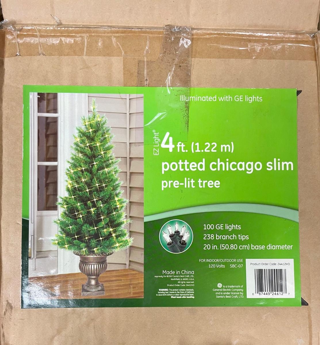 4 foot tall potted Chicago Slim pre-lit Christmas tree. Has 100 white lights. Close-up of packaging photo provided to show detail.