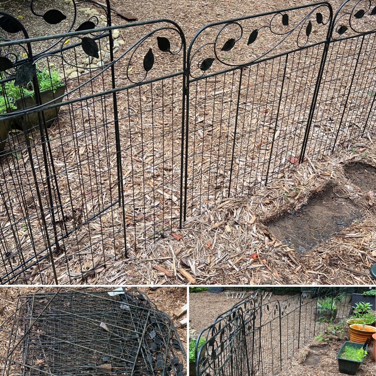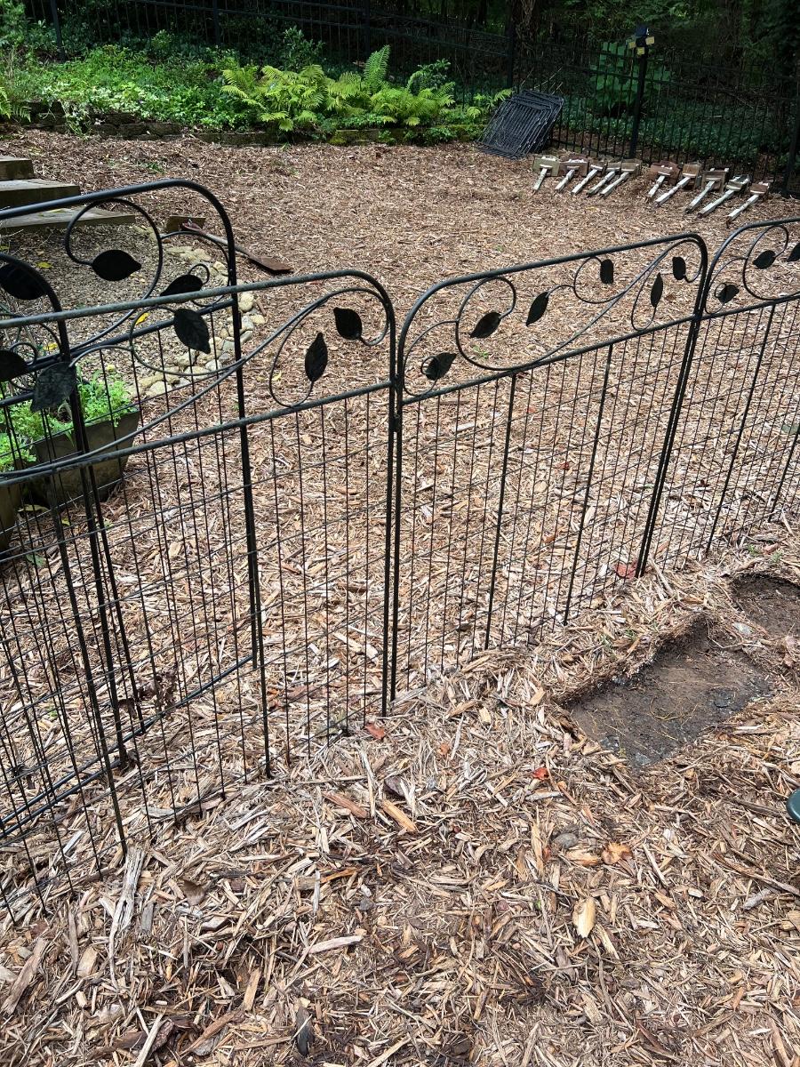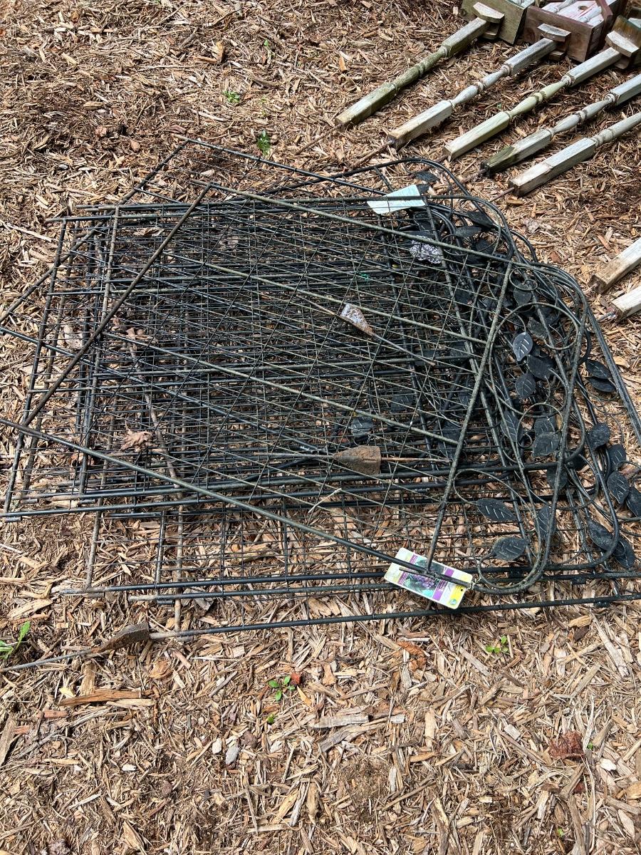 12 panels in total are approximately 3’ x 4’H. Buyer will need to purchase stakes to attach them outdoors as only 2 are included. The panels have mildew and some surface rust and one leaf on one panel has been tied up, see pic.