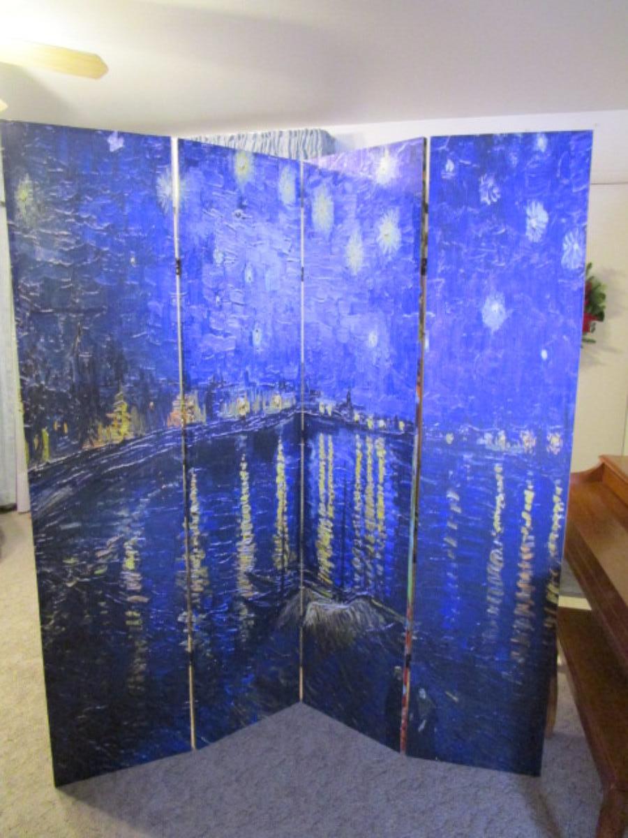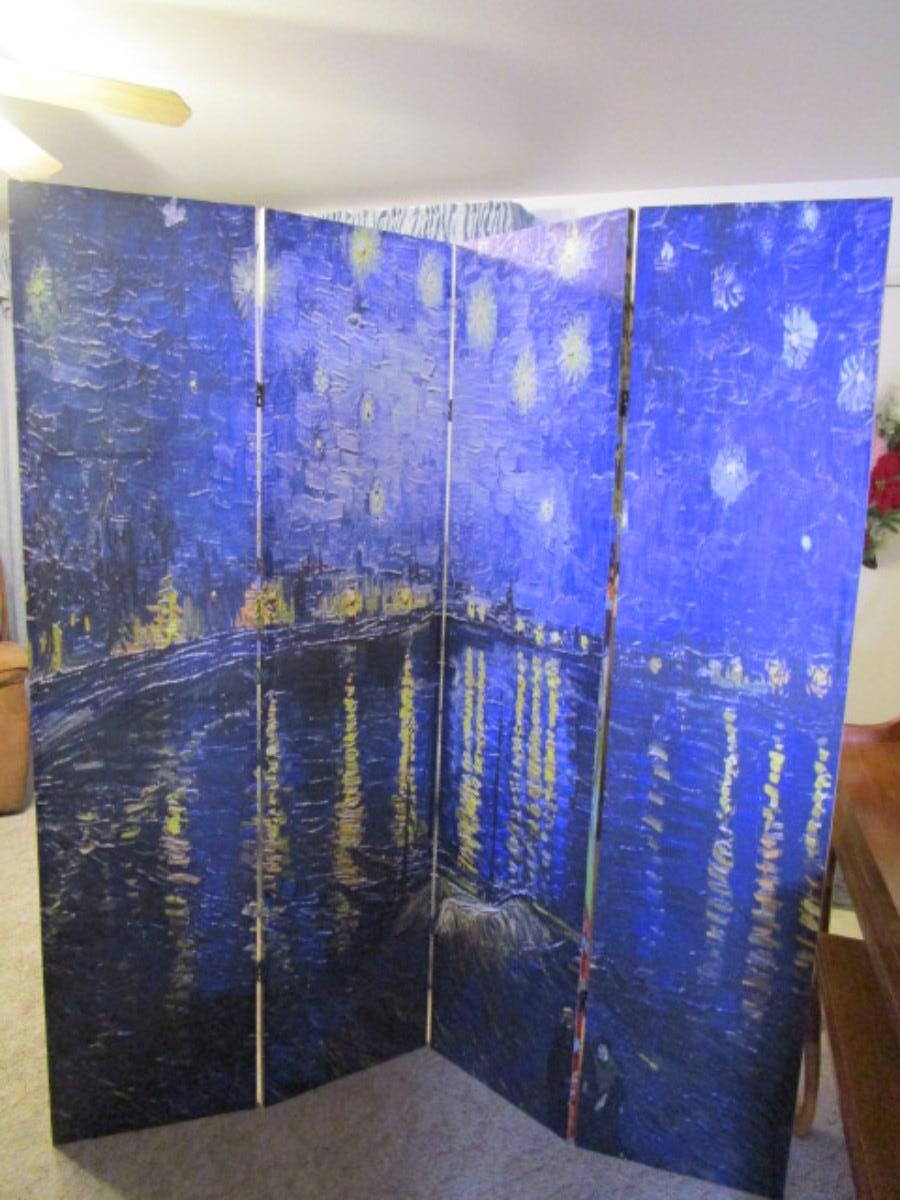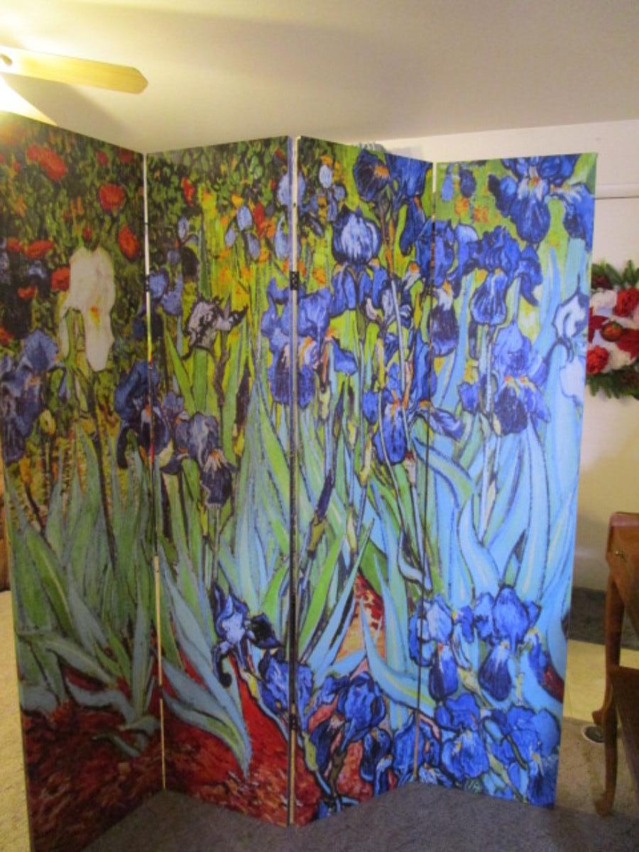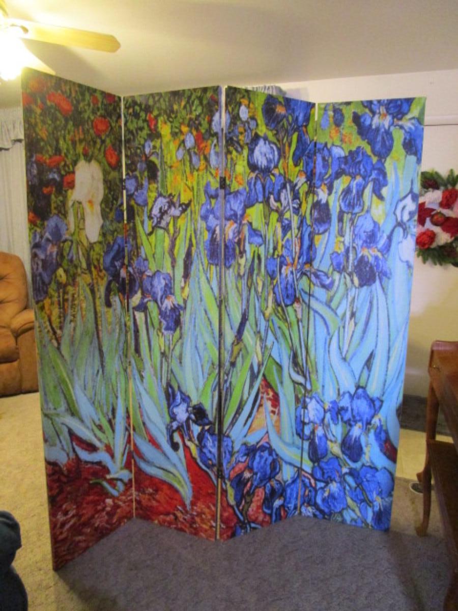 Classic impressionist paintings of Vincent VanGogh, Front is Irises, Back is Starry Night Over the Rhone, 5'11" tall, each panel is 15-3/4" wide