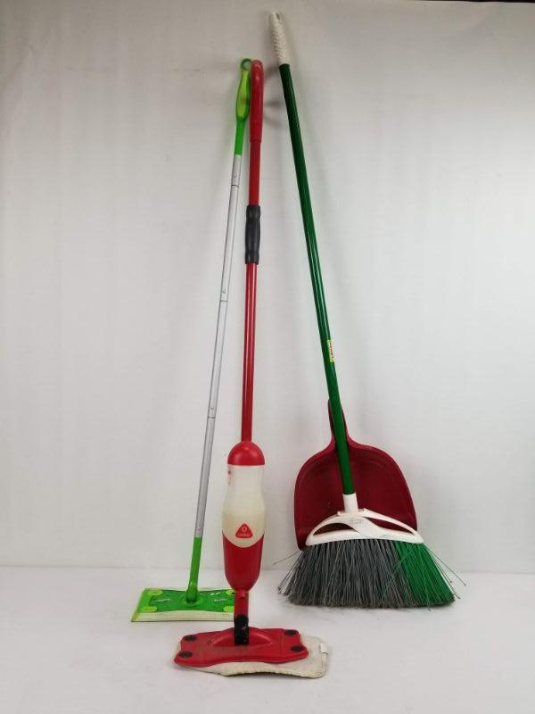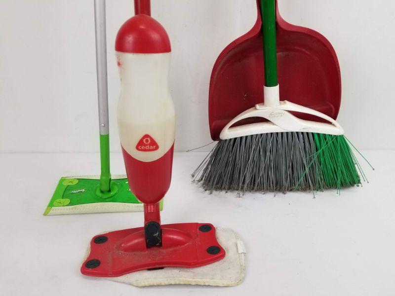 4pc Long-Handled Cleaning Tools Lot: Broom, Dustpan, Wet Mop, Swiffer