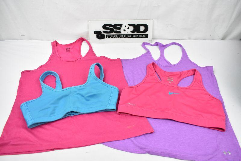 4pc Women's Active Wear sz XL: Nike Pink Bra & Top, Turquoise Bra, UA Purple Top