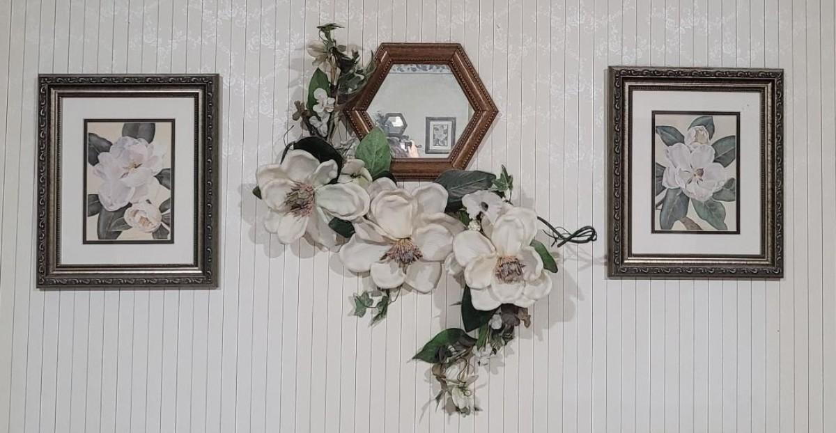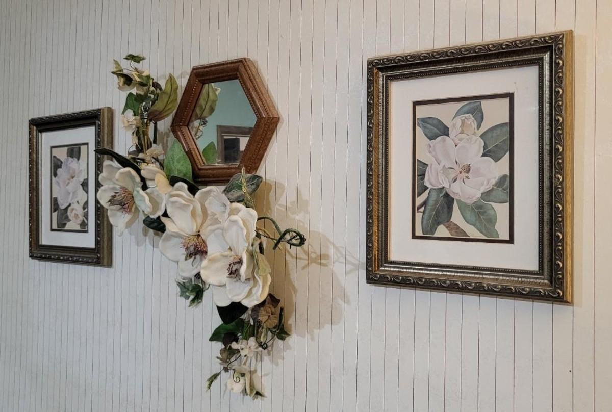 This lot includes 1 magnolia floral swag, 1 wood framed hexagonal mirror, and 2 framed Magnolia mages--pieces can be separated and/or arranged however you like!
