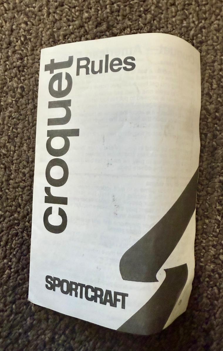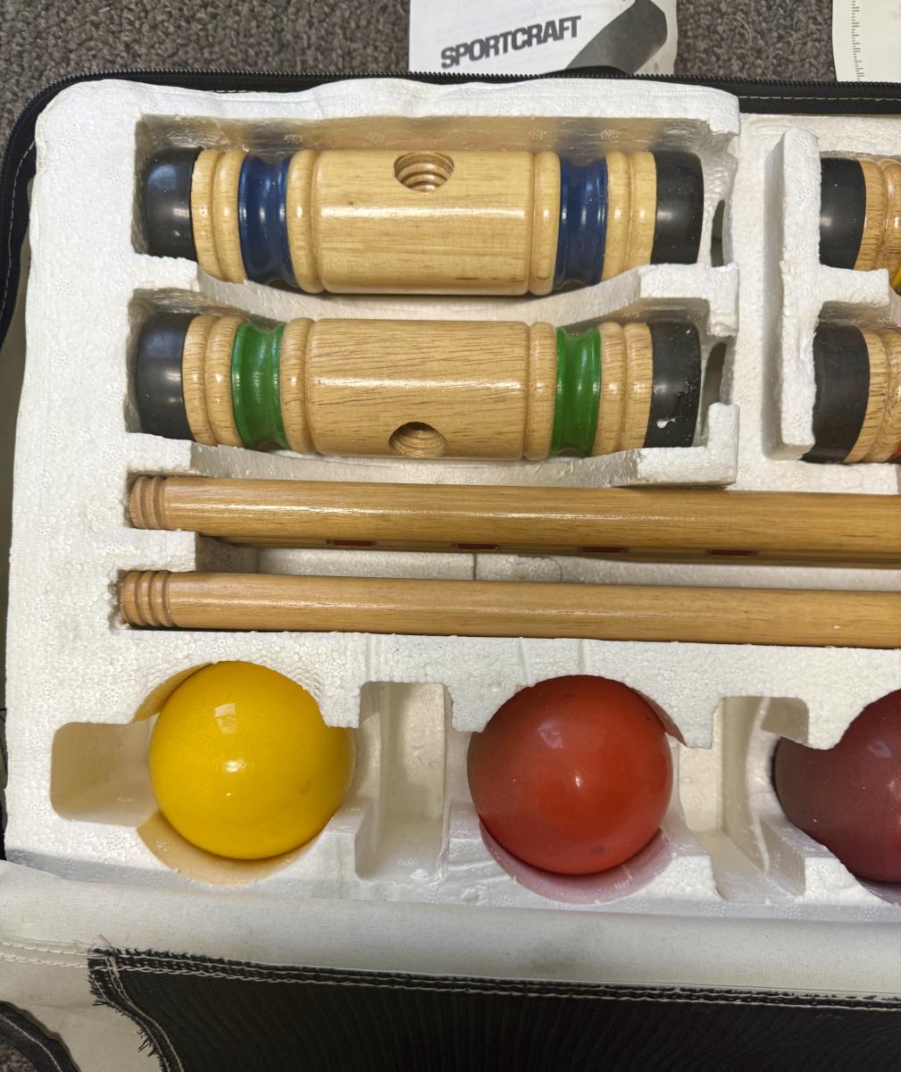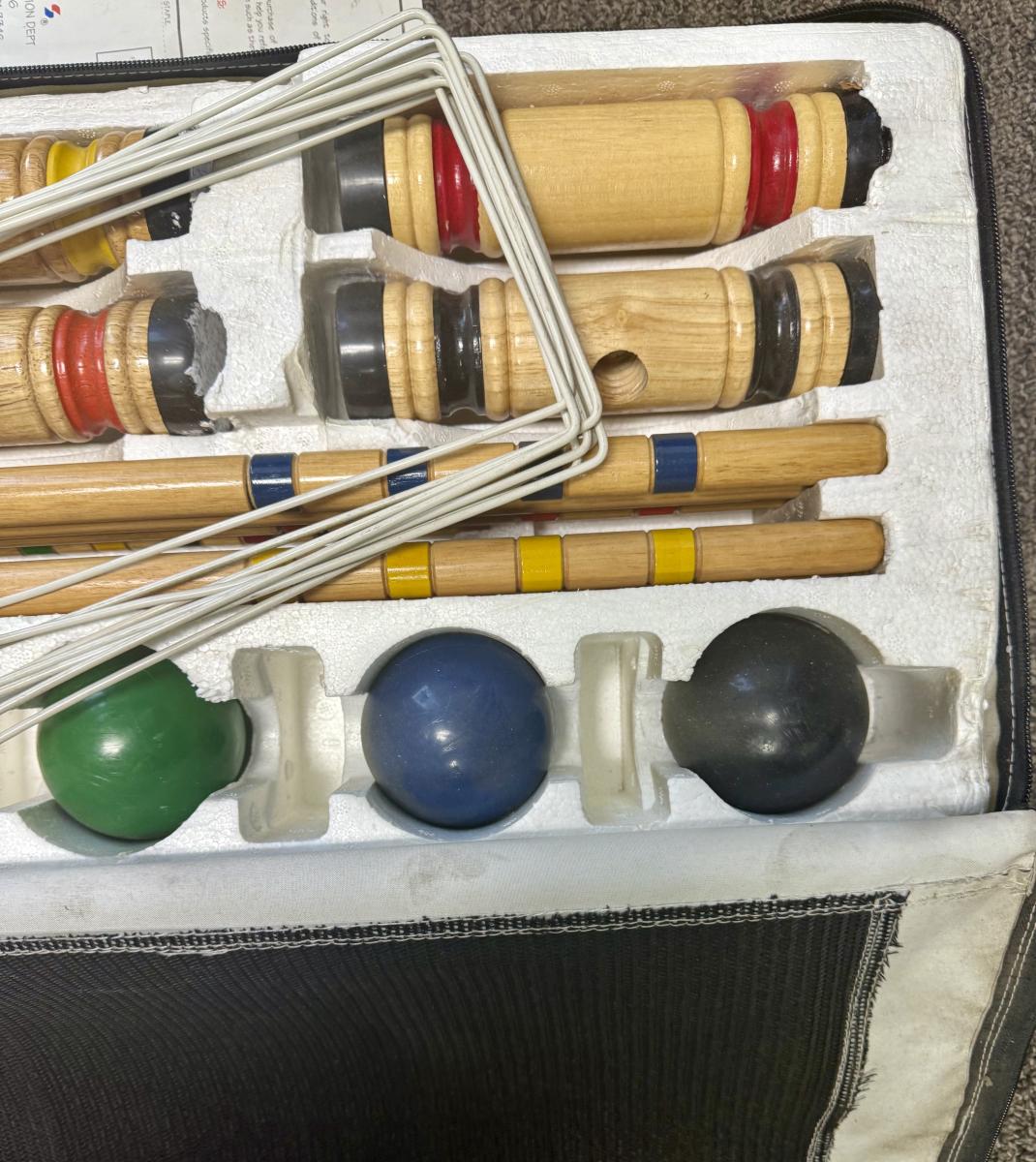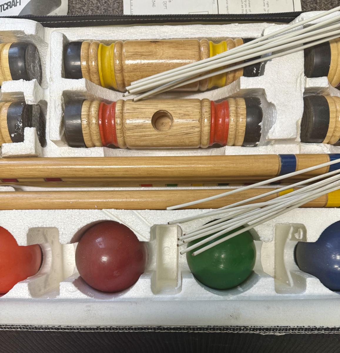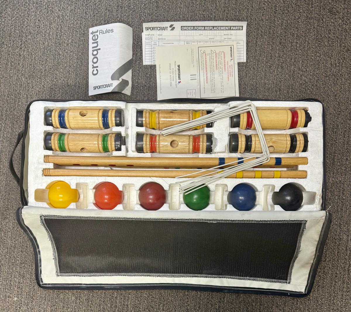 Made by Sportcraft, in near-new condition. 6 mallets, 6 balls, and a set of white wire wickets in a zippered storage case.