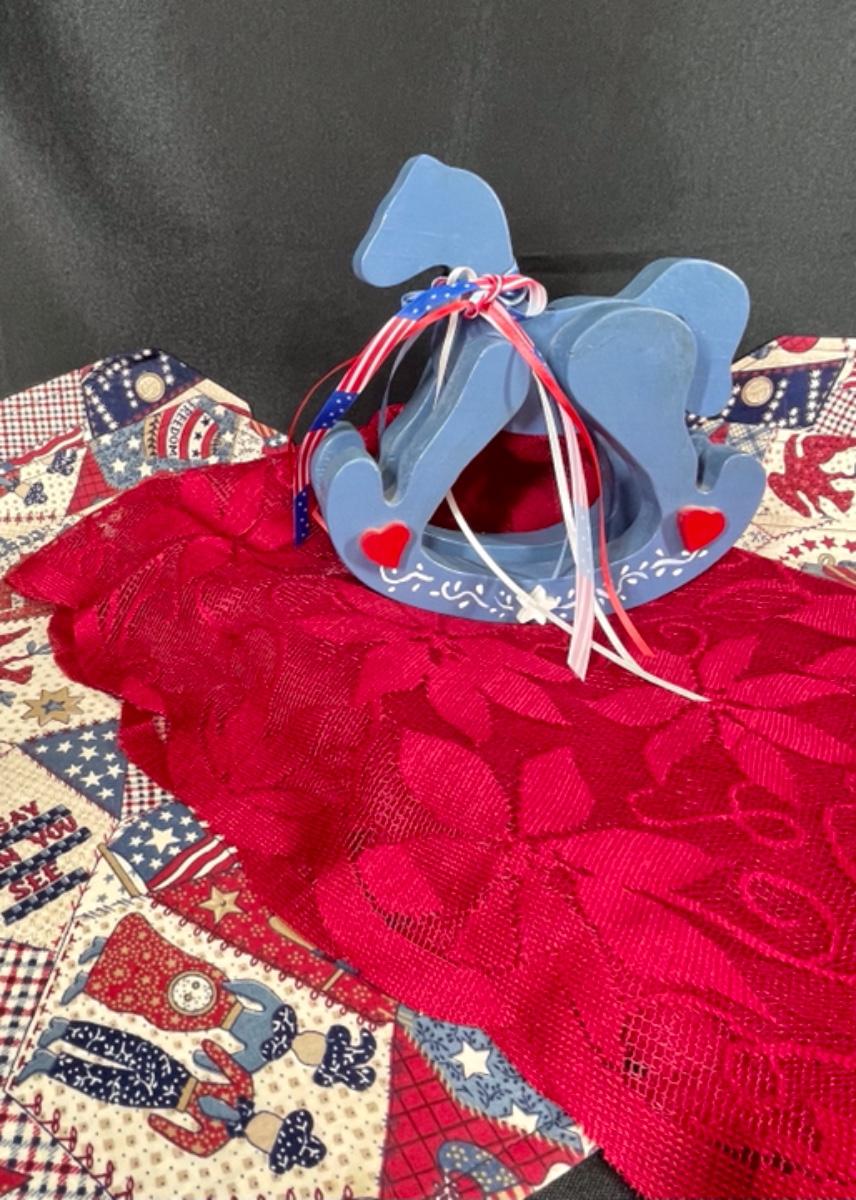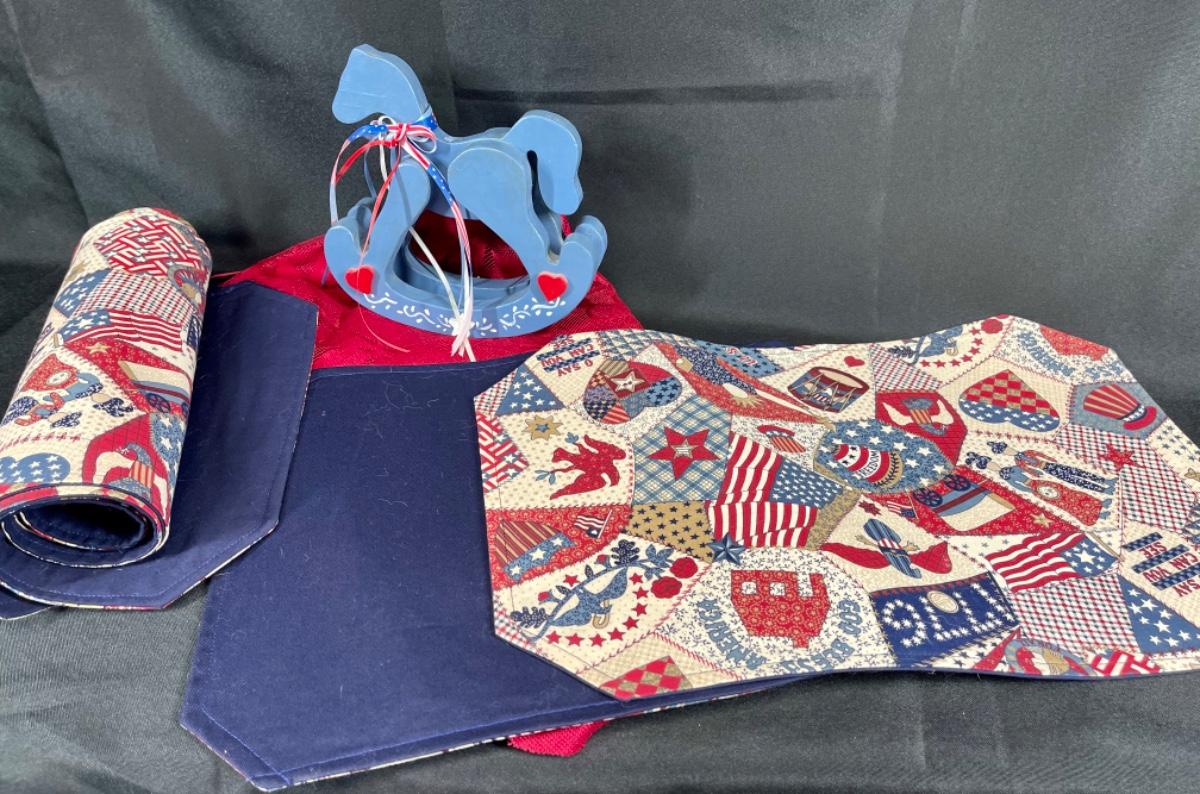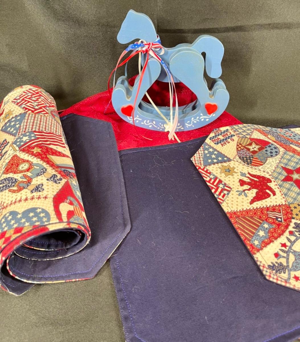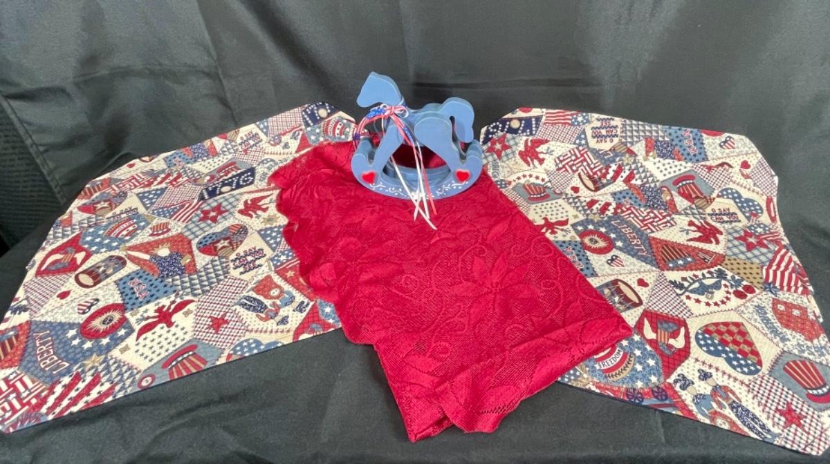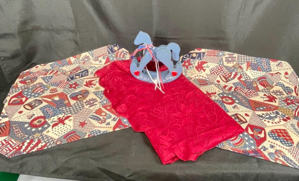 Red, white , and blue table linen. Red lace table cloth and placemats. May have light spots, but in good previously owned condition.