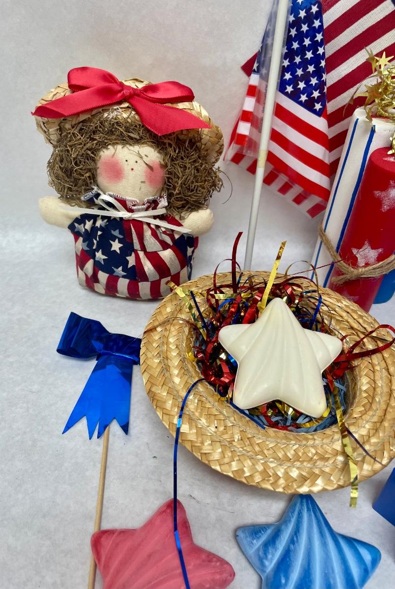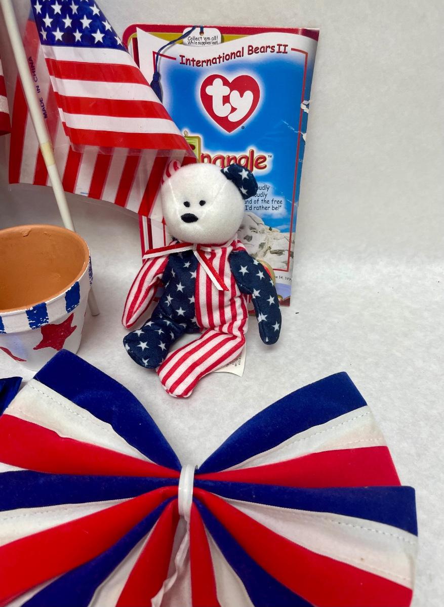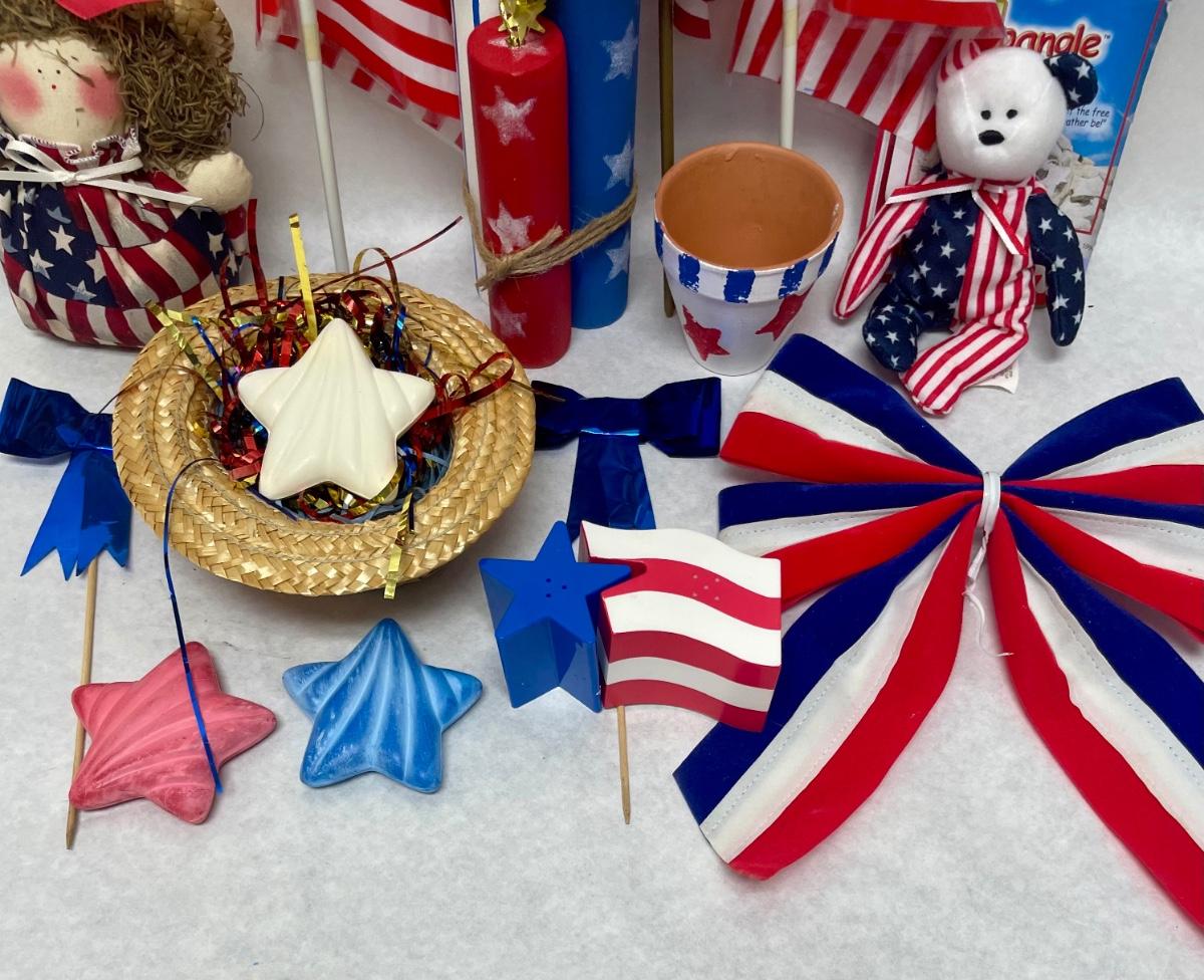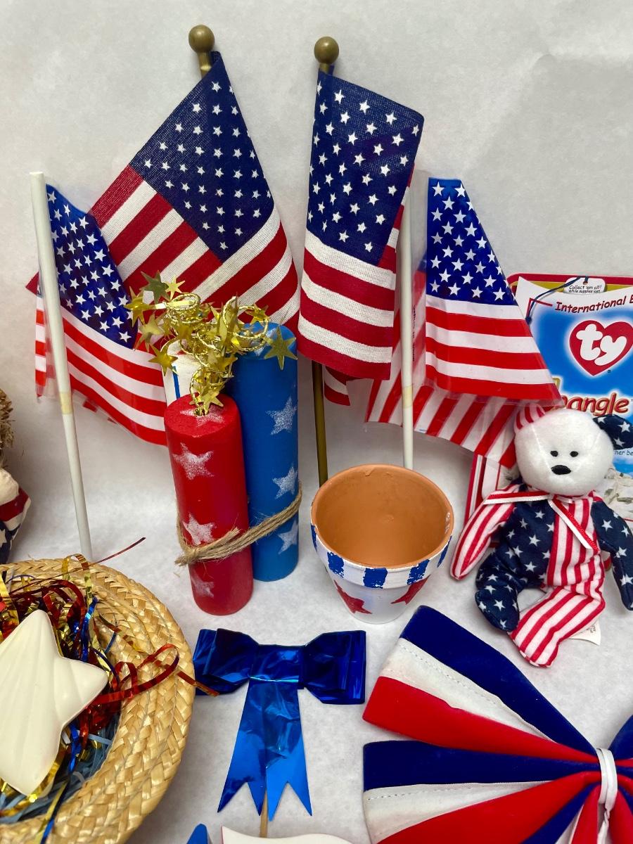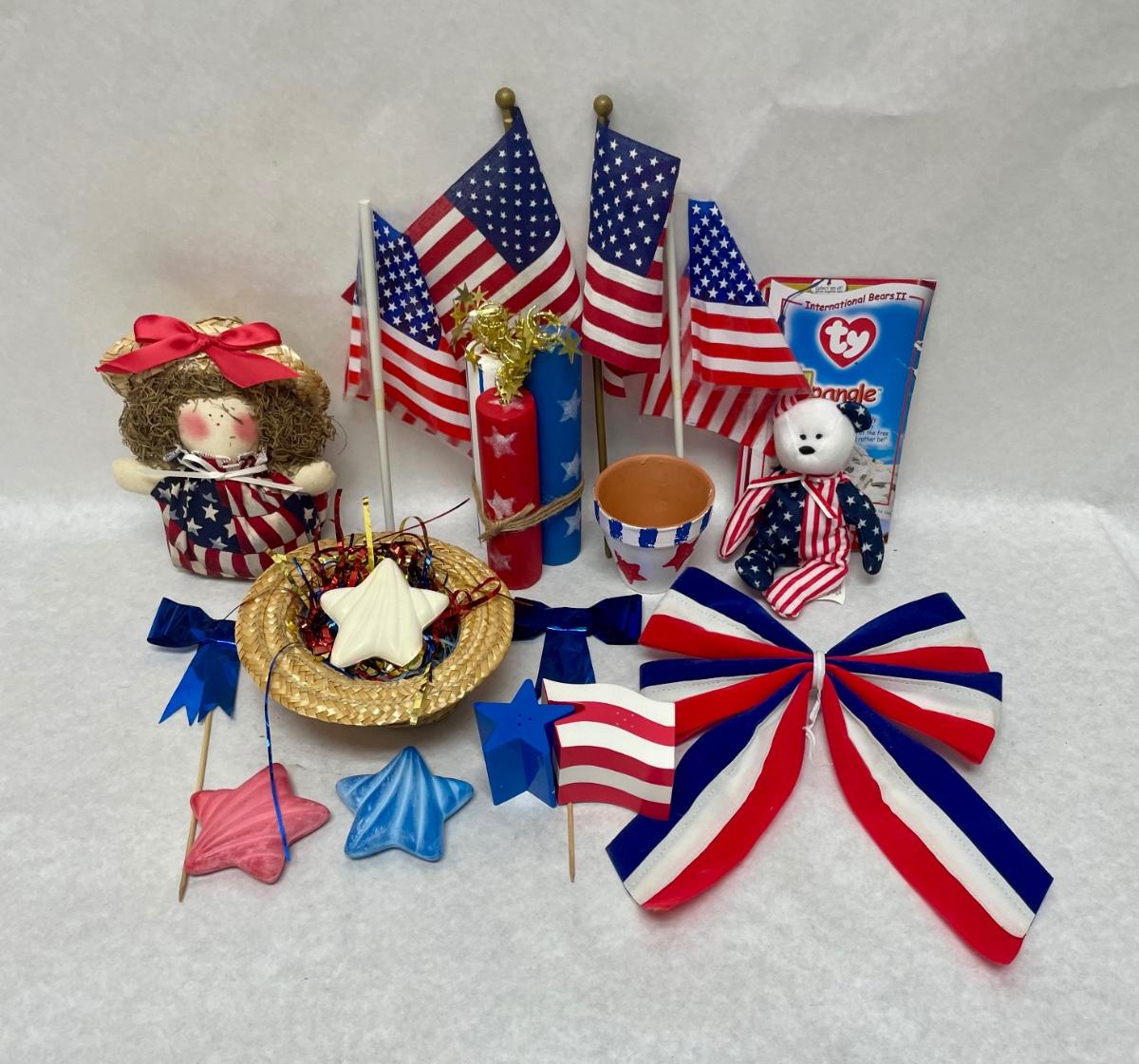 Includes items in picture: several American flags, patriotic beanie baby plush, red, white & blue wax stars, red/white/blue firecracker centerpiece, decorated mini clay pot, straw hat with red & blue "straw", and several multi-color ribbons.